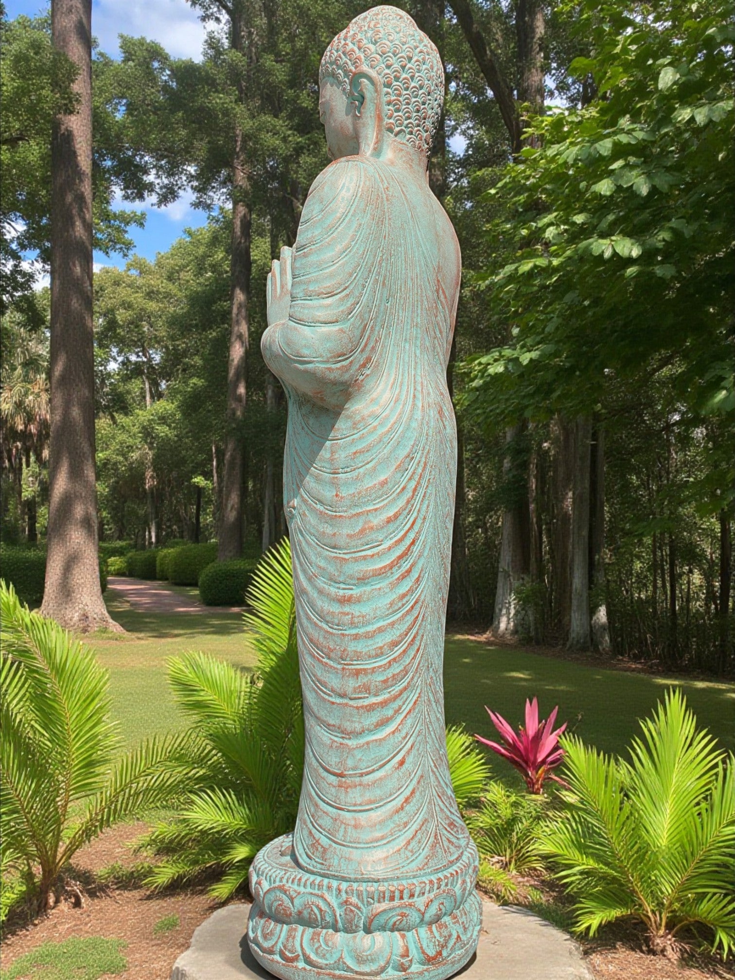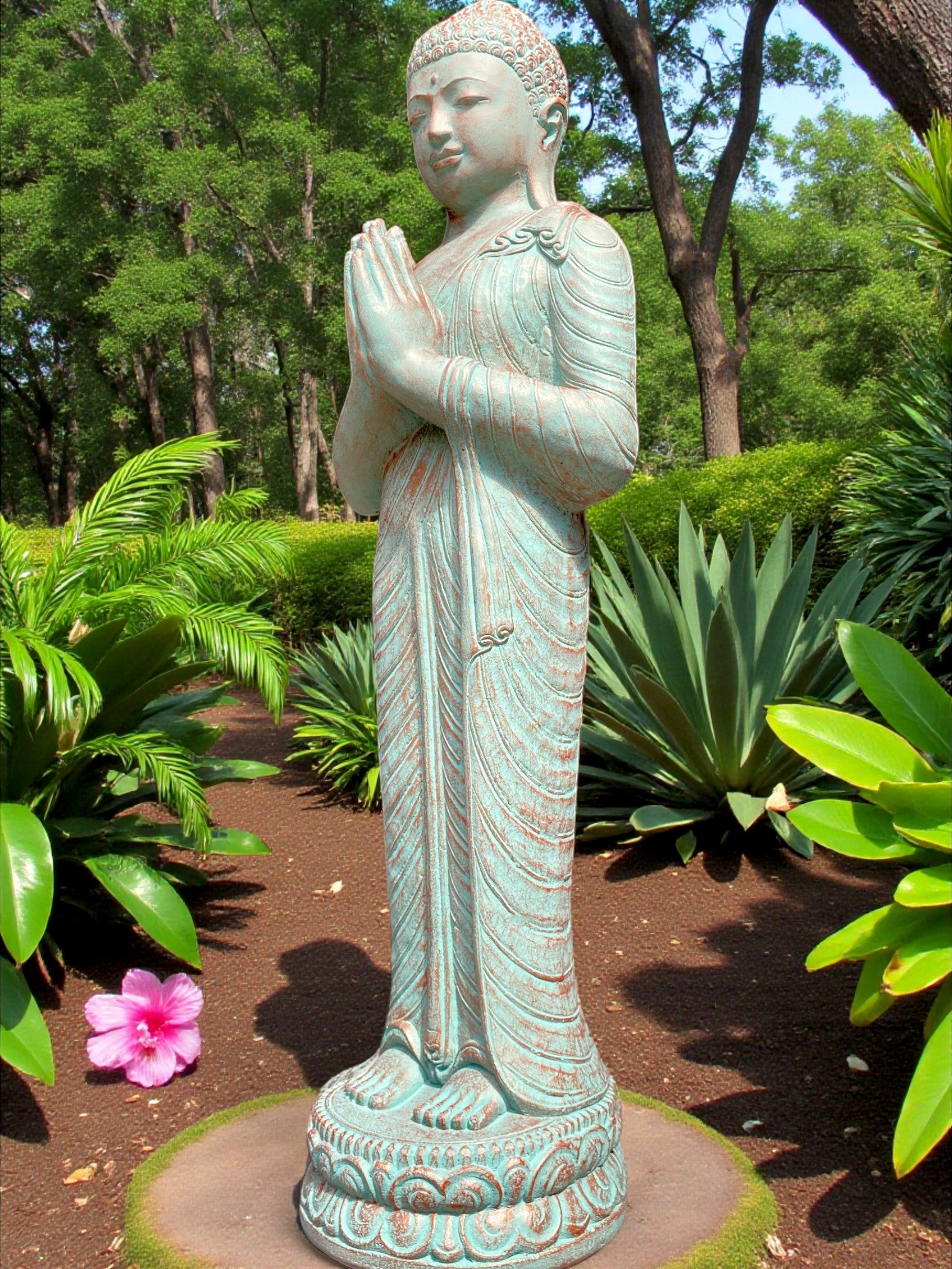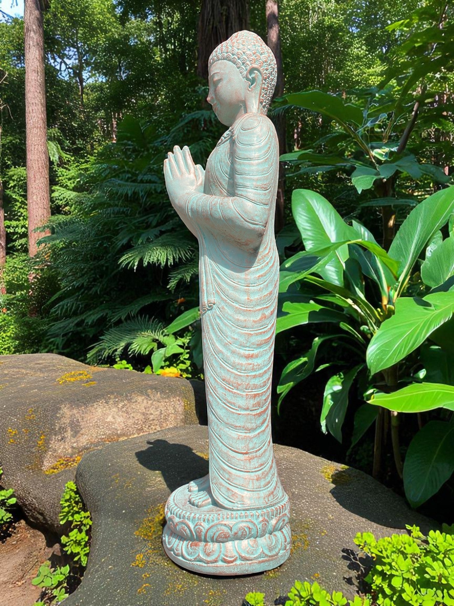 Each piece is meticulously finished by local artisans. This timeless statue brings a sense of peace and harmony to your outdoor setting. For added ambience, place a soft light at the base to highlight its contours and create a warm, tranquil glow at night.