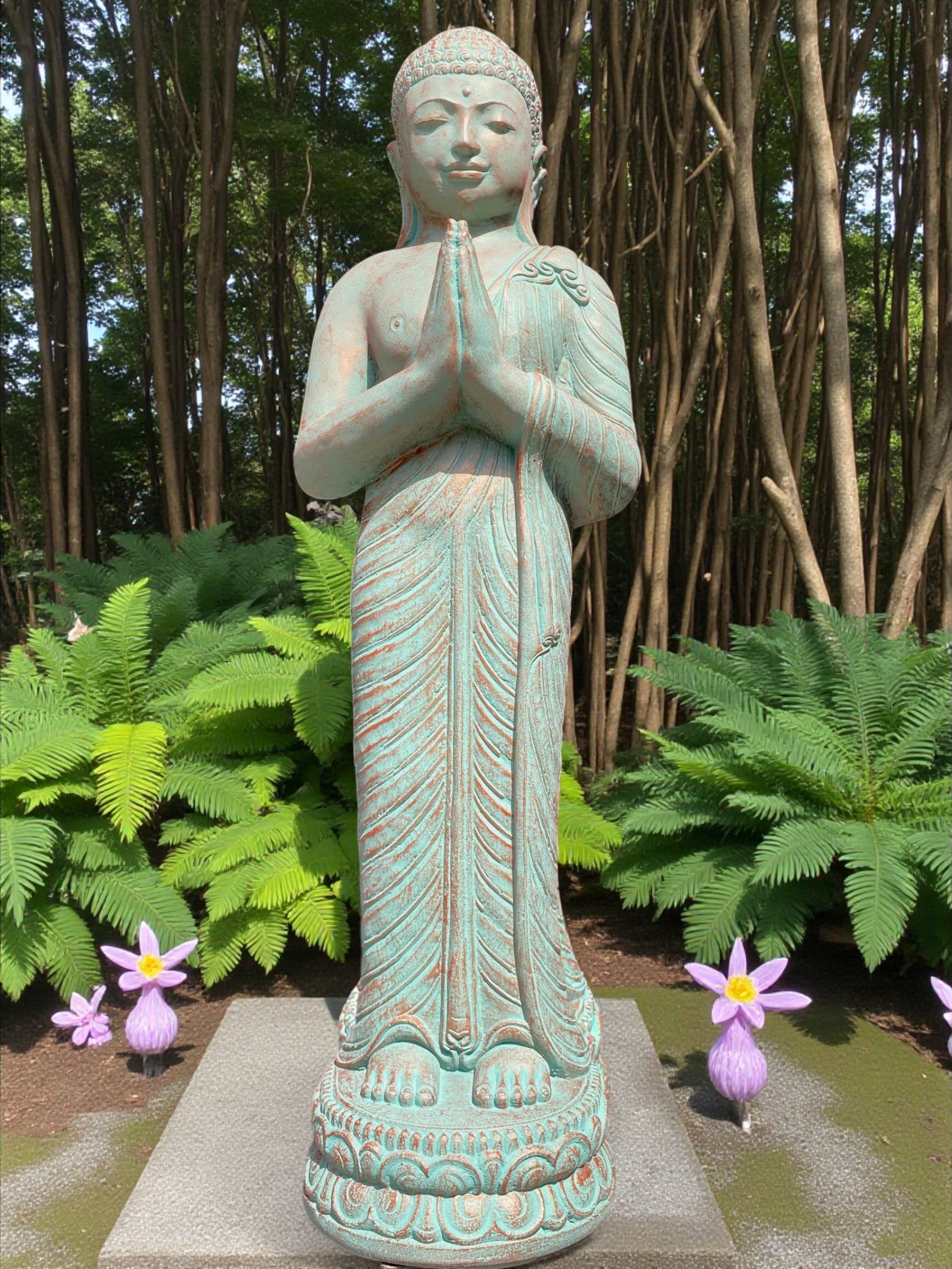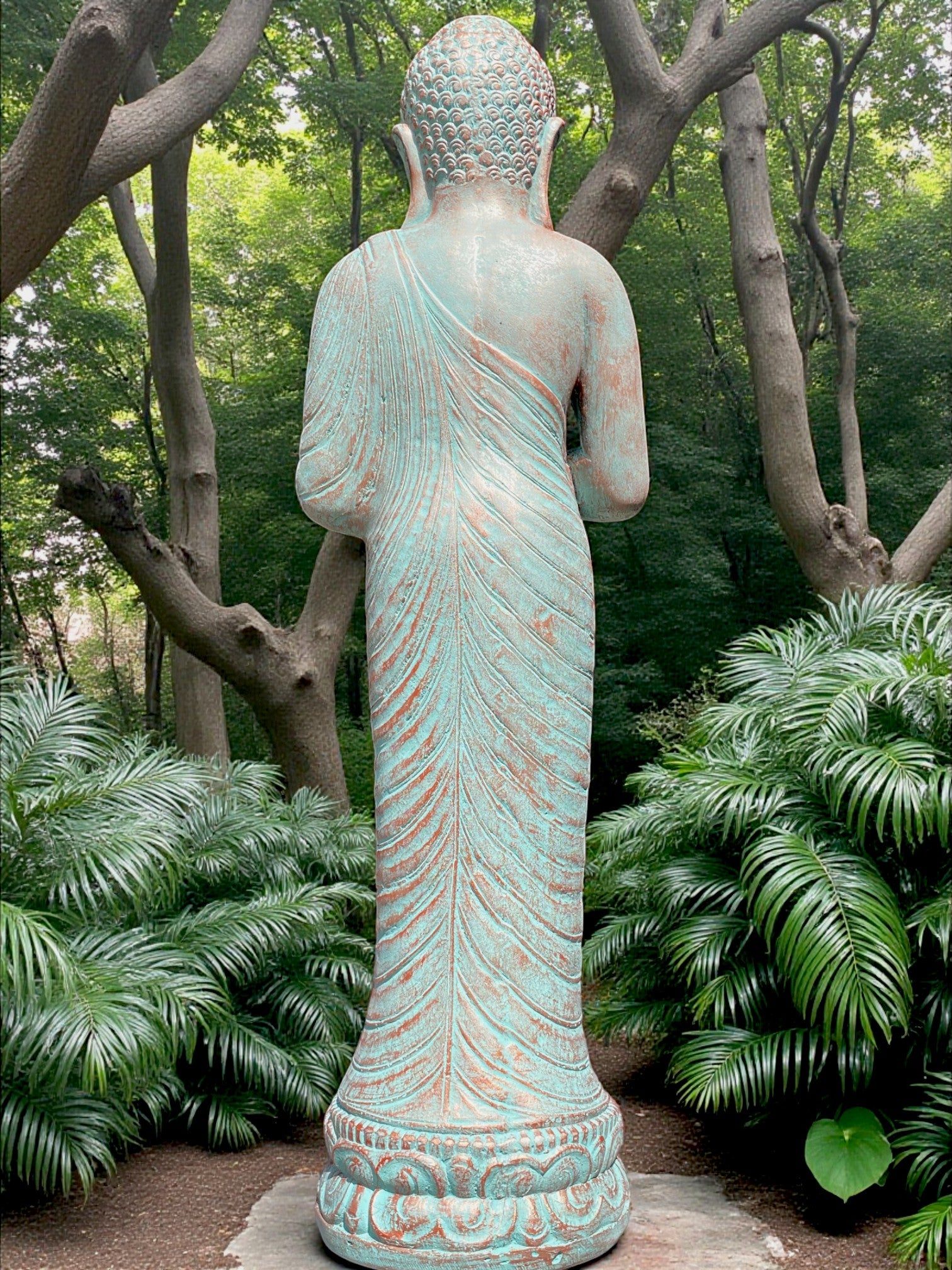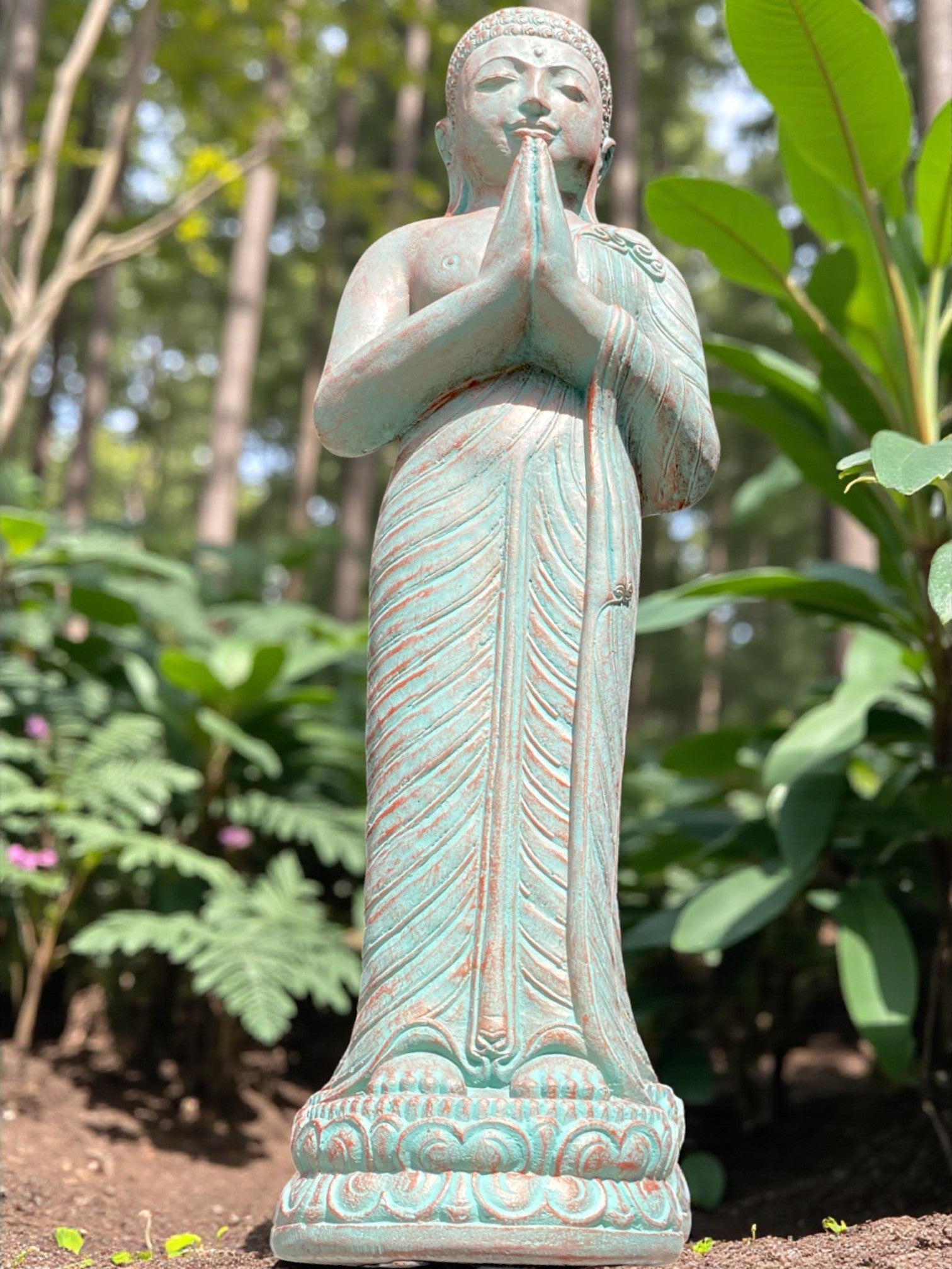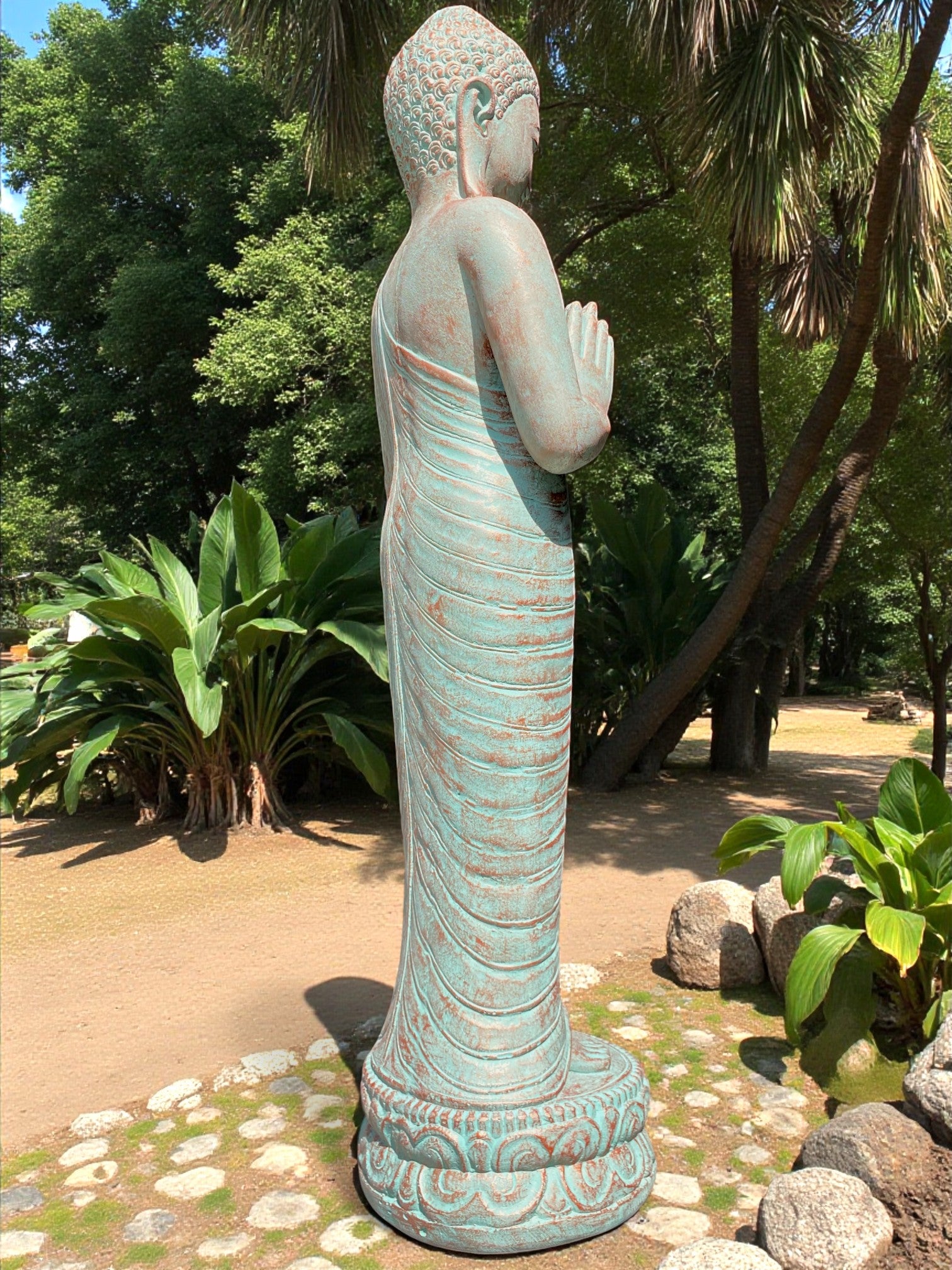 Each piece is meticulously finished by local artisans. This timeless statue brings a sense of peace and harmony to your outdoor setting. For added ambience, place a soft light at the base to highlight its contours and create a warm, tranquil glow at night.