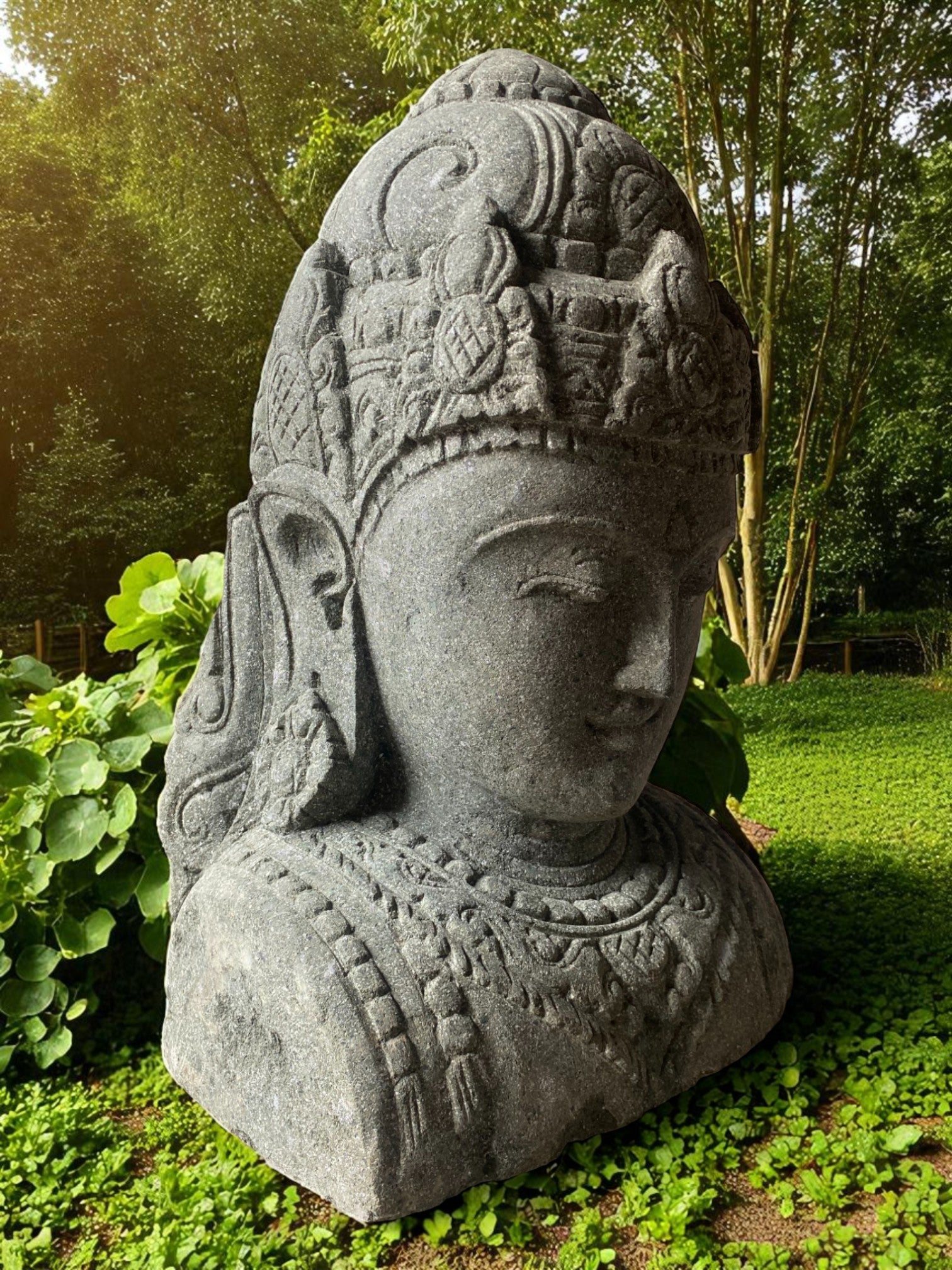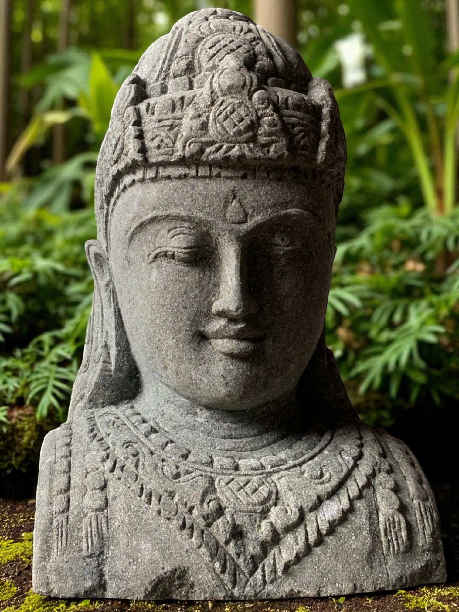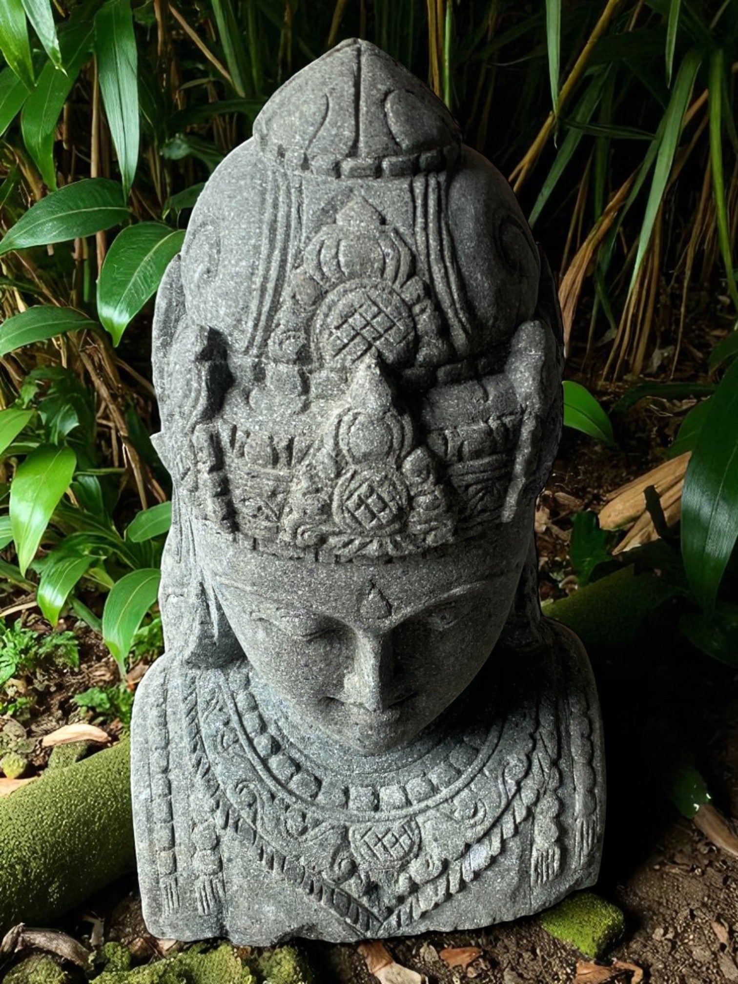 Hand carved Balinese Buddha statue. "Dewi Lakshmi" goddess of wealth, fortune & prosperity. Complement your garden landscaping and Outdoor Living with a fully carved from Indonesian Greenstone . Used by landscape architects for outdoor garden and landscaping projects. This is a hand carved Indonesian greenstone piece of art. These look great with a warm white night light mounted at the base of the statue facing upwards, creating shadows and ambience and compliments your outdoor furniture and garden landscaping. Upgrade your garden and landscaping and add value to your home and garden renovation.