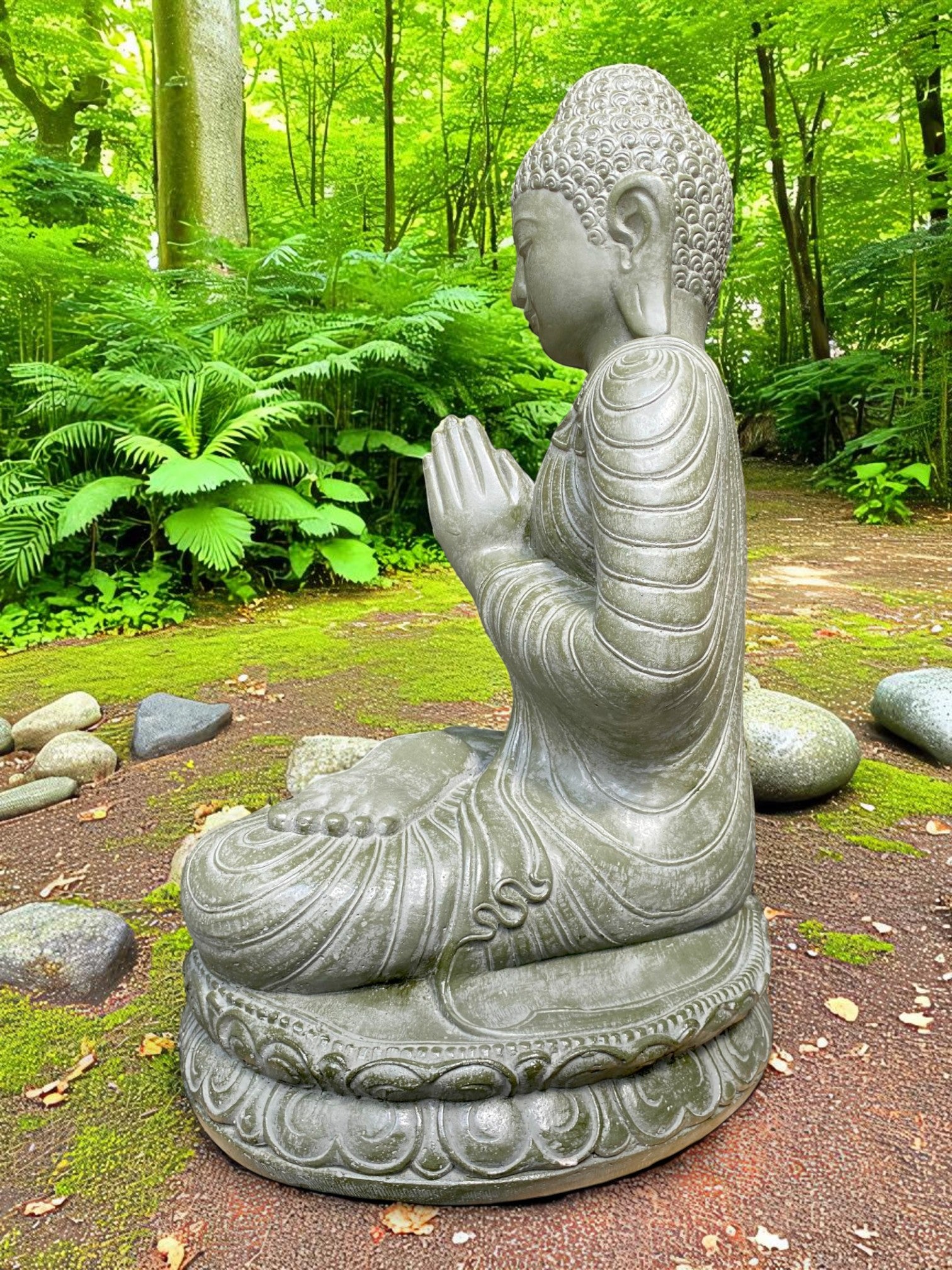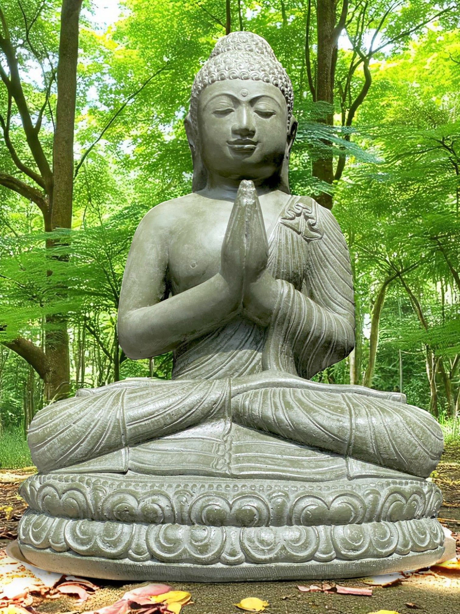 Balinese Praying Buddha statue with front and rear detail. Complement your garden landscaping and Outdoor Living with a Praying or Greeting Buddha Statue . Used by landscape architects for outdoor garden and landscaping projects. This statue fits nicely into any garden. These look great with a warm white night light mounted at the base of the statue facing upwards, creating shadows and ambience and compliments your outdoor furniture and garden landscaping. Upgrade your garden and landscaping and add value to your home and garden renovation. Solid Concrete is a great cost effective alternative option for budget Sensitive projects as opposed to luxury hand carved stone.