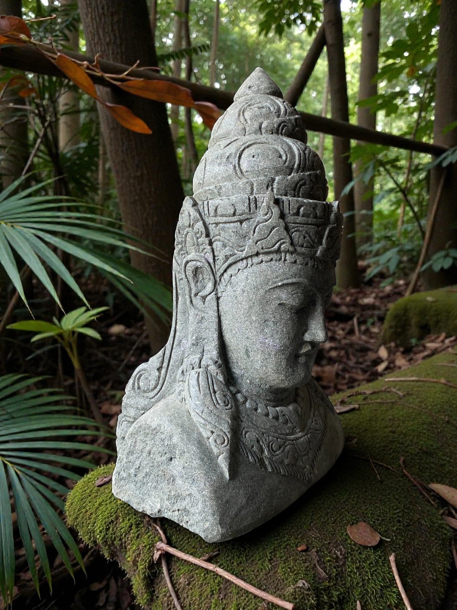 Hand carved Balinese Buddha statue. "Dewi Lakshmi" goddess of wealth, fortune & prosperity. Complement your garden landscaping and Outdoor Living with a fully carved from Indonesian Greenstone . Used by landscape architects for outdoor garden and landscaping projects. This is a hand carved Indonesian greenstone piece of art. These look great with a warm white night light mounted at the base of the statue facing upwards, creating shadows and ambience and compliments your outdoor furniture and garden landscaping. Upgrade your garden and landscaping and add value to your home and garden renovation.