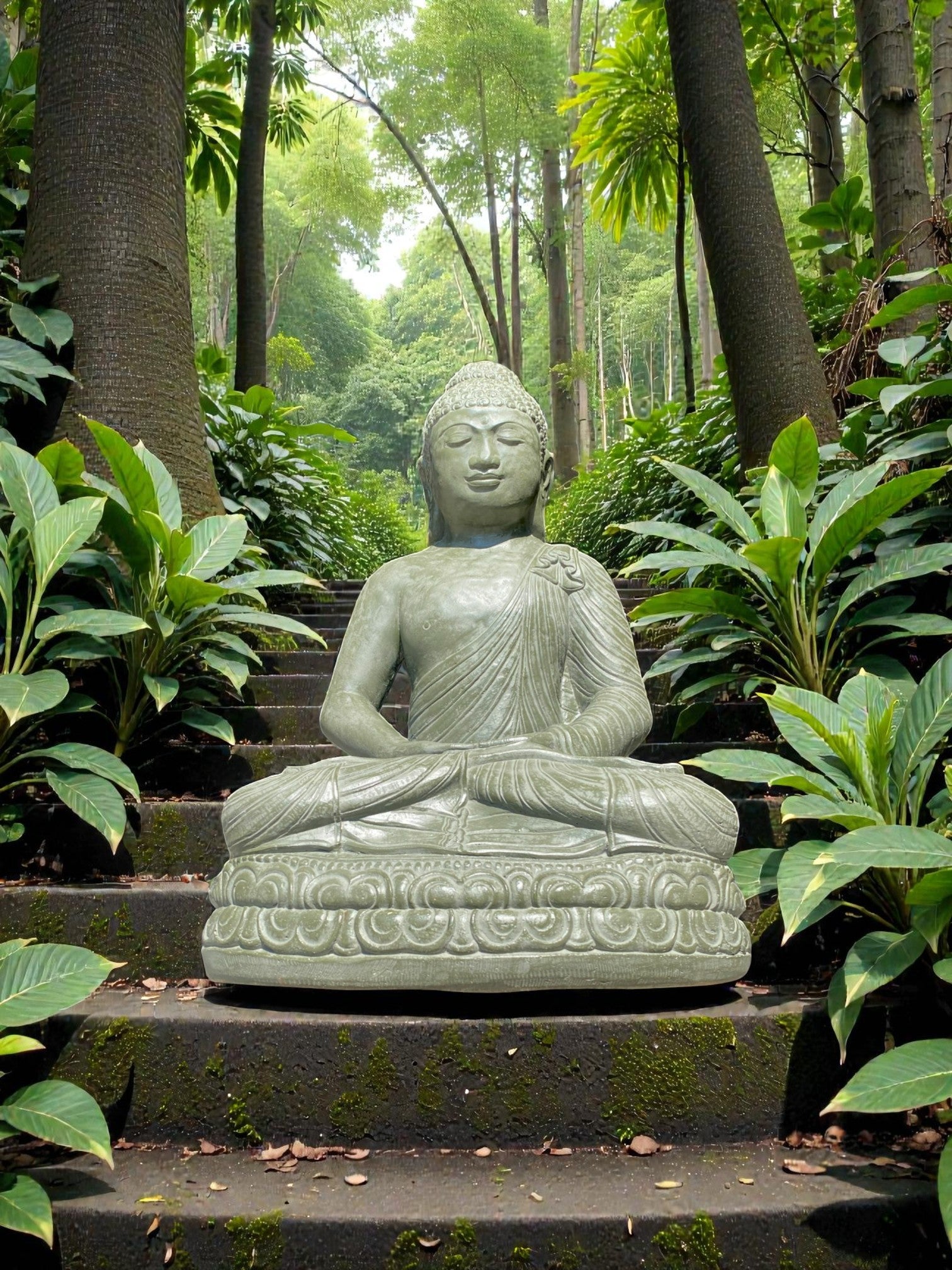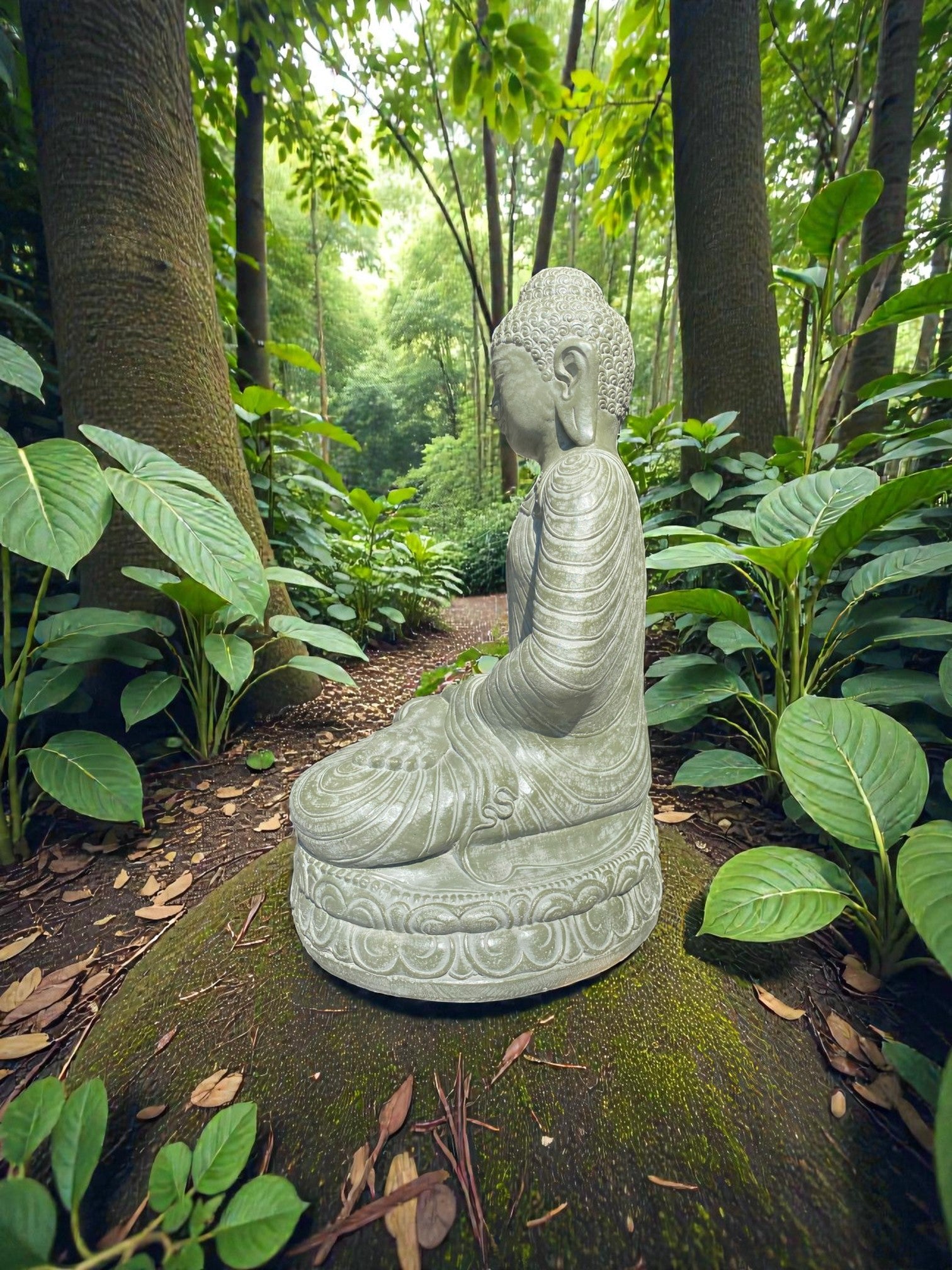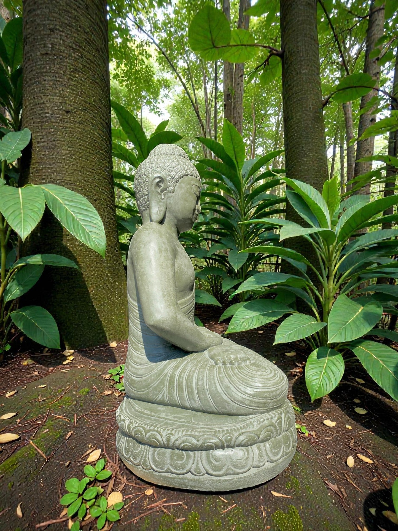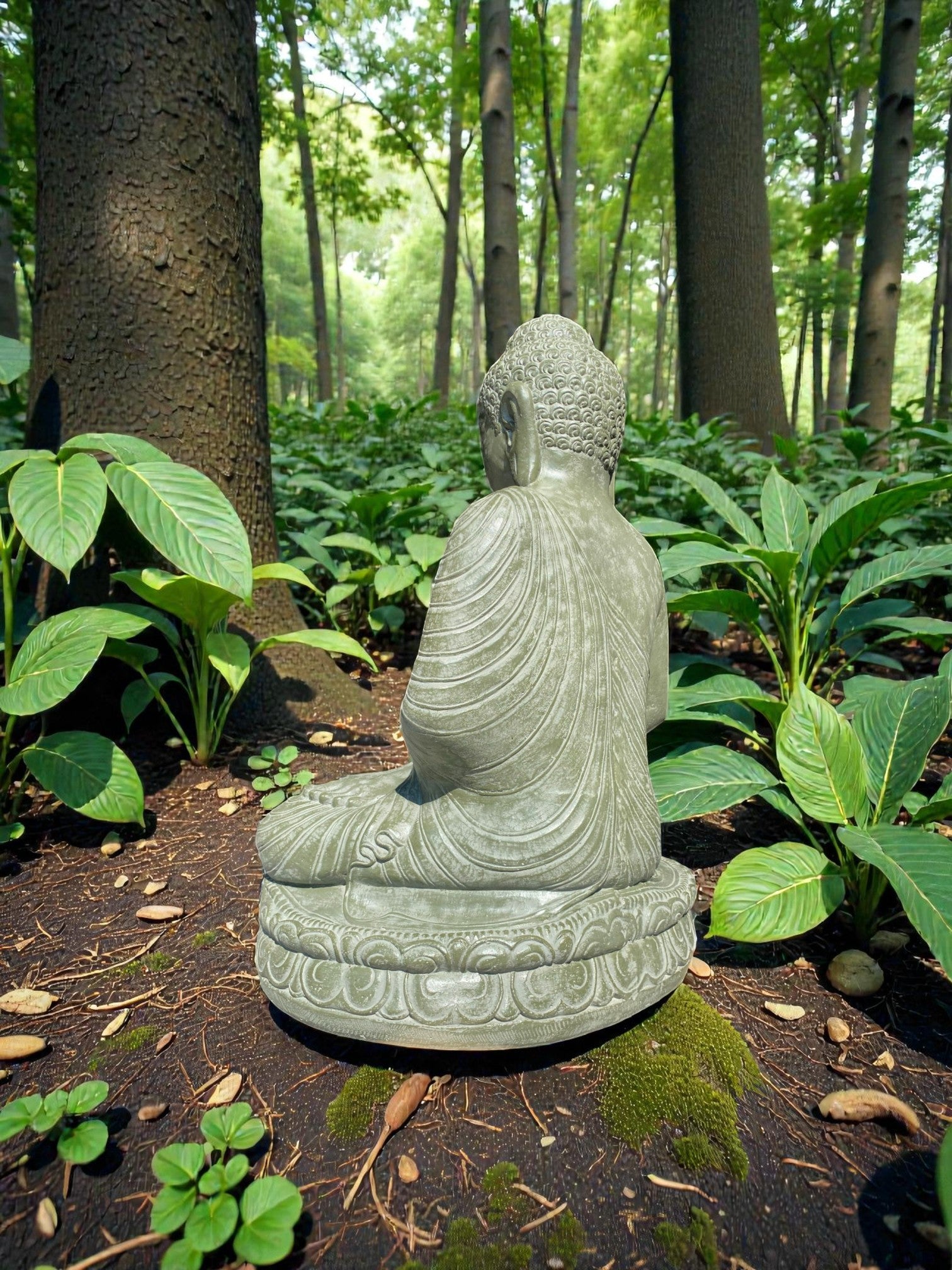 Balinese Dhyana Mudra Buddha statue symbolising wisdom. Front and rear detail. Complement your garden landscaping and Outdoor Living with a  Buddha Statue . Used by landscape architects for outdoor garden and landscaping projects. This statue fits nicely into any garden. These look great with a warm white night light mounted at the base of the statue facing upwards, creating shadows and ambience and compliments your outdoor furniture and garden landscaping. Upgrade your garden and landscaping and add value to your home and garden renovation. Solid Concrete is a great cost effective alternative option for budget Sensitive projects as opposed to luxury hand carved stone.