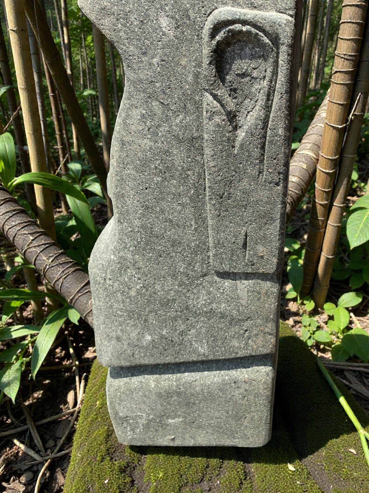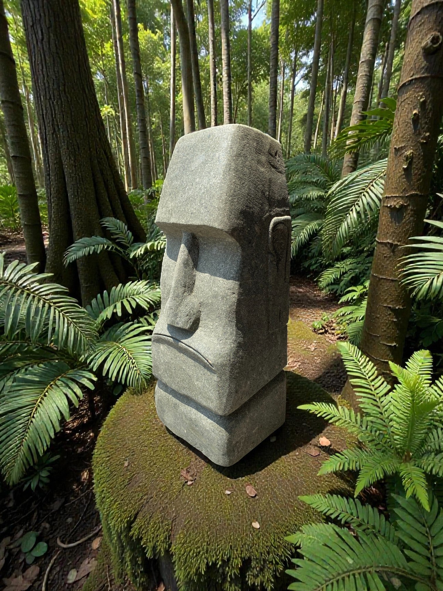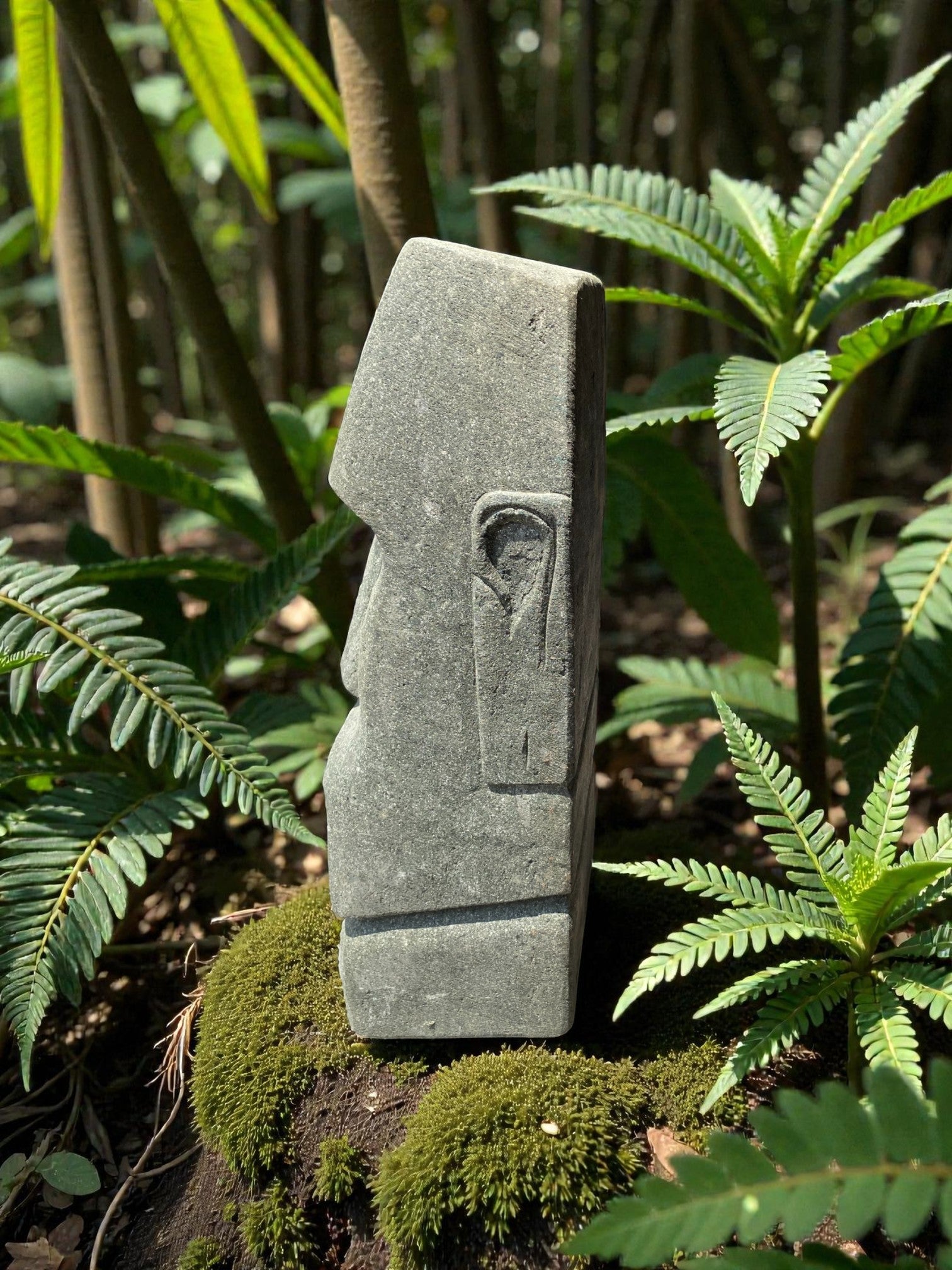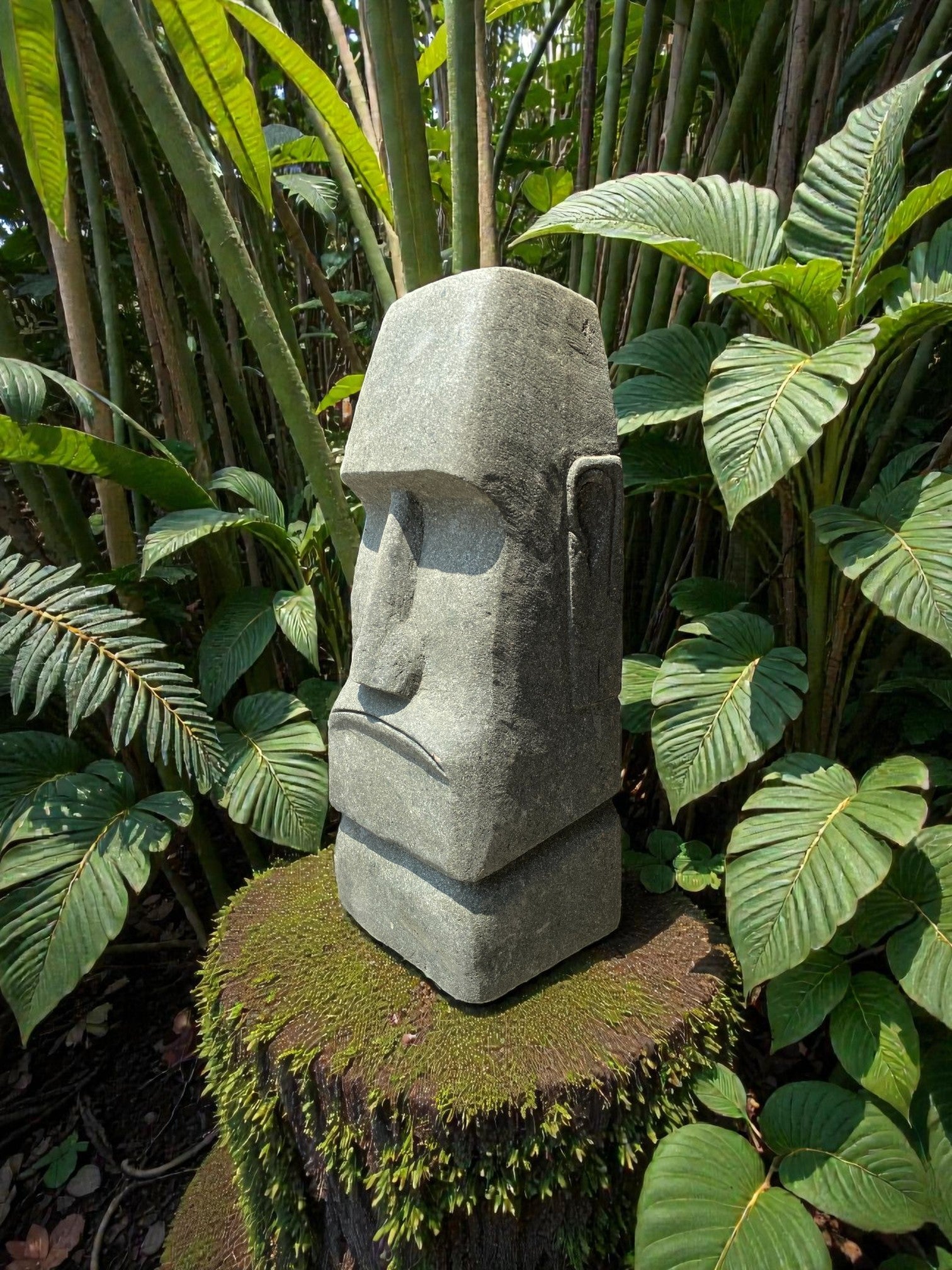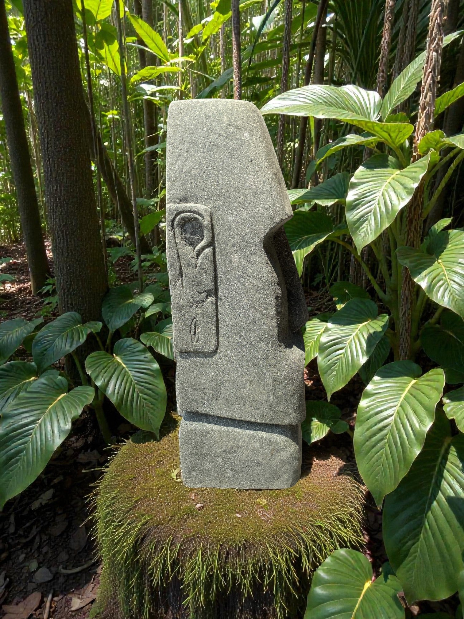 Hand carved Stone Easter Island Rapanui statue. Complement your garden with a hand carved Indonesian garden sculpture hand crafted from Indonesian greenstone. Easter Island is famous for its 887 extant monumental statues, called moai, created by the early Rapa Nui people. These look great with a night light mounted at the base of the statue facing upwards, creating shadows and ambience and compliments your outdoor furniture and garden landscaping.