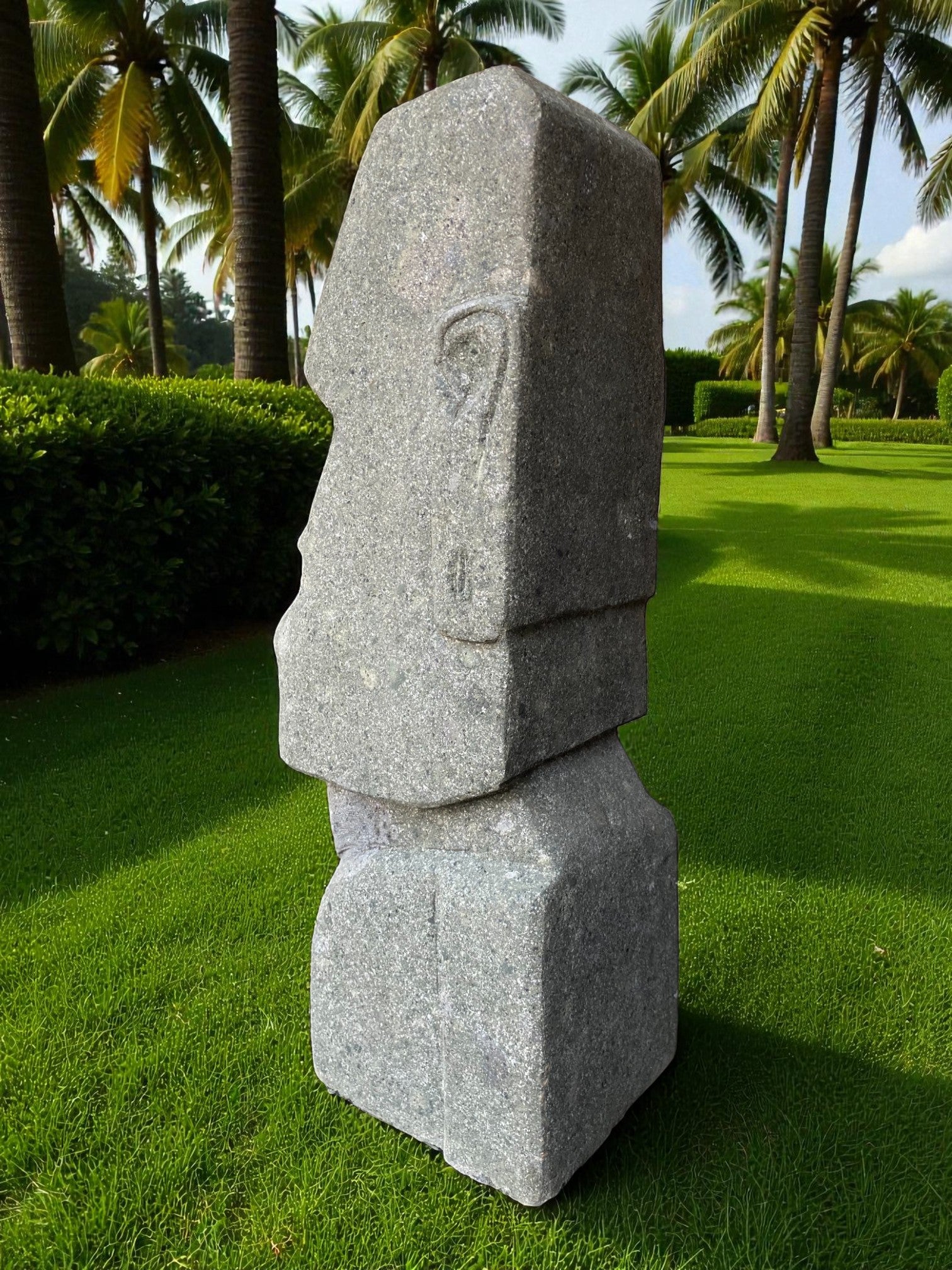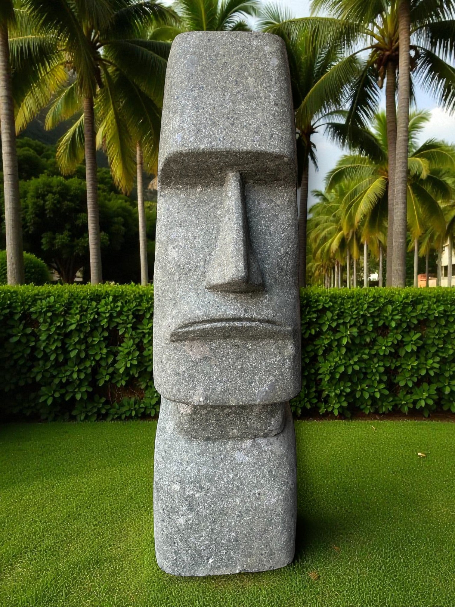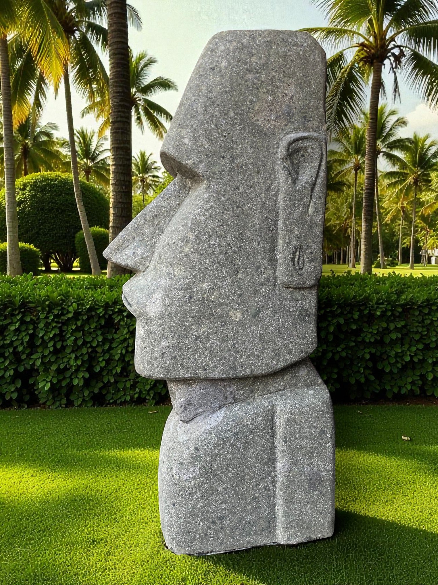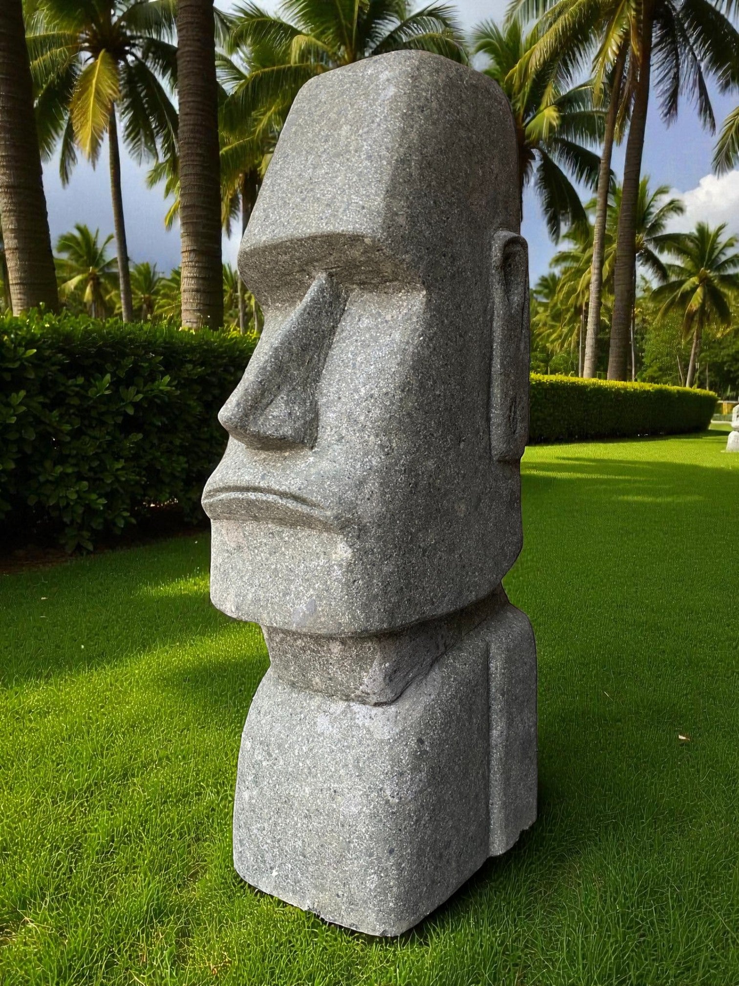 Hand carved Stone Easter Island Rapanui statue. Complement your garden with a hand carved Indonesian garden sculpture hand crafted from Indonesian greenstone. Easter Island is famous for its 887 extant monumental statues, called moai, created by the early Rapa Nui people. These look great with a night light mounted at the base of the statue facing upwards, creating shadows and ambience and compliments your outdoor furniture and garden landscaping.
