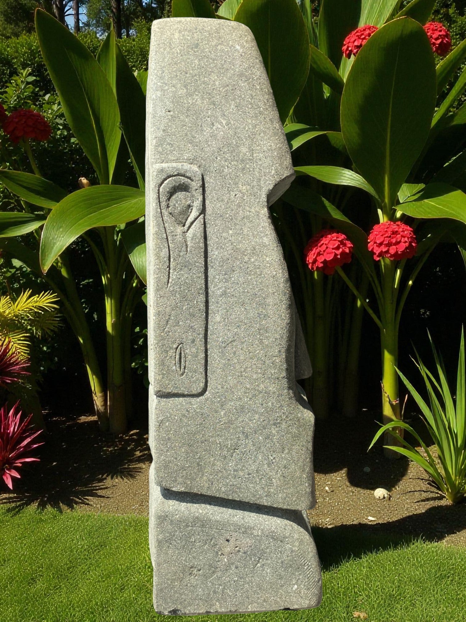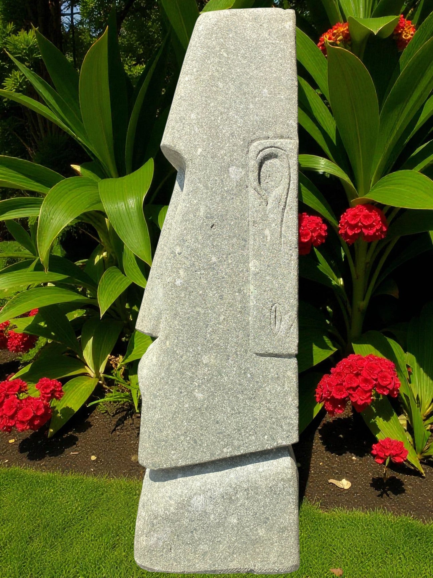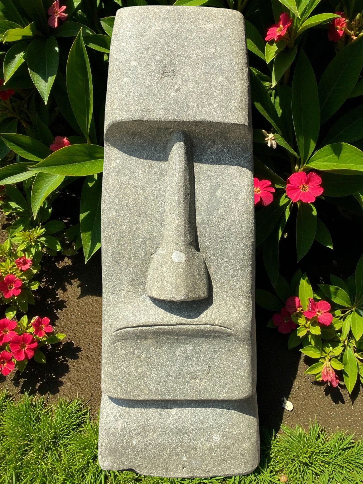Hand carved Stone Easter Island Rapanui statue. Complement your garden with a hand carved Indonesian garden sculpture hand crafted from Indonesian greenstone. Easter Island is famous for its 887 extant monumental statues, called moai, created by the early Rapa Nui people. These look great with a night light mounted at the base of the statue facing upwards, creating shadows and ambience and compliments your outdoor furniture and garden landscaping.