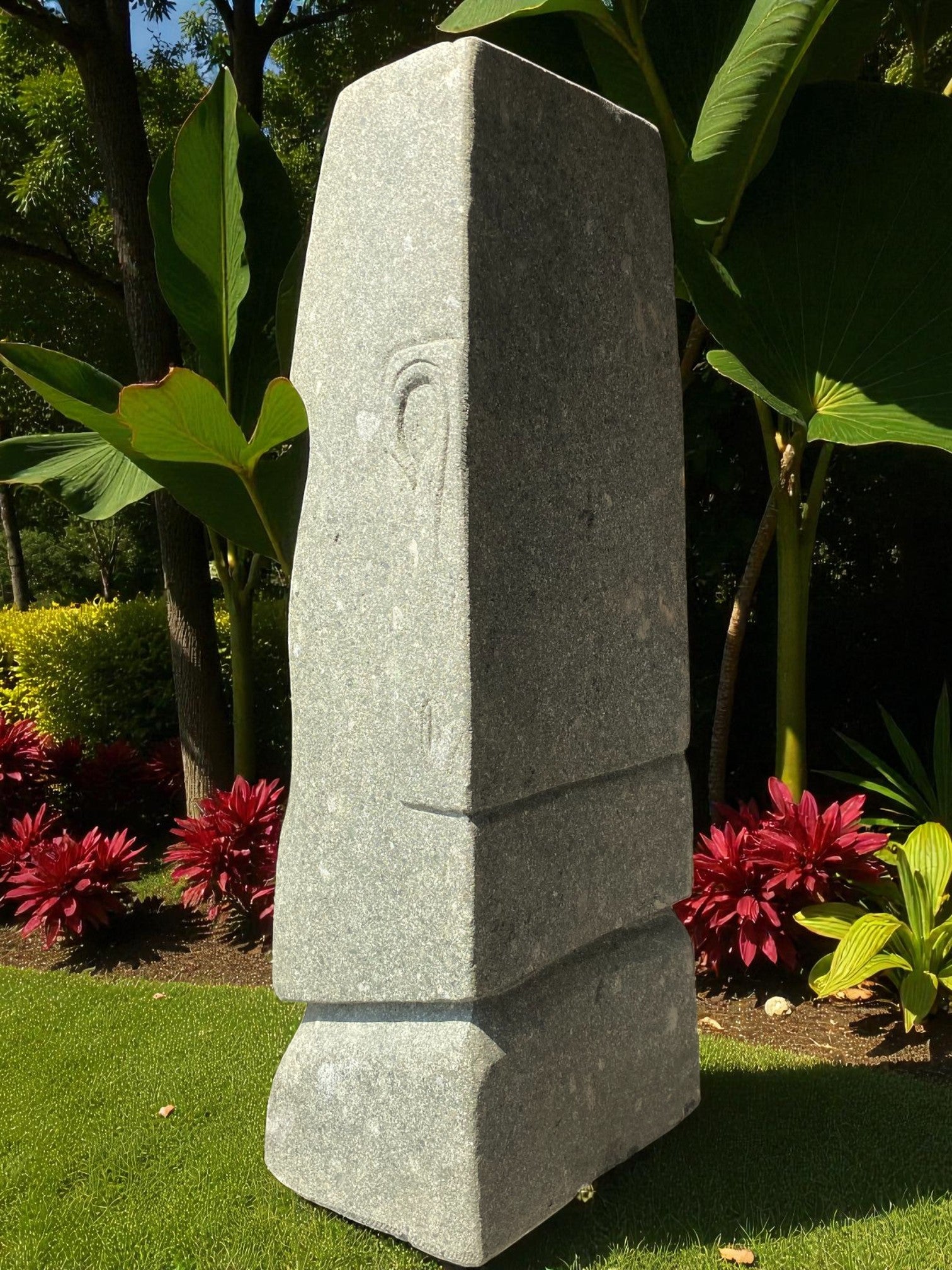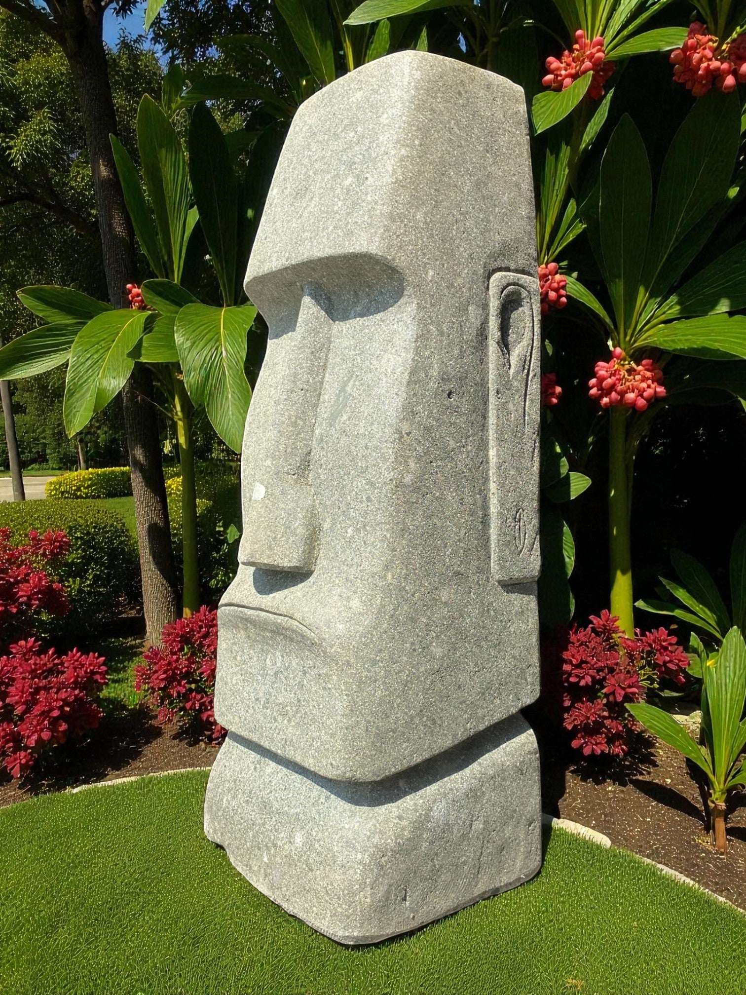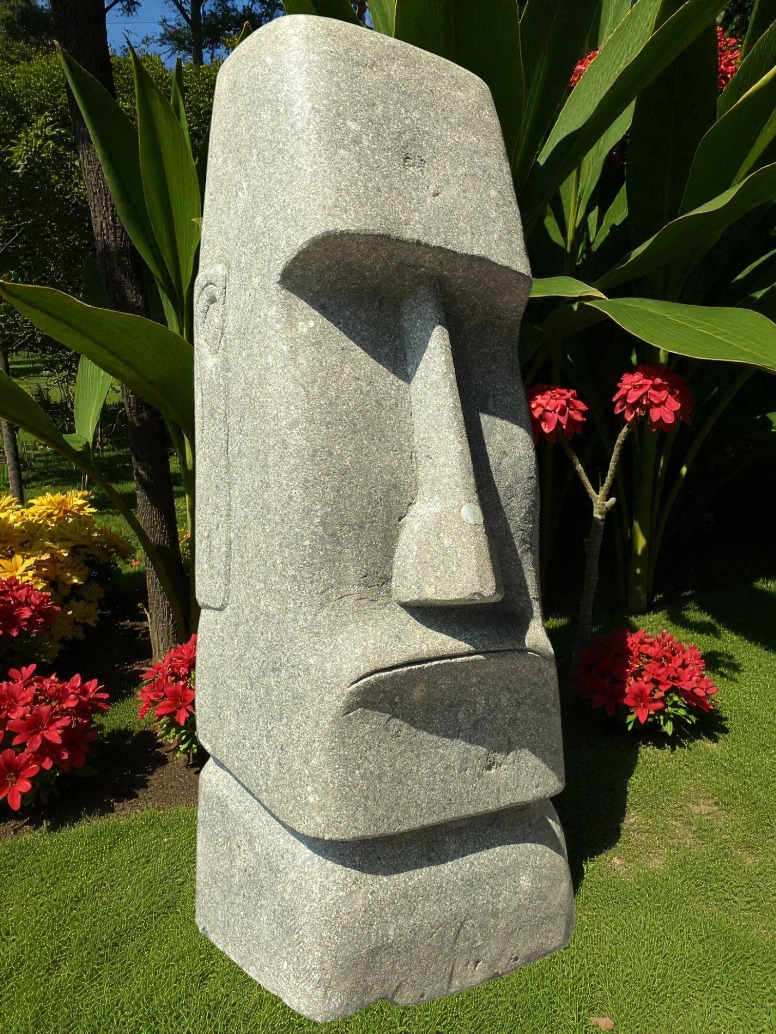 Hand carved Stone Easter Island Rapanui statue. Complement your garden with a hand carved Indonesian garden sculpture hand crafted from Indonesian greenstone. Easter Island is famous for its 887 extant monumental statues, called moai, created by the early Rapa Nui people. These look great with a night light mounted at the base of the statue facing upwards, creating shadows and ambience and compliments your outdoor furniture and garden landscaping.
