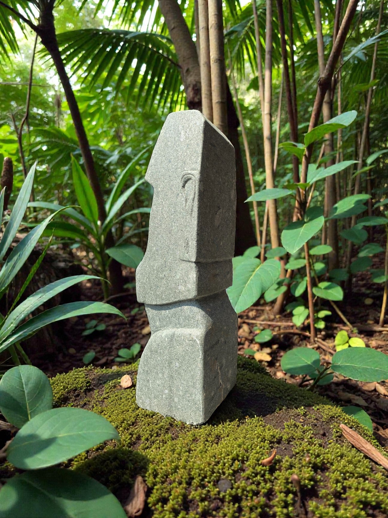 Hand carved Stone Easter Island Rapanui statue. Complement your garden with a hand carved Indonesian garden sculpture hand crafted from Indonesian greenstone. Easter Island is famous for its 887 extant monumental statues, called moai, created by the early Rapa Nui people. These look great with a night light mounted at the base of the statue facing upwards, creating shadows and ambience and compliments your outdoor furniture and garden landscaping.