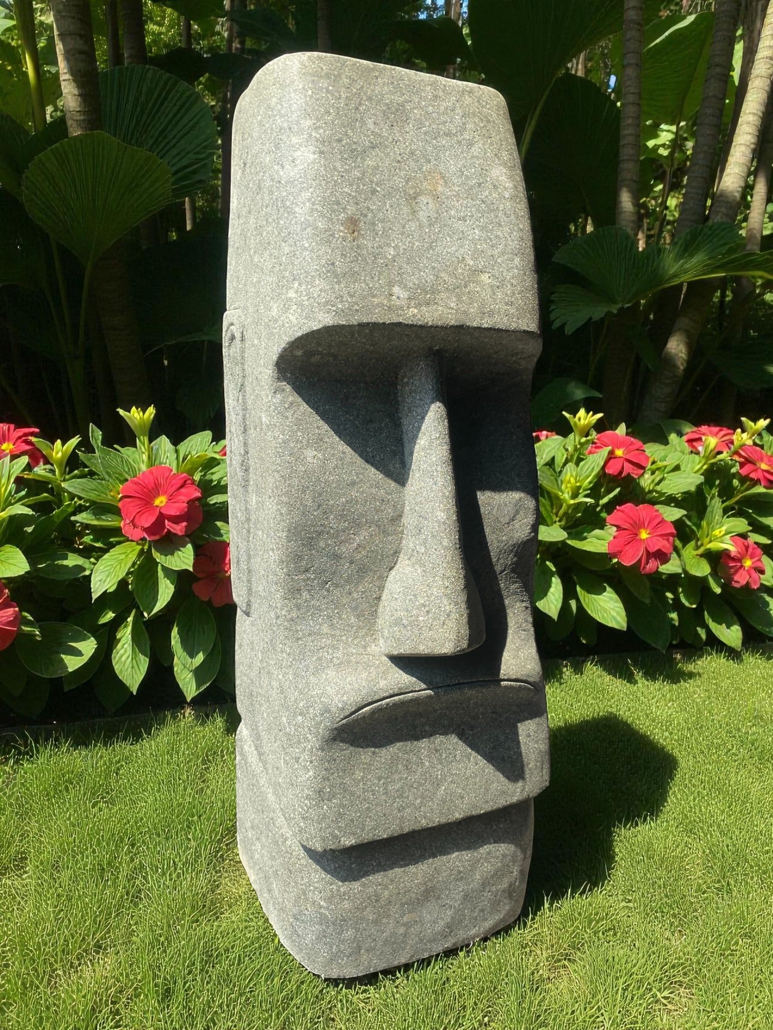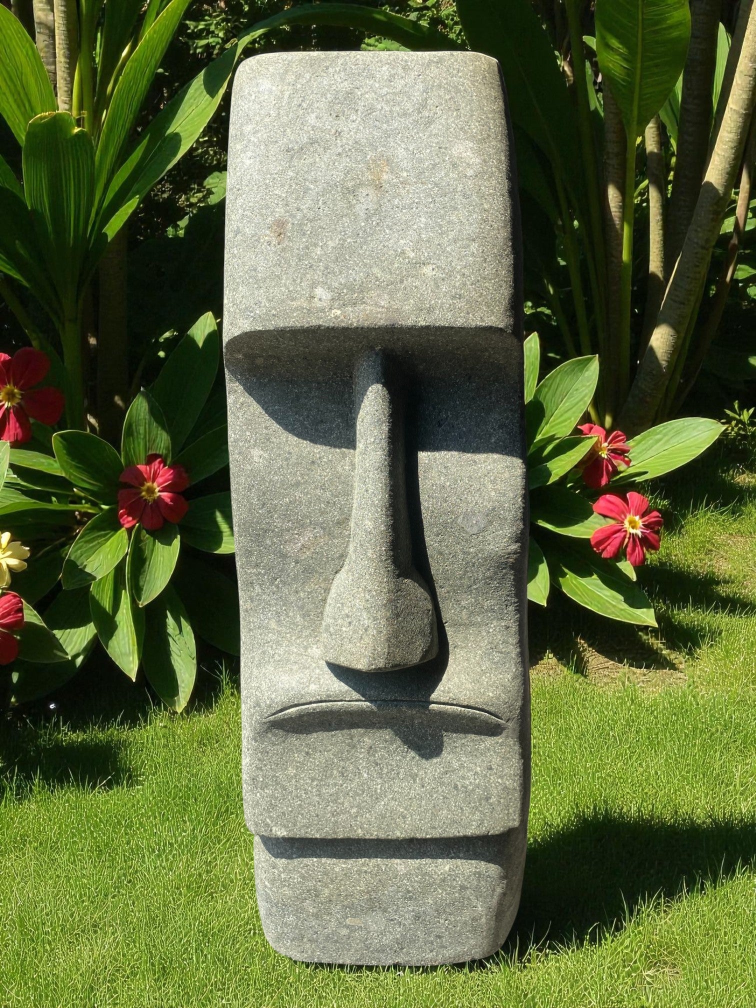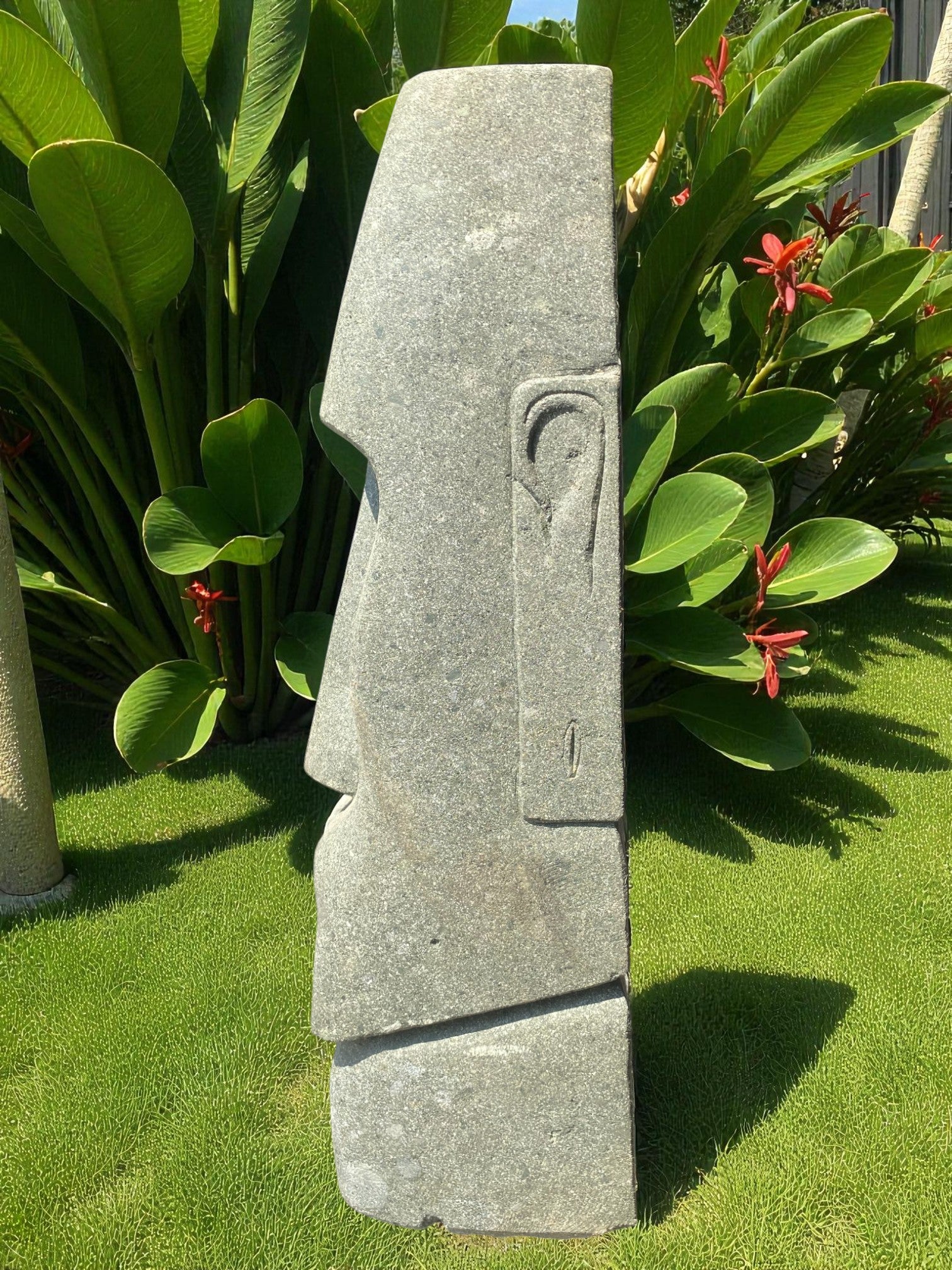 Hand carved Stone Easter Island Rapanui statue. Complement your garden with a hand carved Indonesian garden sculpture hand crafted from Indonesian greenstone. Easter Island is famous for its 887 extant monumental statues, called moai, created by the early Rapa Nui people. These look great with a night light mounted at the base of the statue facing upwards, creating shadows and ambience and compliments your outdoor furniture and garden landscaping.
