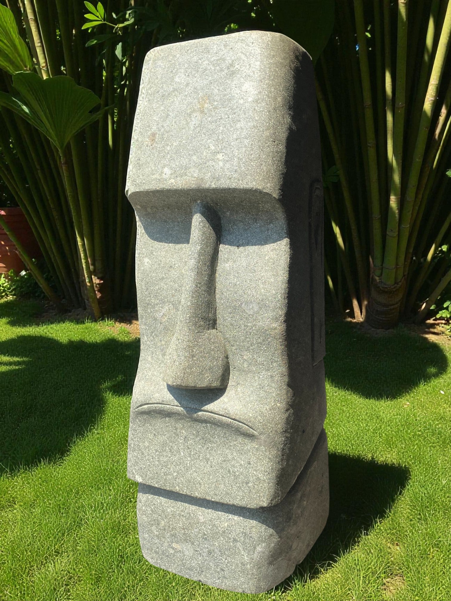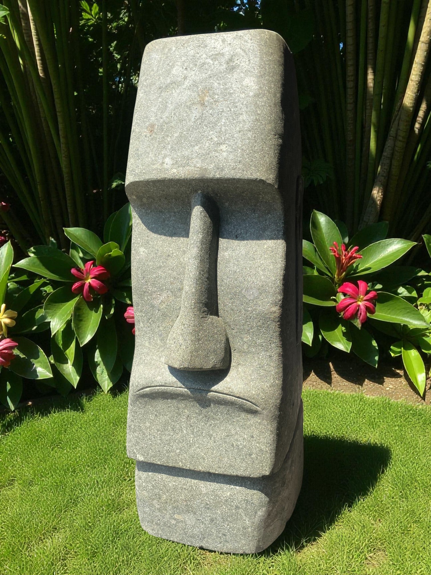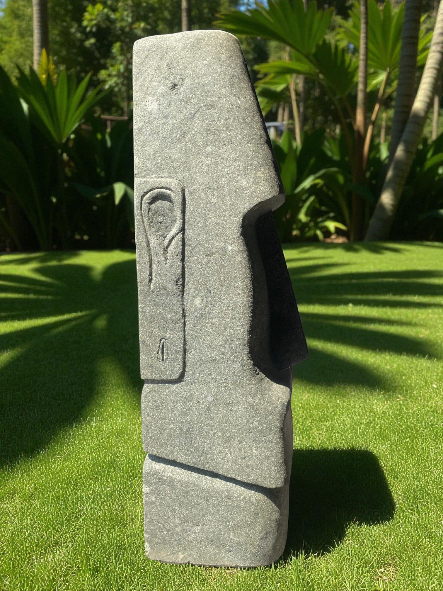 Hand carved Stone Easter Island Rapanui statue. Complement your garden with a hand carved Indonesian garden sculpture hand crafted from Indonesian greenstone. Easter Island is famous for its 887 extant monumental statues, called moai, created by the early Rapa Nui people. These look great with a night light mounted at the base of the statue facing upwards, creating shadows and ambience and compliments your outdoor furniture and garden landscaping.