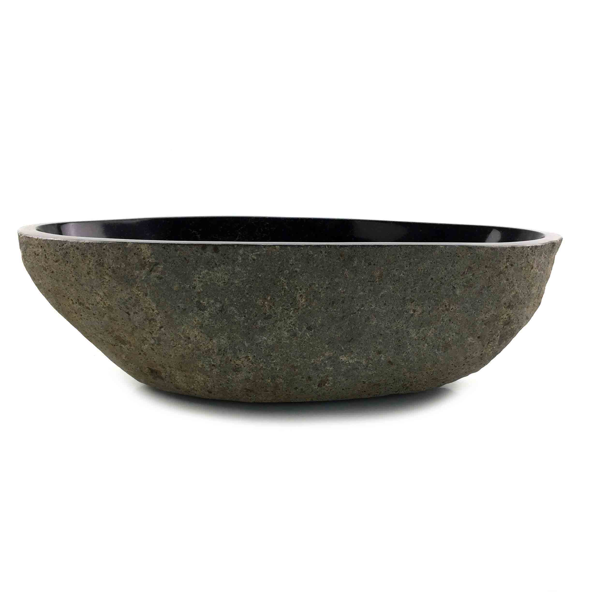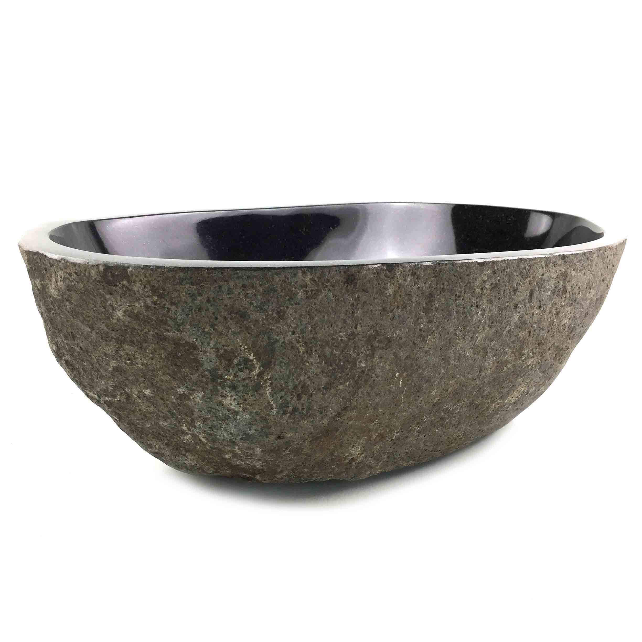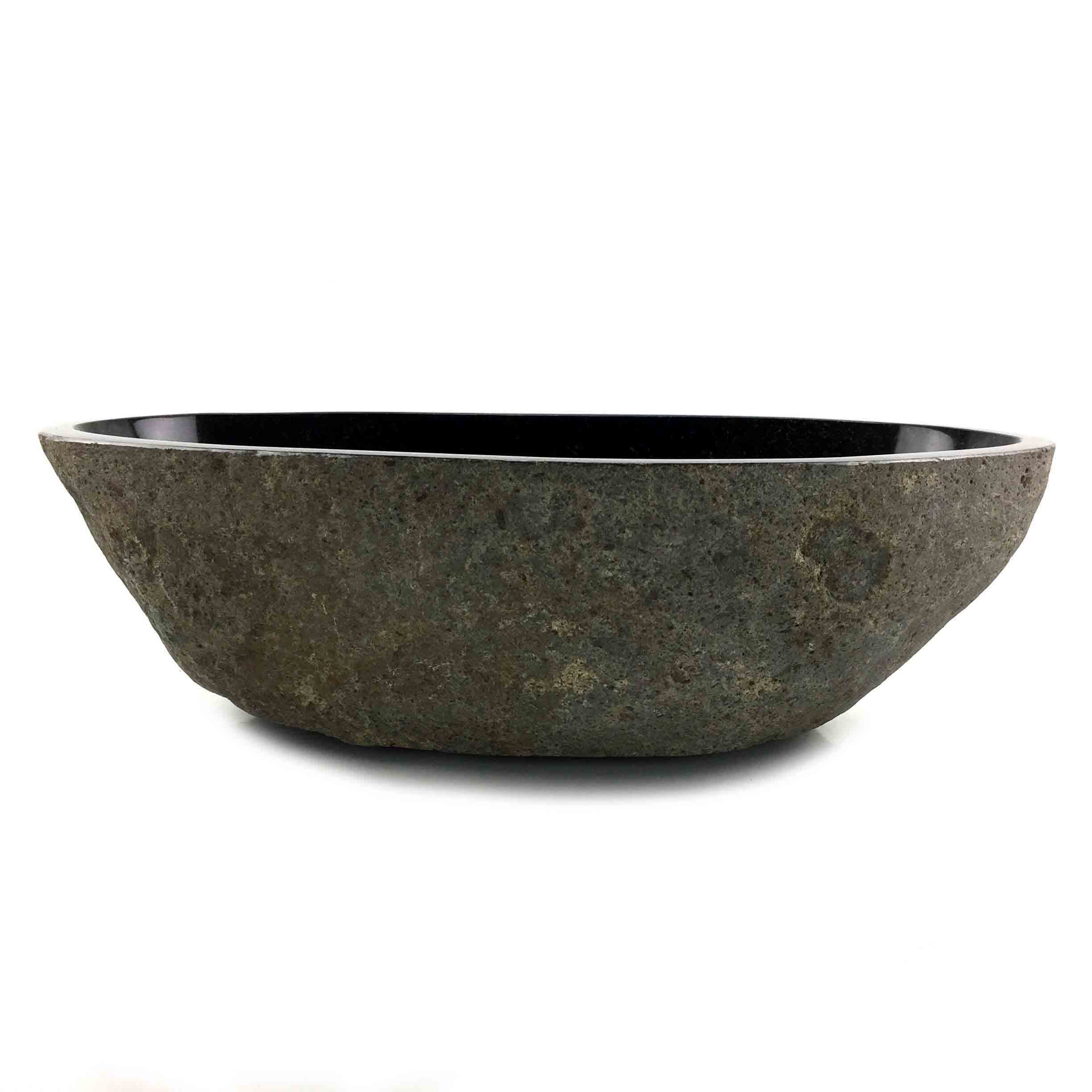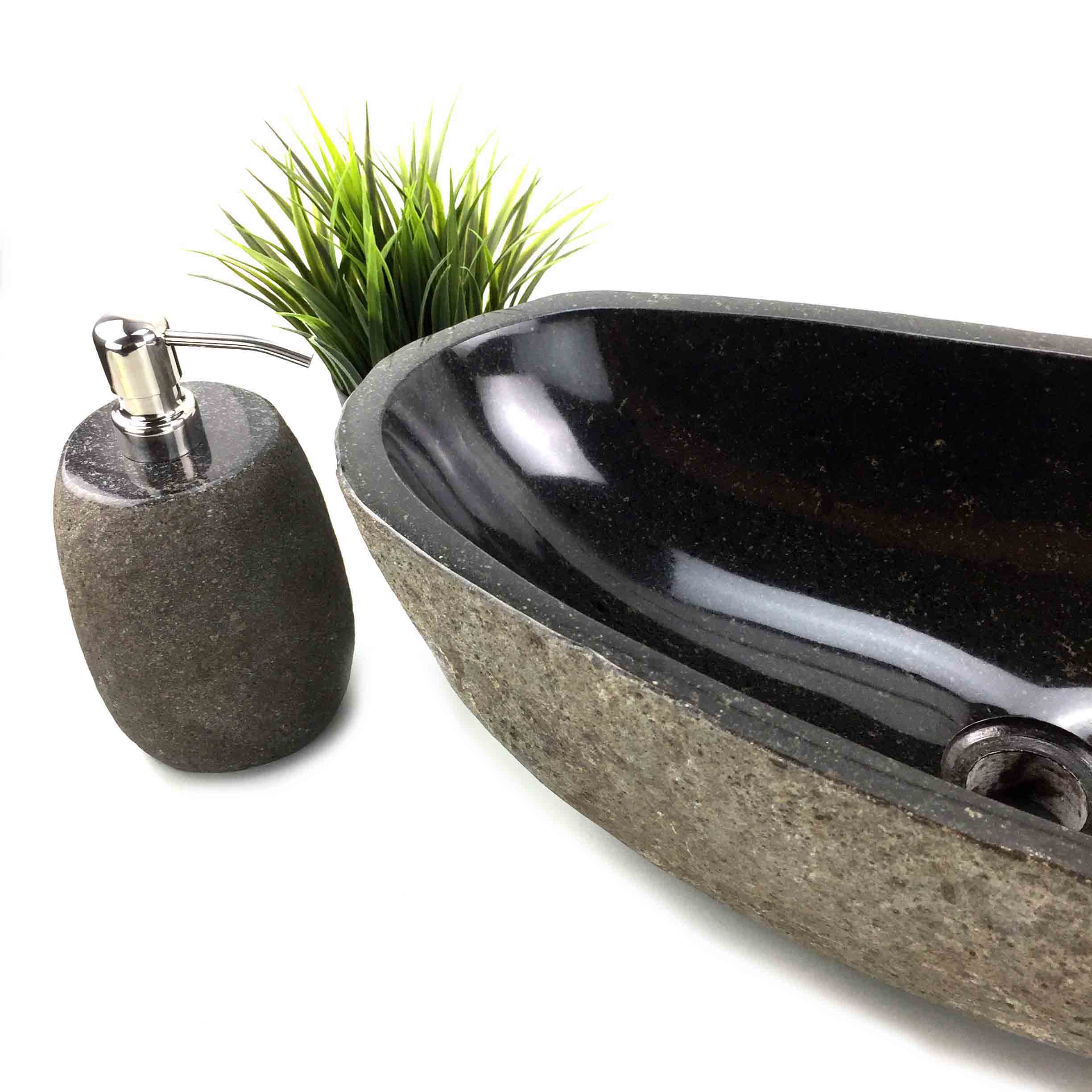Oval Rock Vanity basin with natural exterior, smooth polished interior. Large Size. All of our Stone Bathroom sinks require a 32mm Pop up waste without overflow. Complement the StoneBase Bathroom Sink with one of our stone bathroom accessories like the Soap, Lotion or Moisturiser dispenser, with Chrome, Copper or Brass look pump, soap dishes, stone candle holder, Towel Trays and toothbrush holders to match.