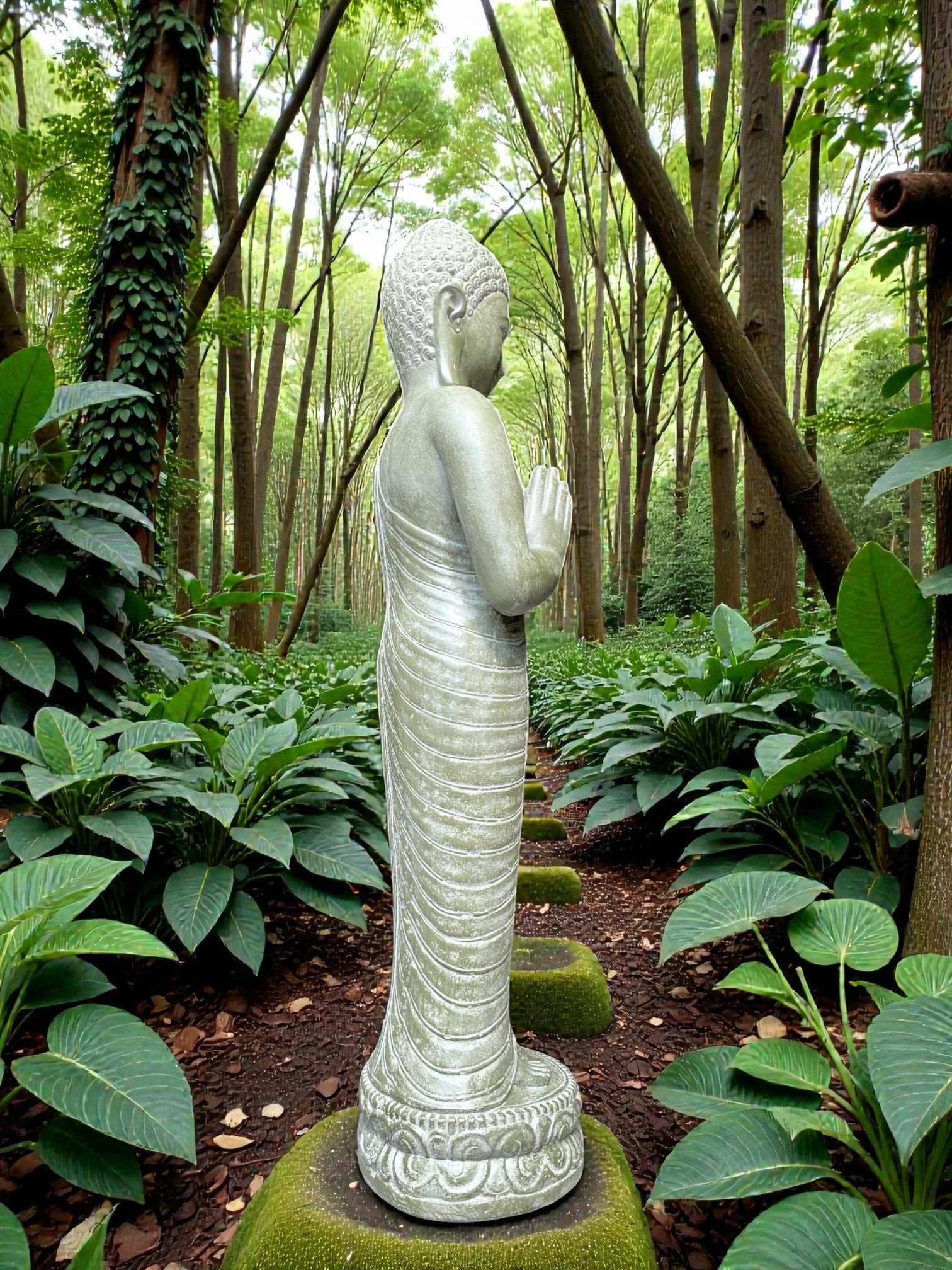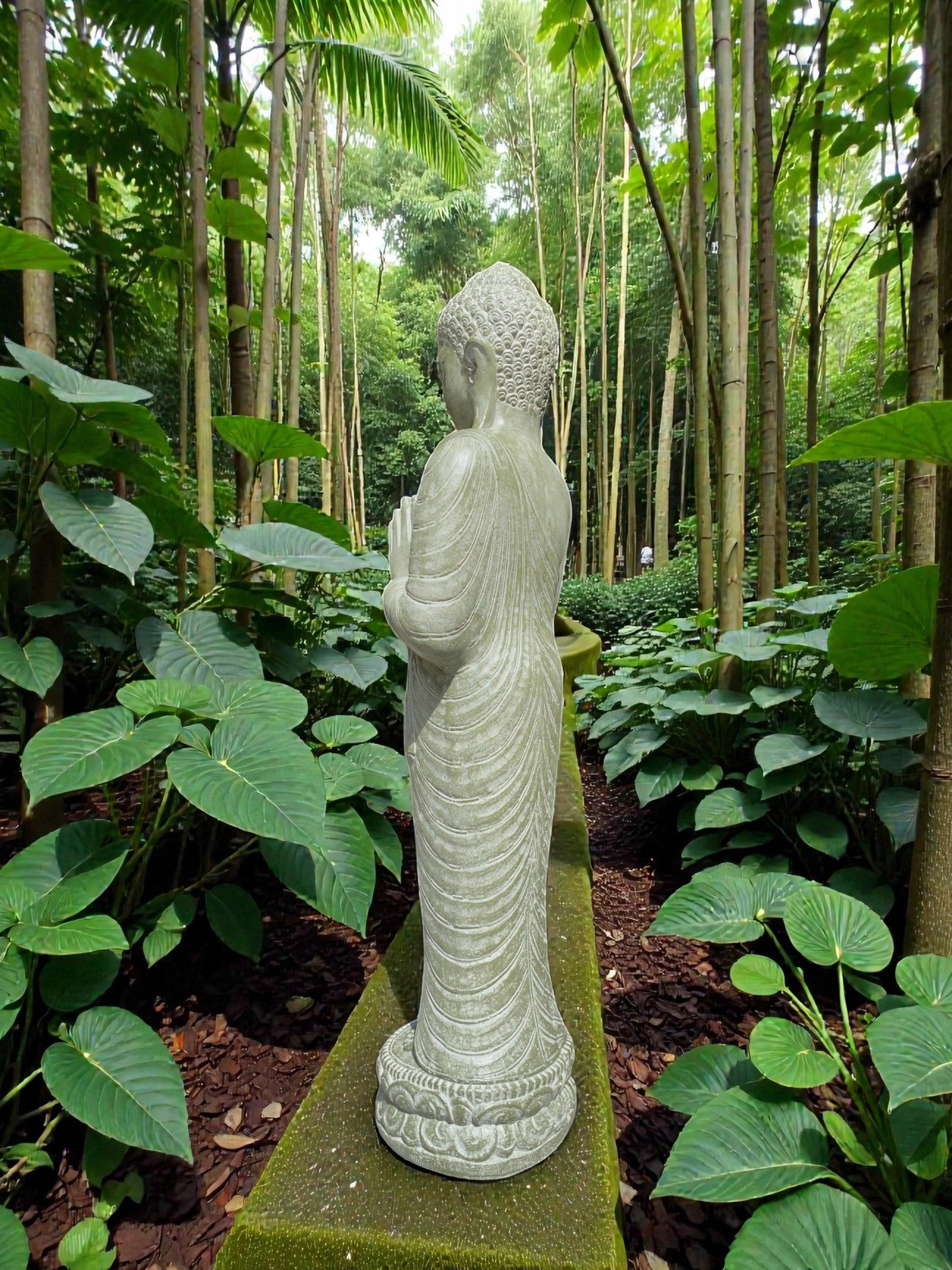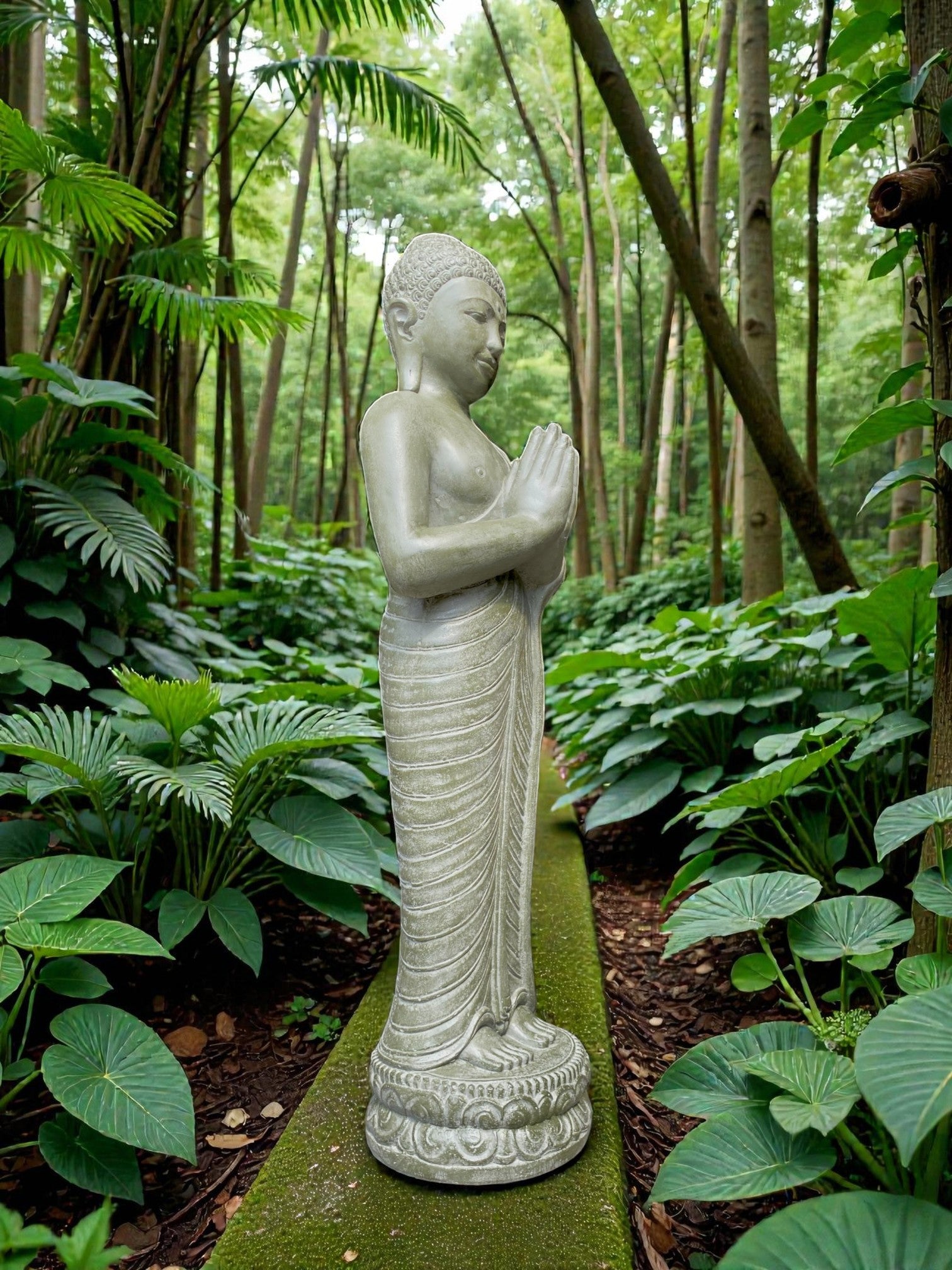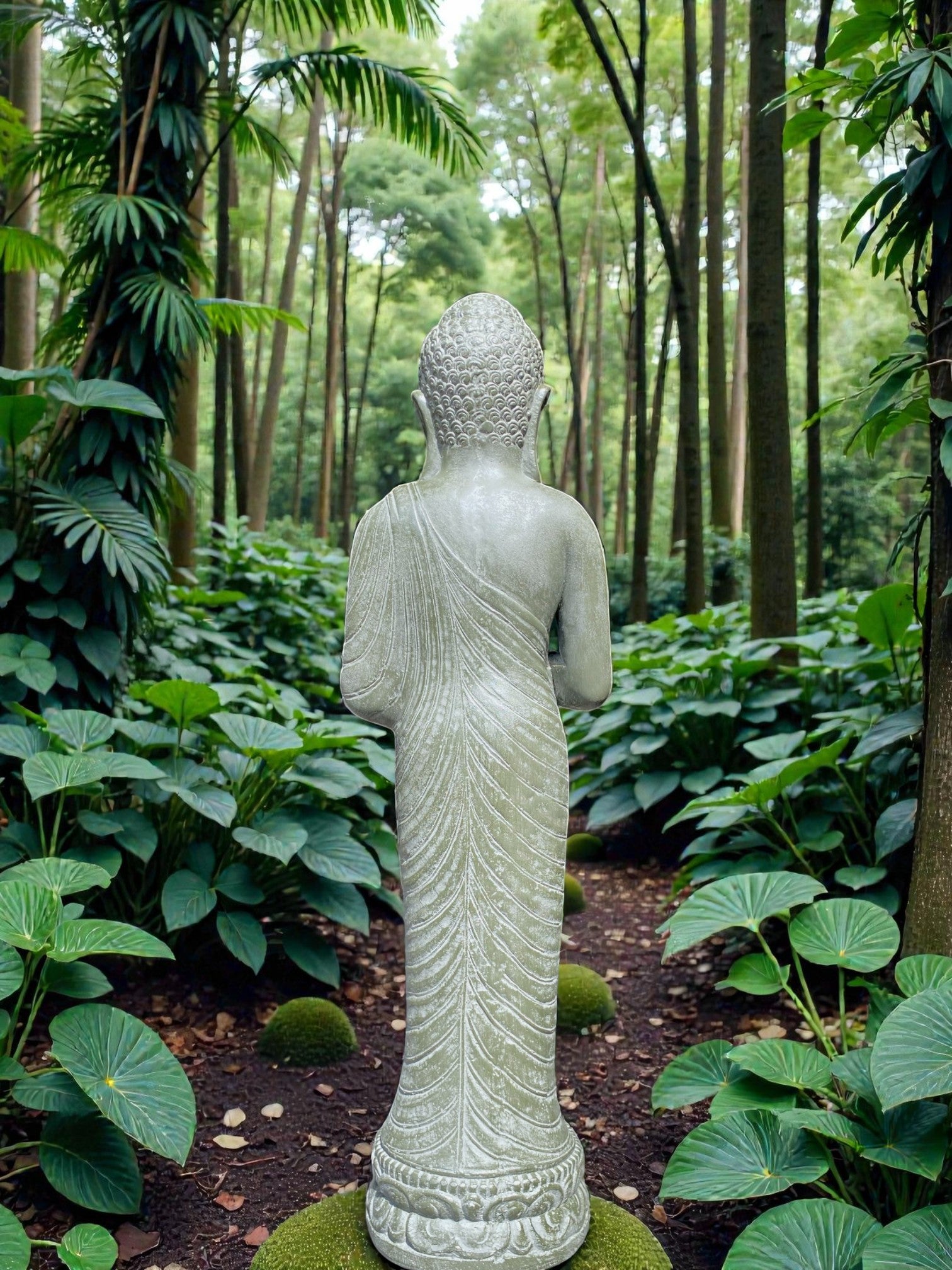 Each piece is meticulously finished by local artisans. This timeless statue brings a sense of peace and harmony to your outdoor setting. For added ambience, place a soft light at the base to highlight its contours and create a warm, tranquil glow at night.
