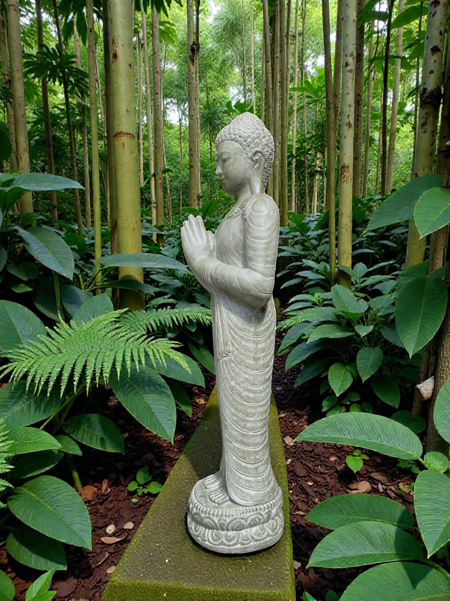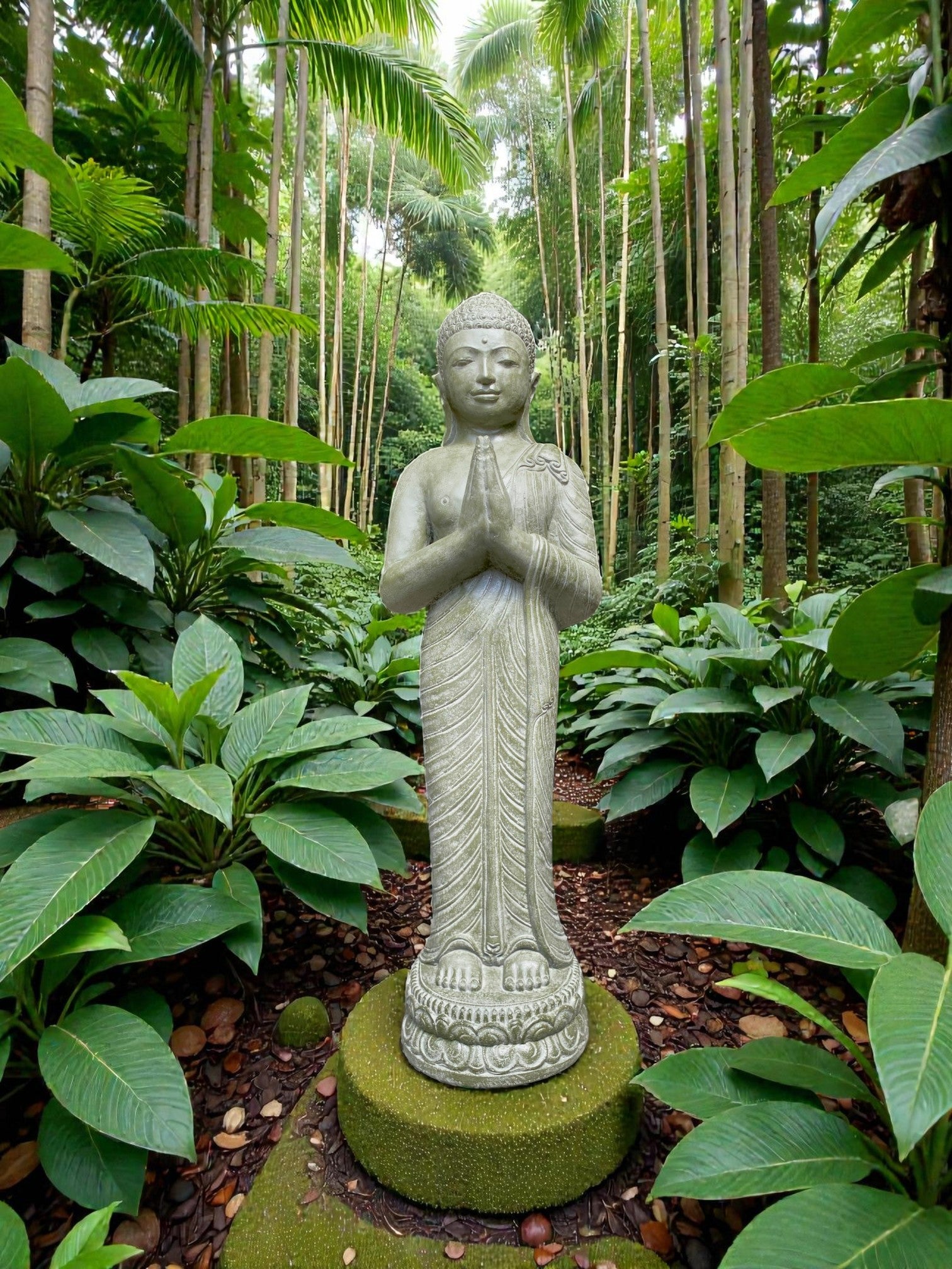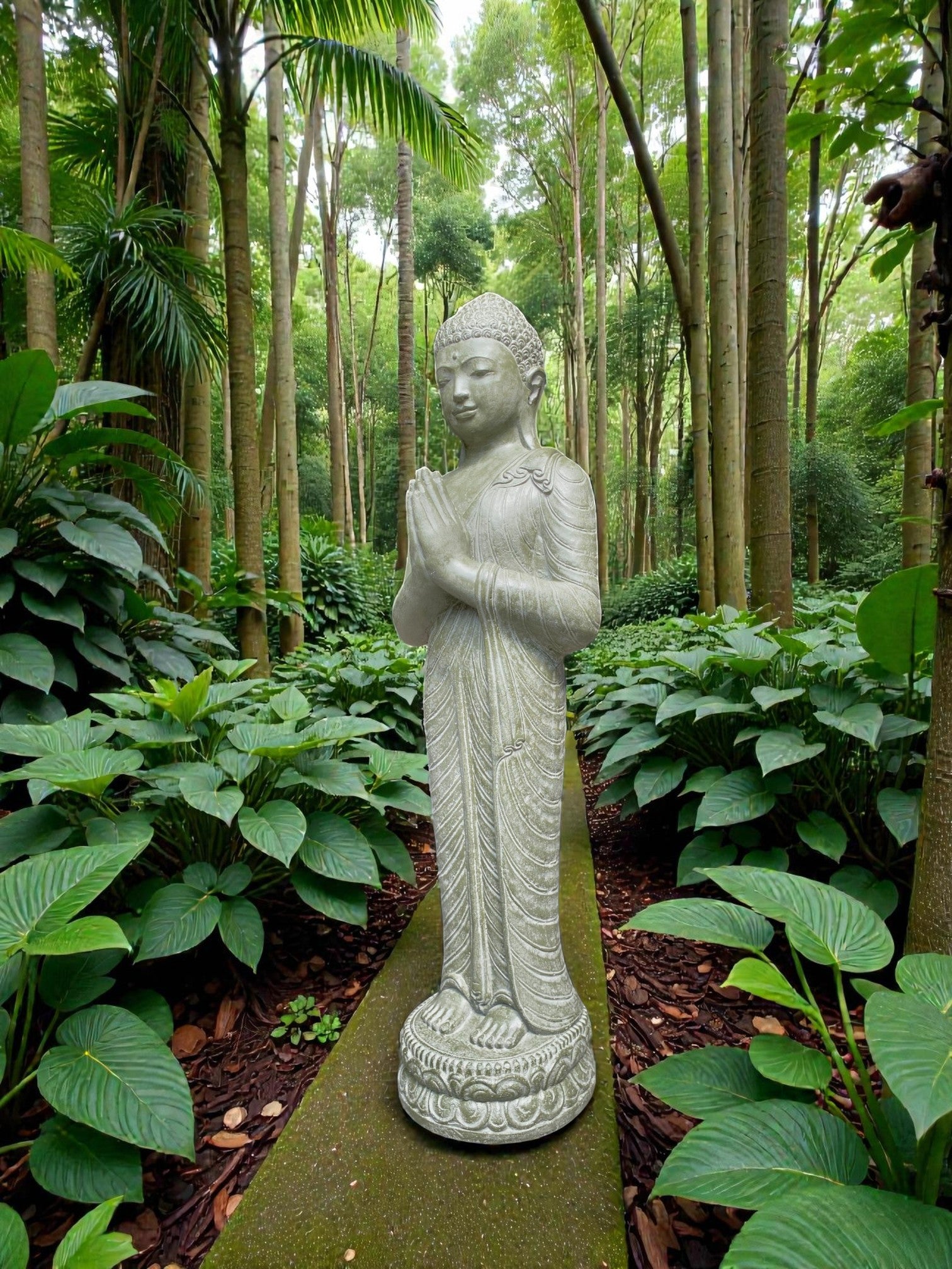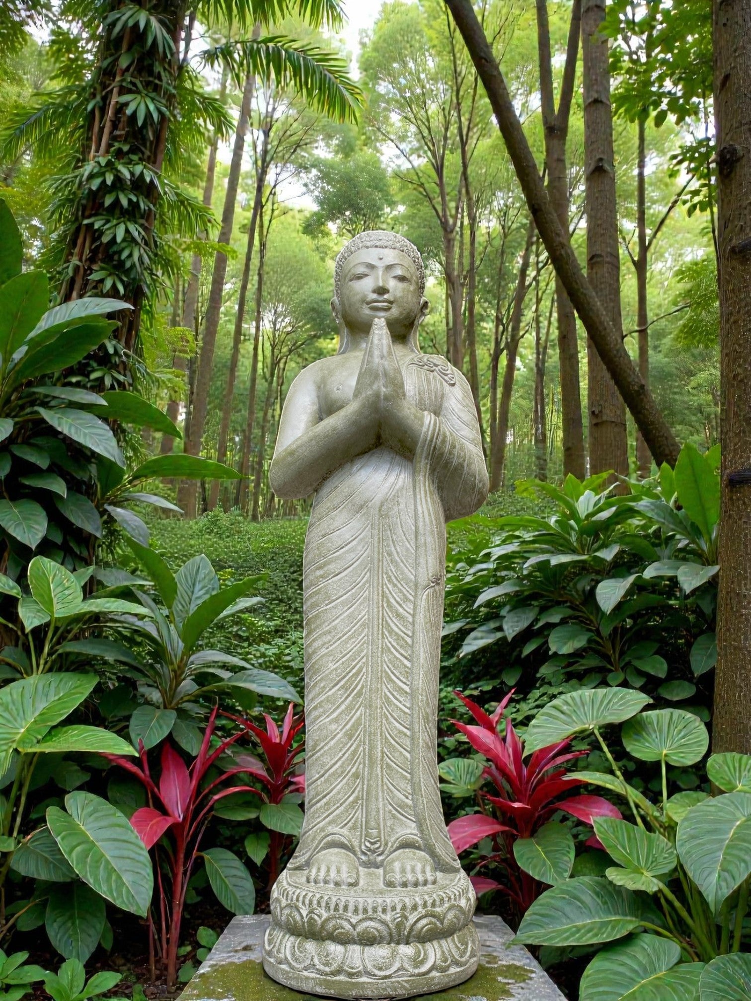 Each piece is meticulously finished by local artisans. This timeless statue brings a sense of peace and harmony to your outdoor setting. For added ambience, place a soft light at the base to highlight its contours and create a warm, tranquil glow at night.