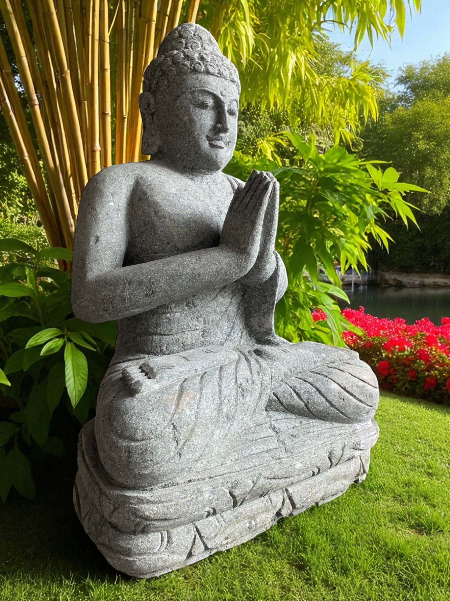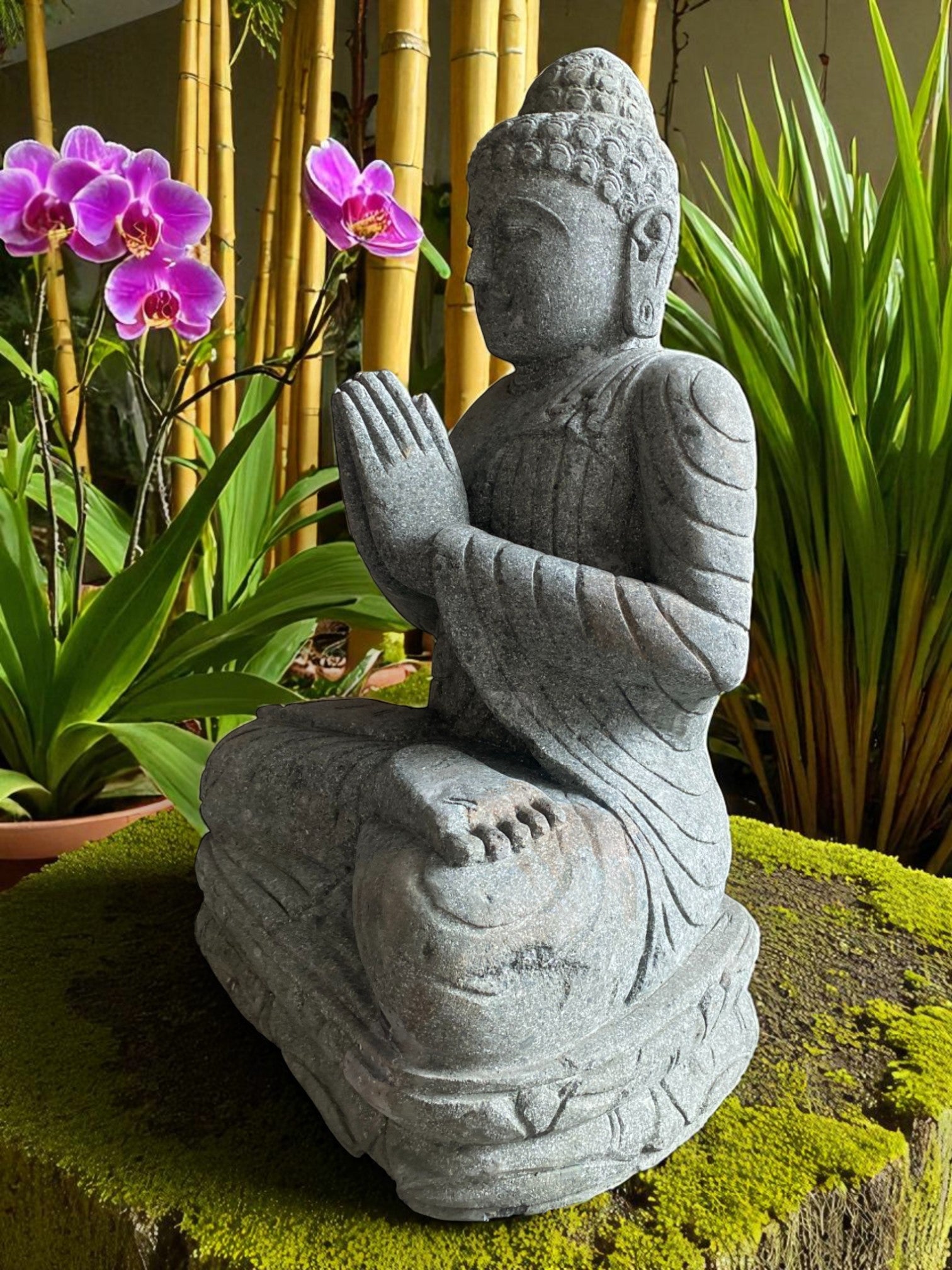 Hand carved Balinese Praying Buddha statue. Complement your garden landscaping and Outdoor Living with a fully carved from Indonesian Greenstone . Used by landscape architects for outdoor garden and landscaping projects. This is a hand carved Indonesian greenstone piece of art. These look great with a warm white night light mounted at the base of the statue facing upwards, creating shadows and ambience and compliments your outdoor furniture and garden landscaping. Upgrade your garden and landscaping and add value to your home and garden renovation.