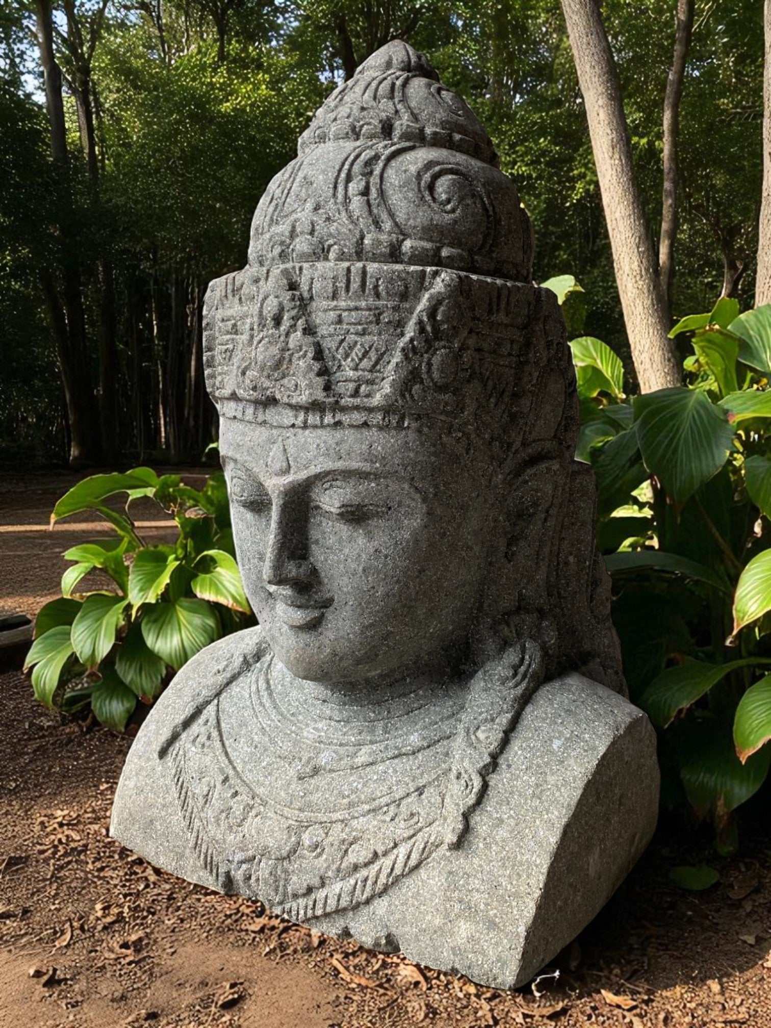 Hand carved Balinese Buddha statue. "Dewi Lakshmi" goddess of wealth, fortune & prosperity. Complement your garden landscaping and Outdoor Living with a fully carved from Indonesian Greenstone . Used by landscape architects for outdoor garden and landscaping projects. This is a hand carved Indonesian greenstone piece of art. These look great with a warm white night light mounted at the base of the statue facing upwards, creating shadows and ambience and compliments your outdoor furniture and garden landscaping. Upgrade your garden and landscaping and add value to your home and garden renovation.