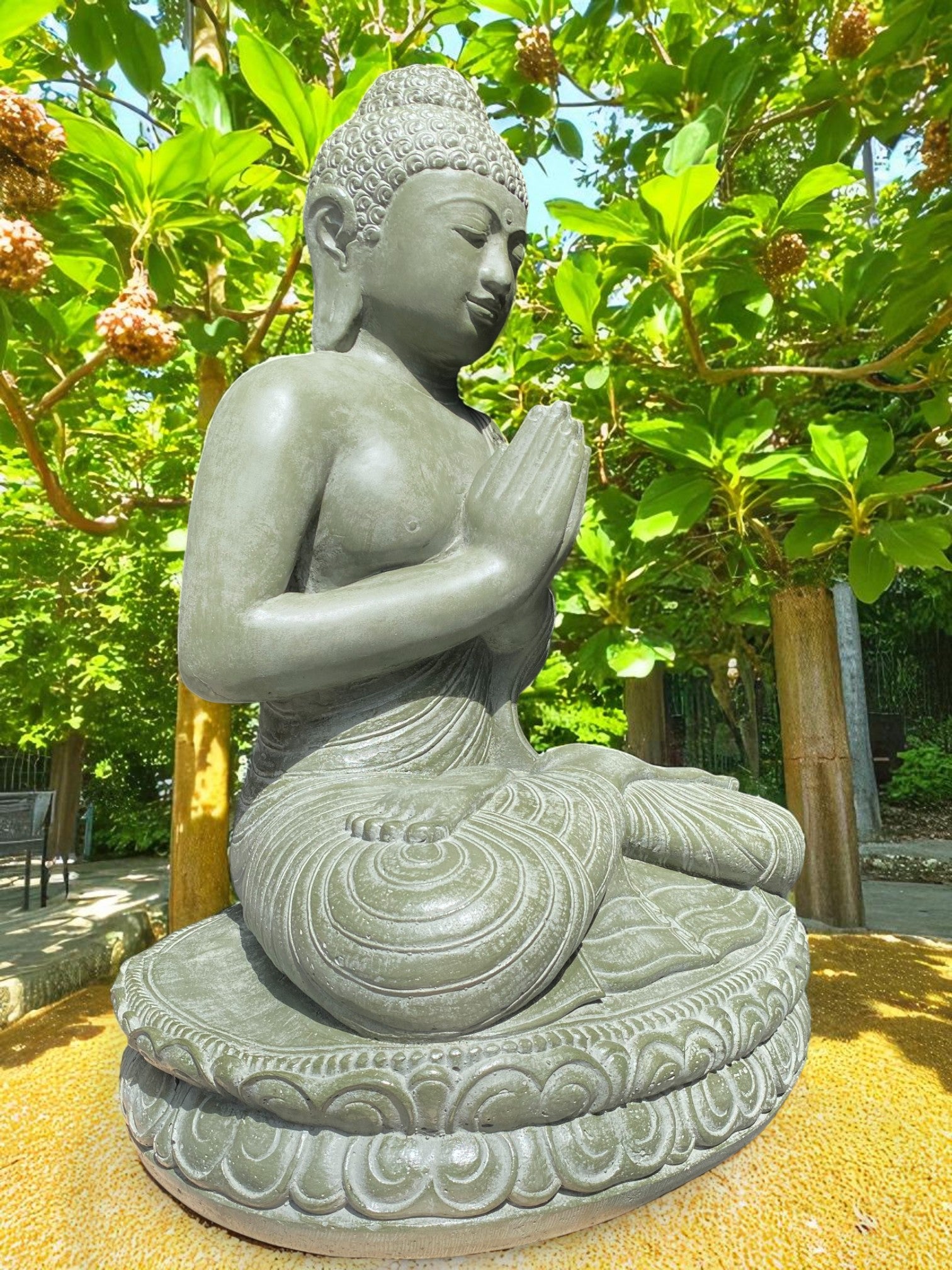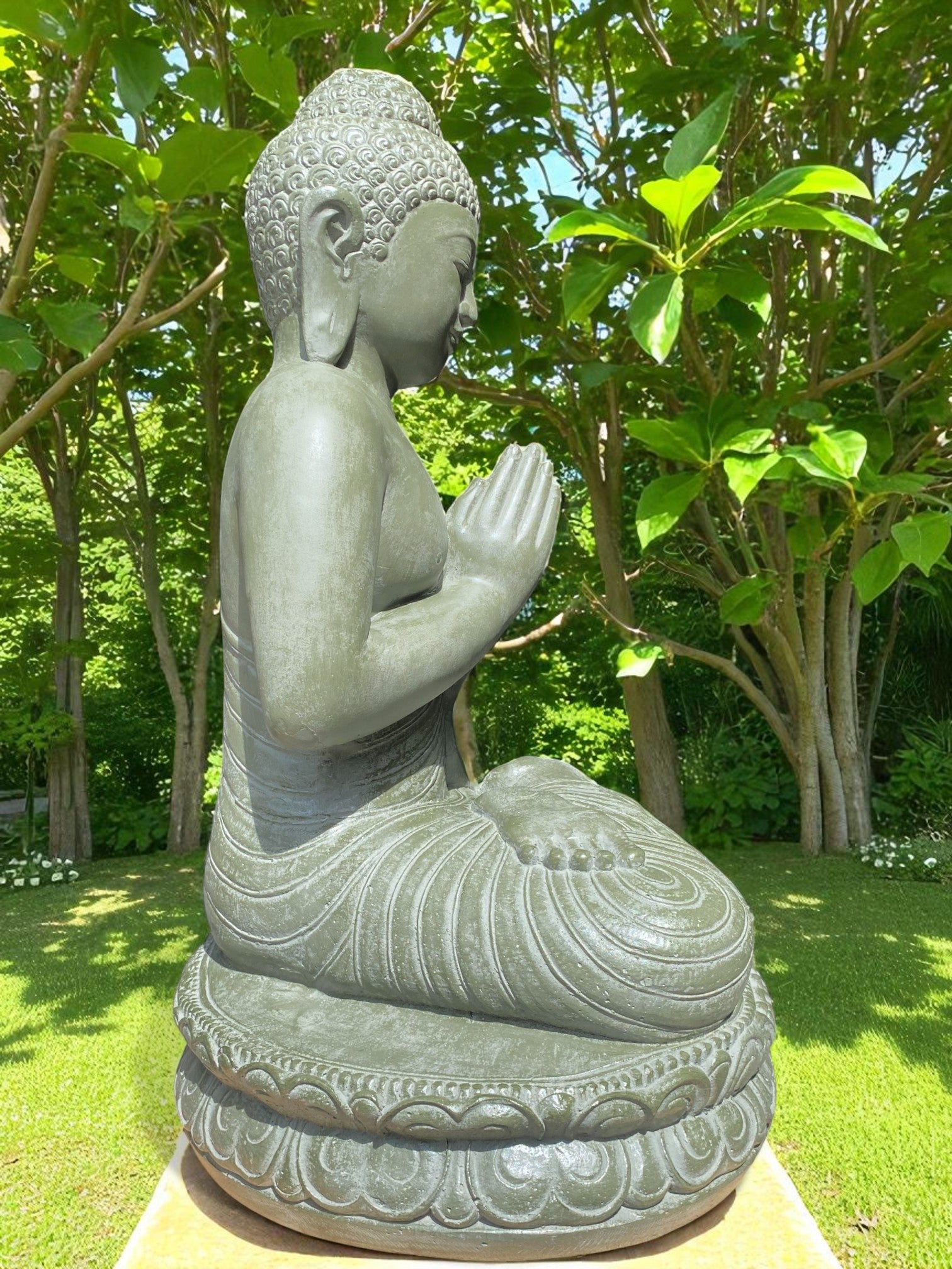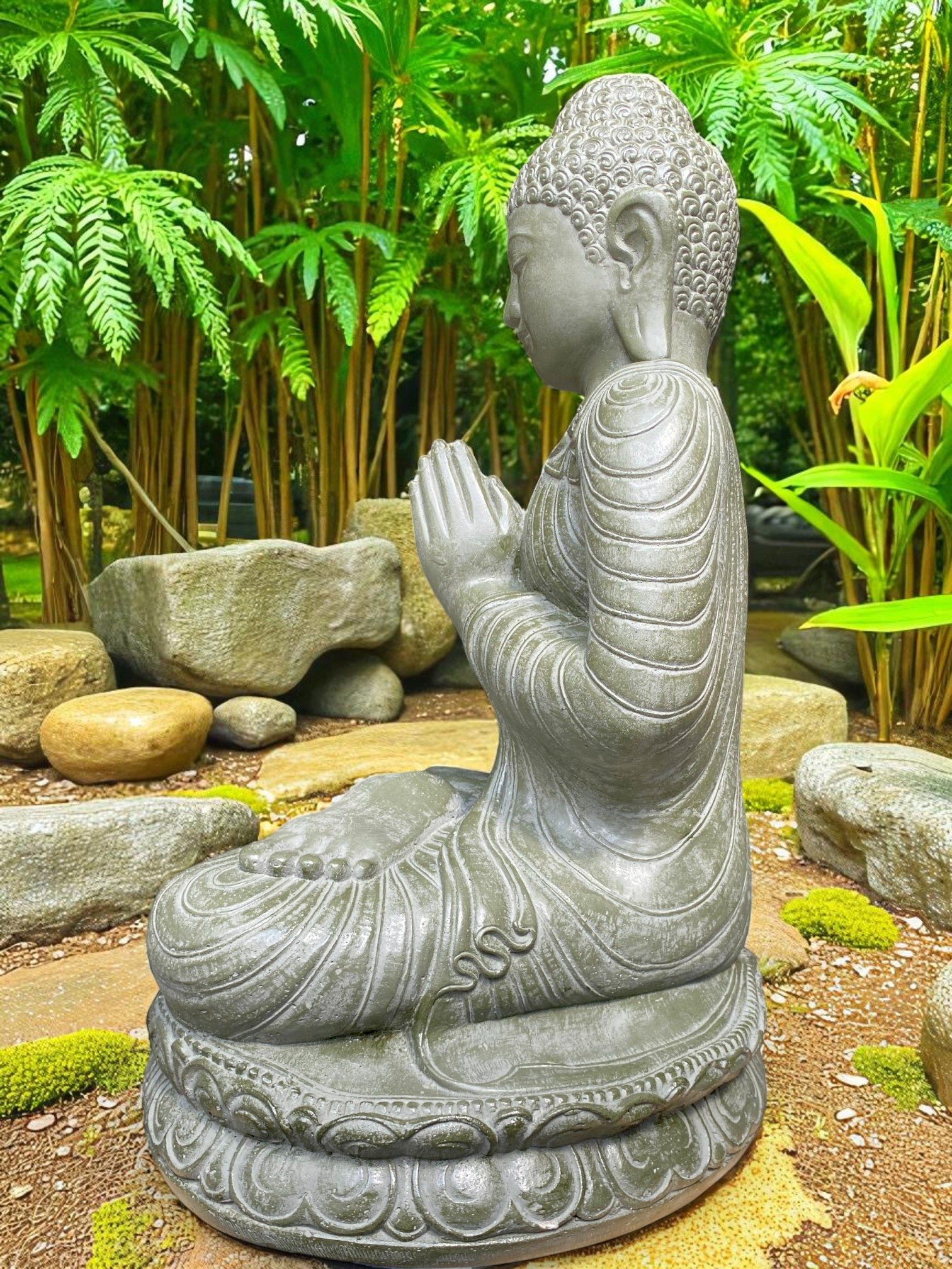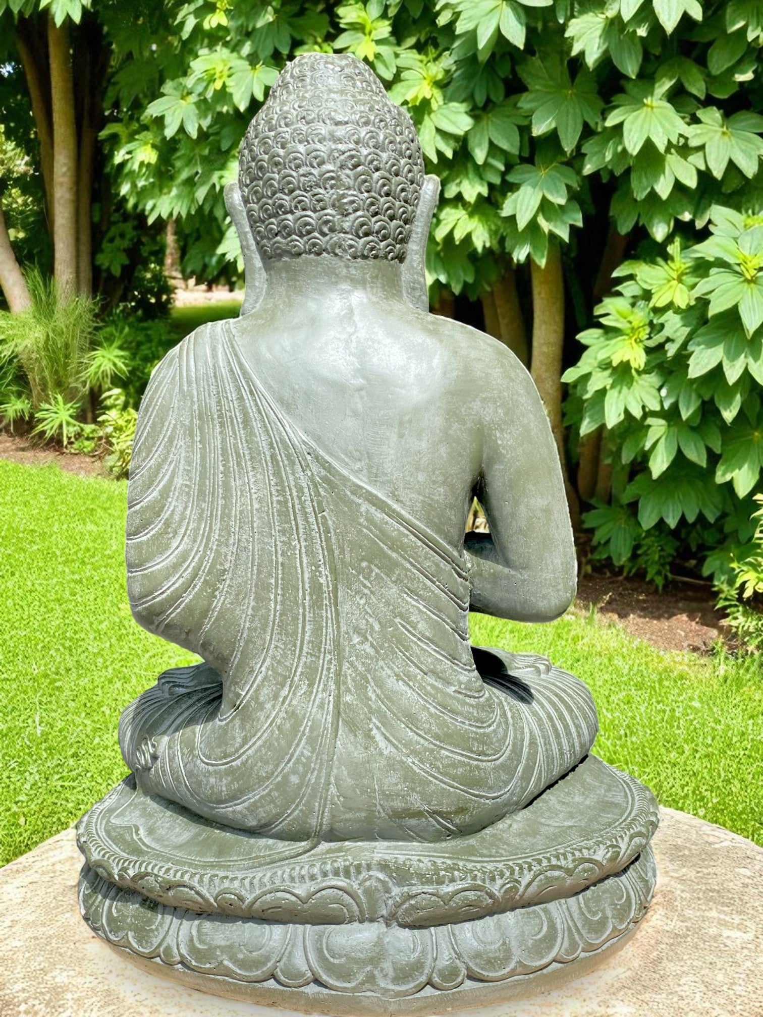Balinese Praying Buddha statue with front and rear detail. Complement your garden landscaping and Outdoor Living with a Praying or Greeting Buddha Statue . Used by landscape architects for outdoor garden and landscaping projects. This statue fits nicely into any garden. These look great with a warm white night light mounted at the base of the statue facing upwards, creating shadows and ambience and compliments your outdoor furniture and garden landscaping. Upgrade your garden and landscaping and add value to your home and garden renovation. Solid Concrete is a great cost effective alternative option for budget Sensitive projects as opposed to luxury hand carved stone.