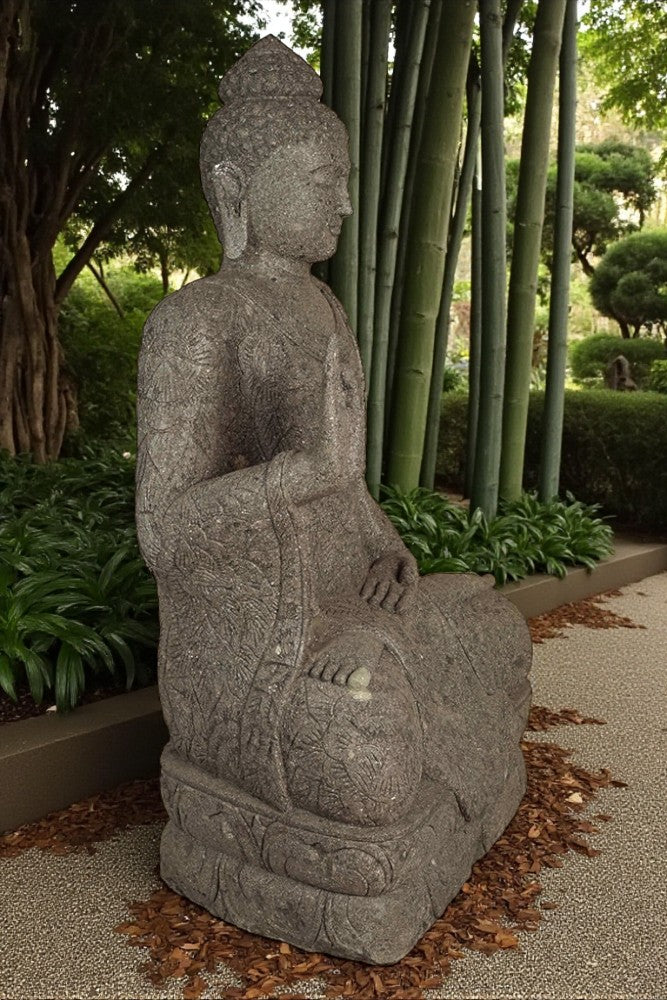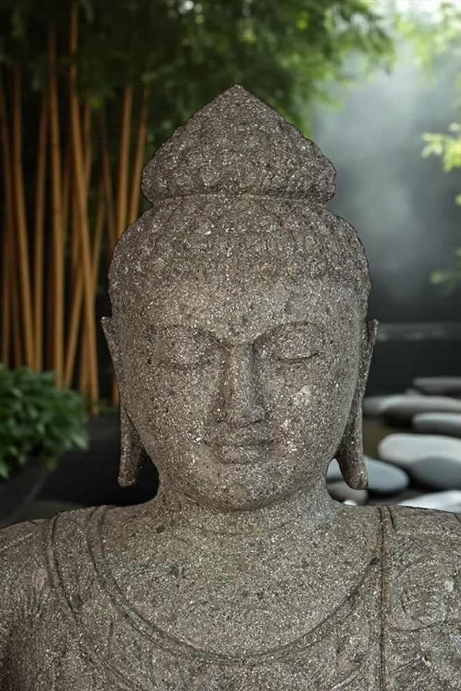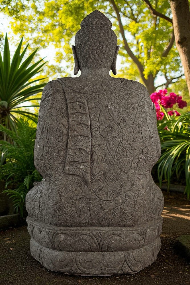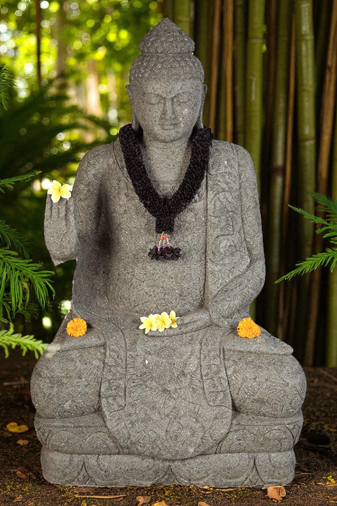 Hand carved Balinese Buddha statue. Complement your garden with a hand carved Indonesian greenstone piece of art. These look great with a night light mounted at the base of the statue facing upwards, creating shadows and ambience and compliments your outdoor furniture and garden landscaping.