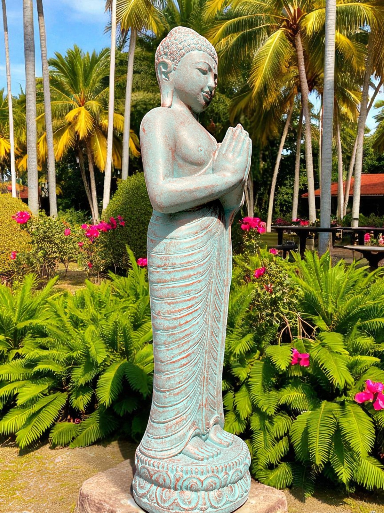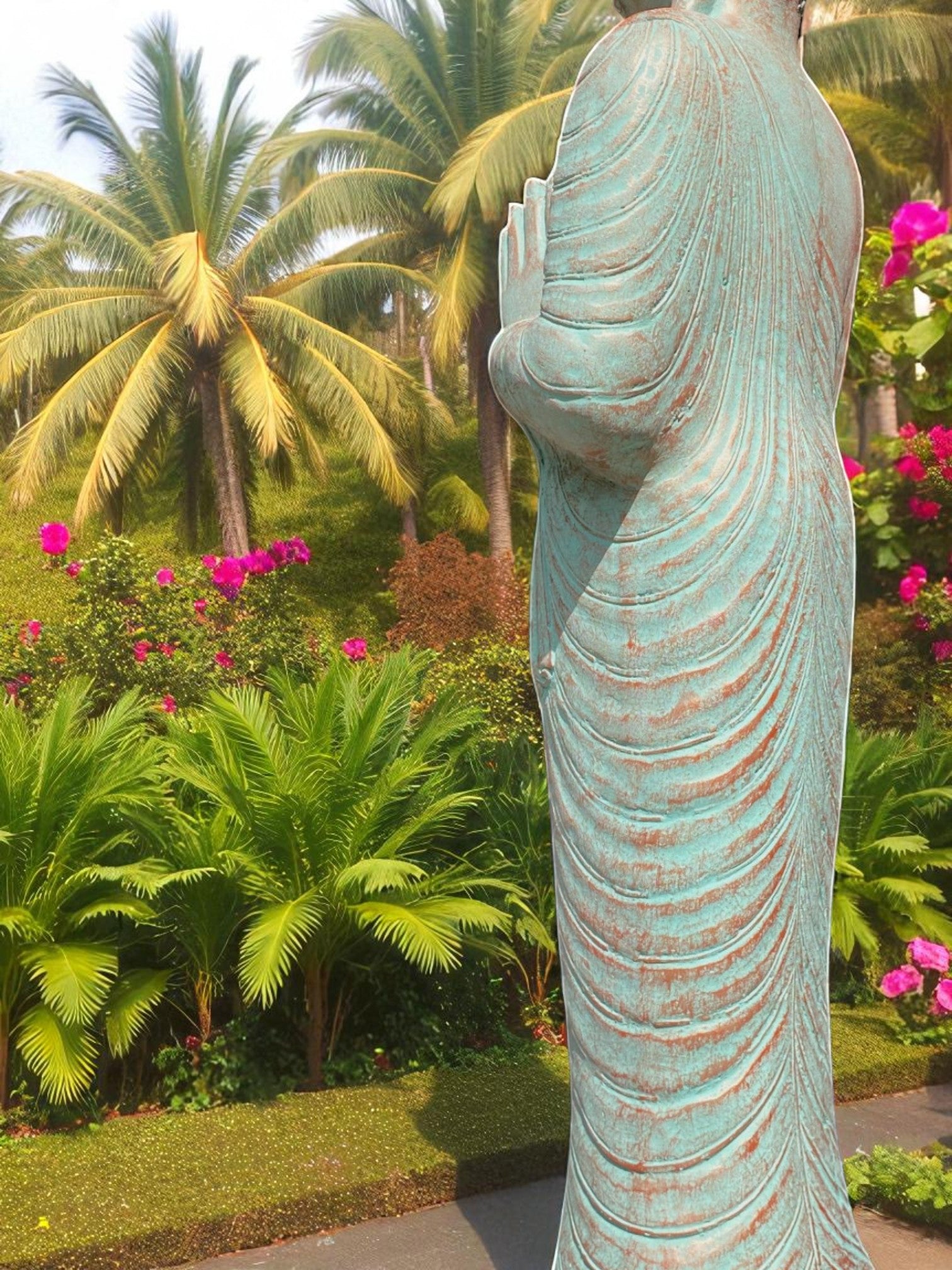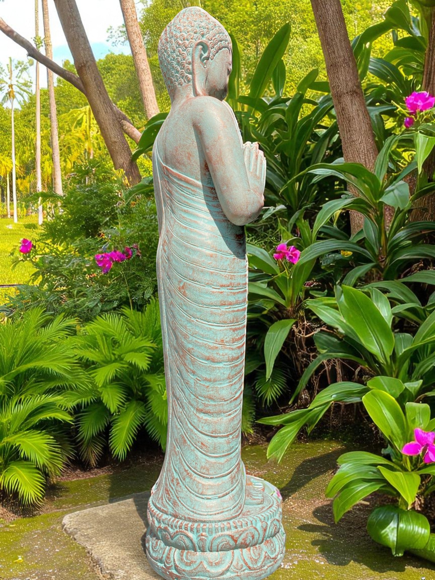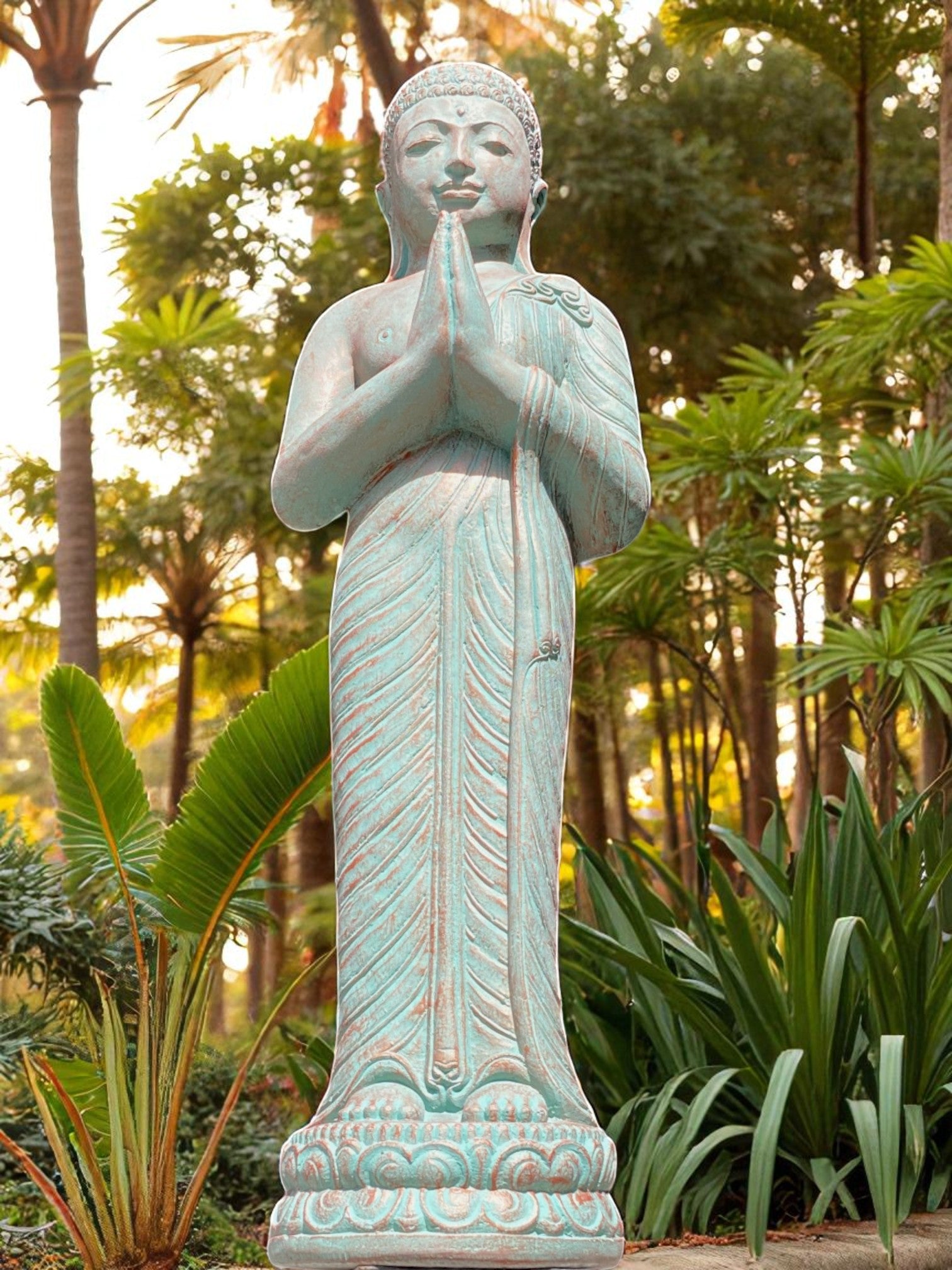 Praying Balinese Buddha statue in a stunning copper green colour. Crafted from concrete, this piece offers the perfect balance of strength, durability, and artistry.