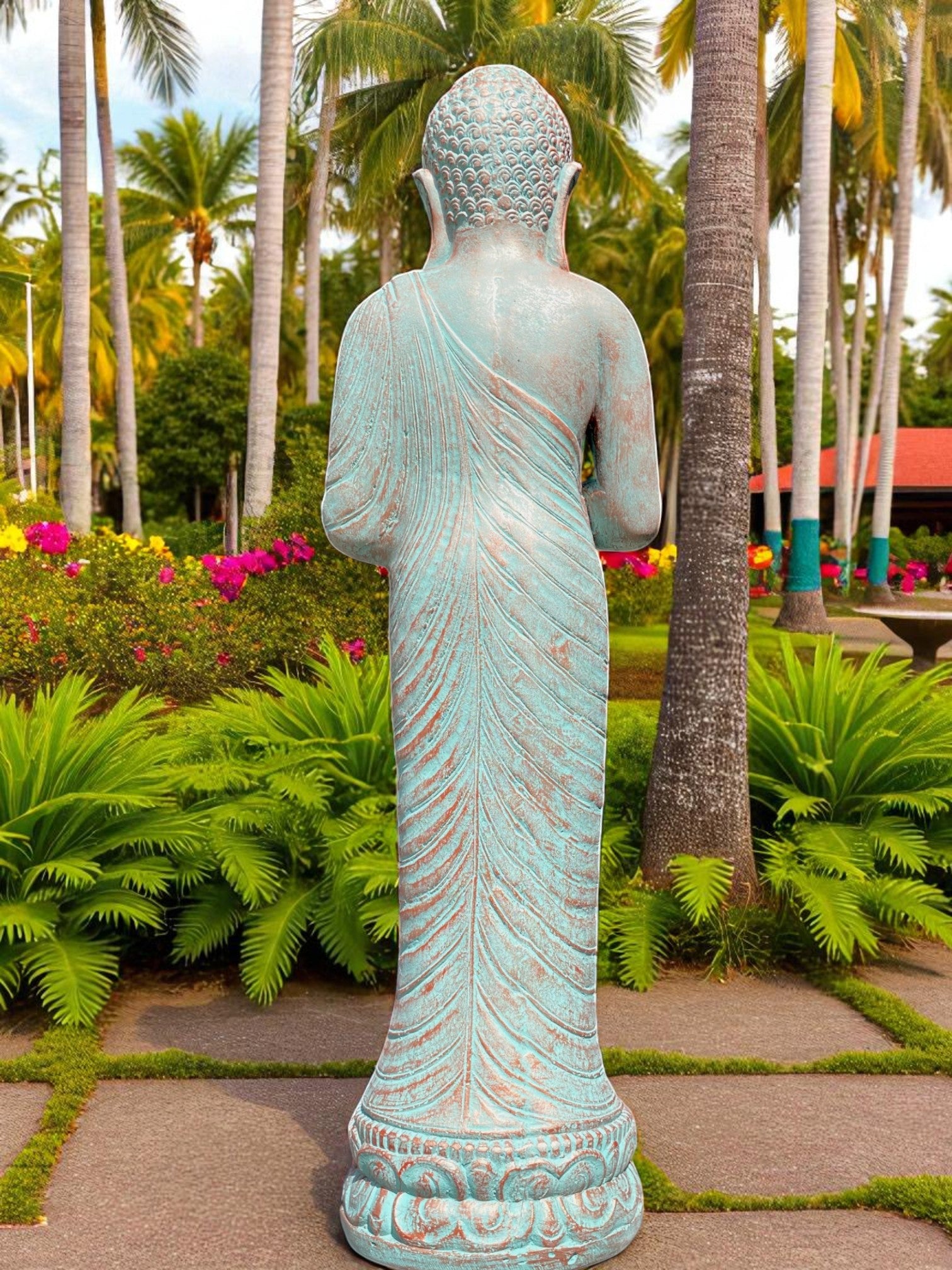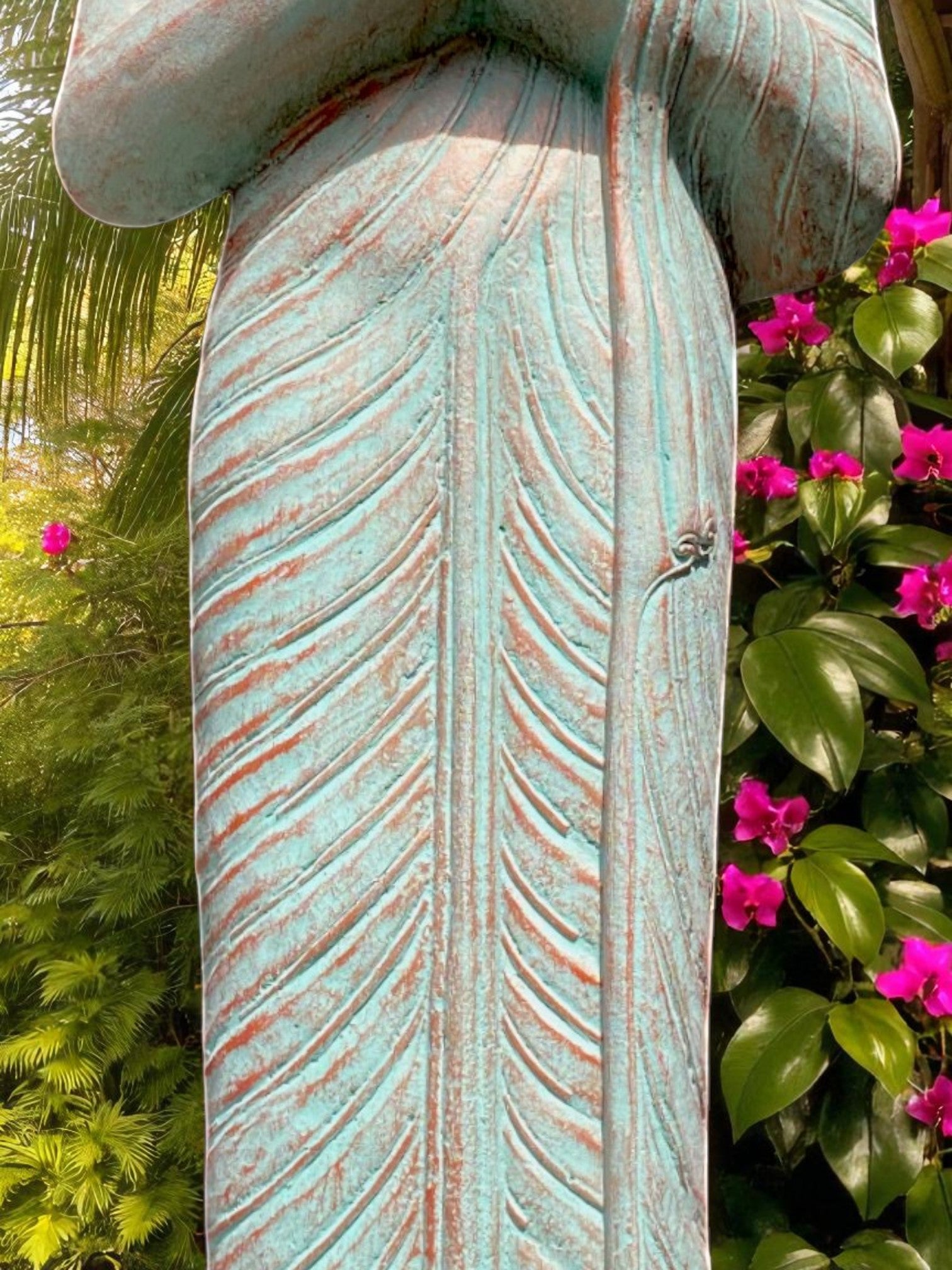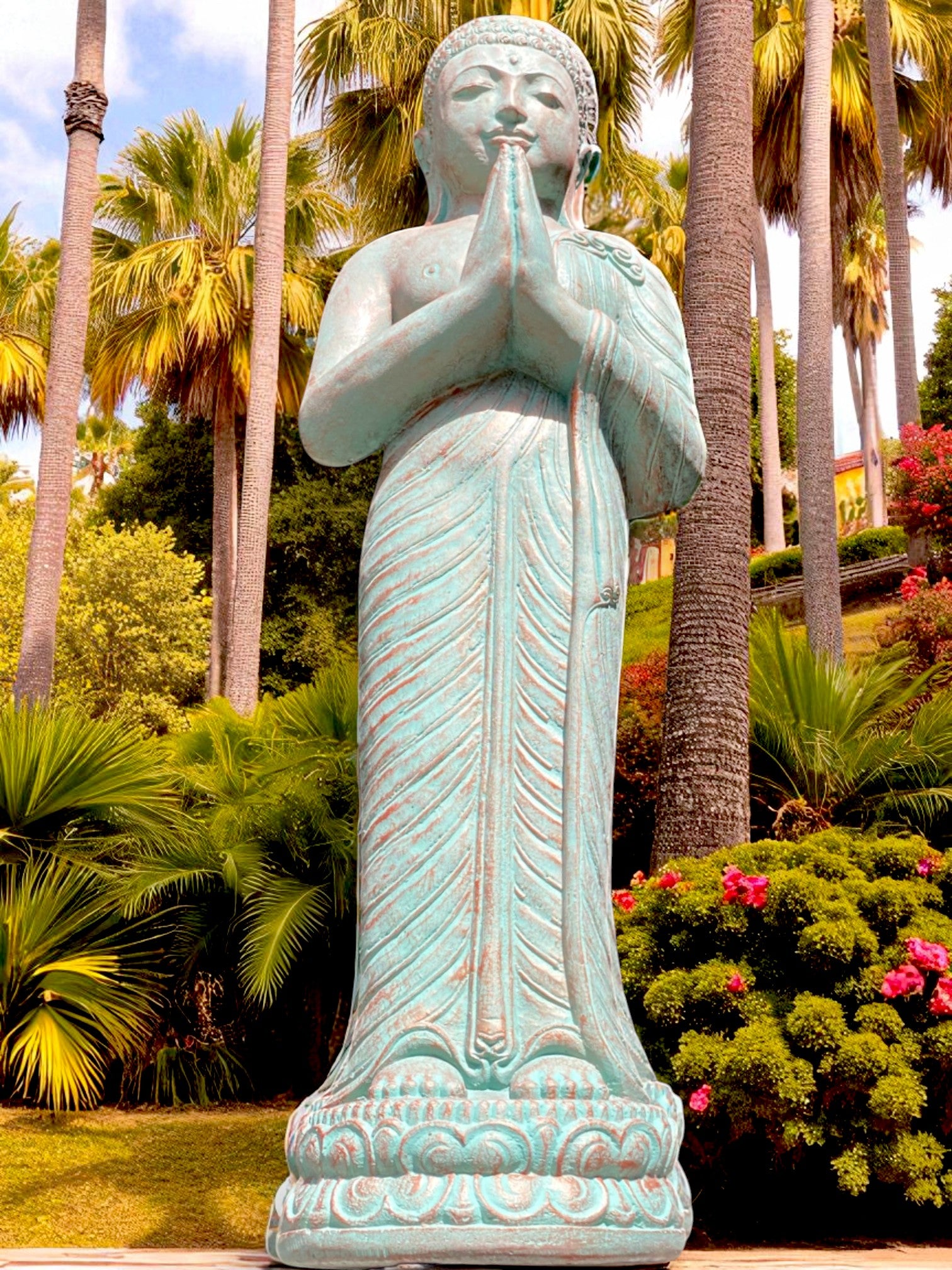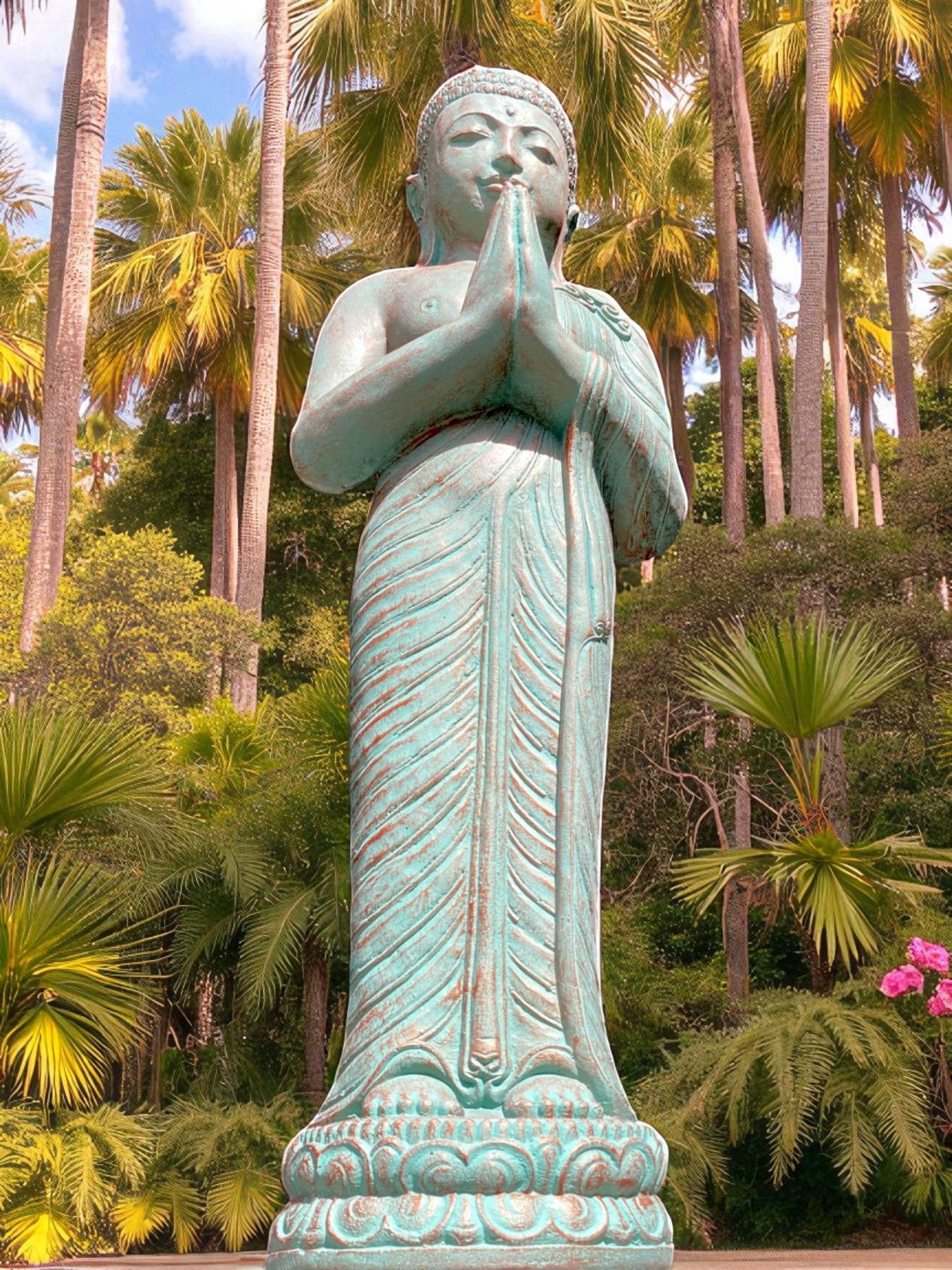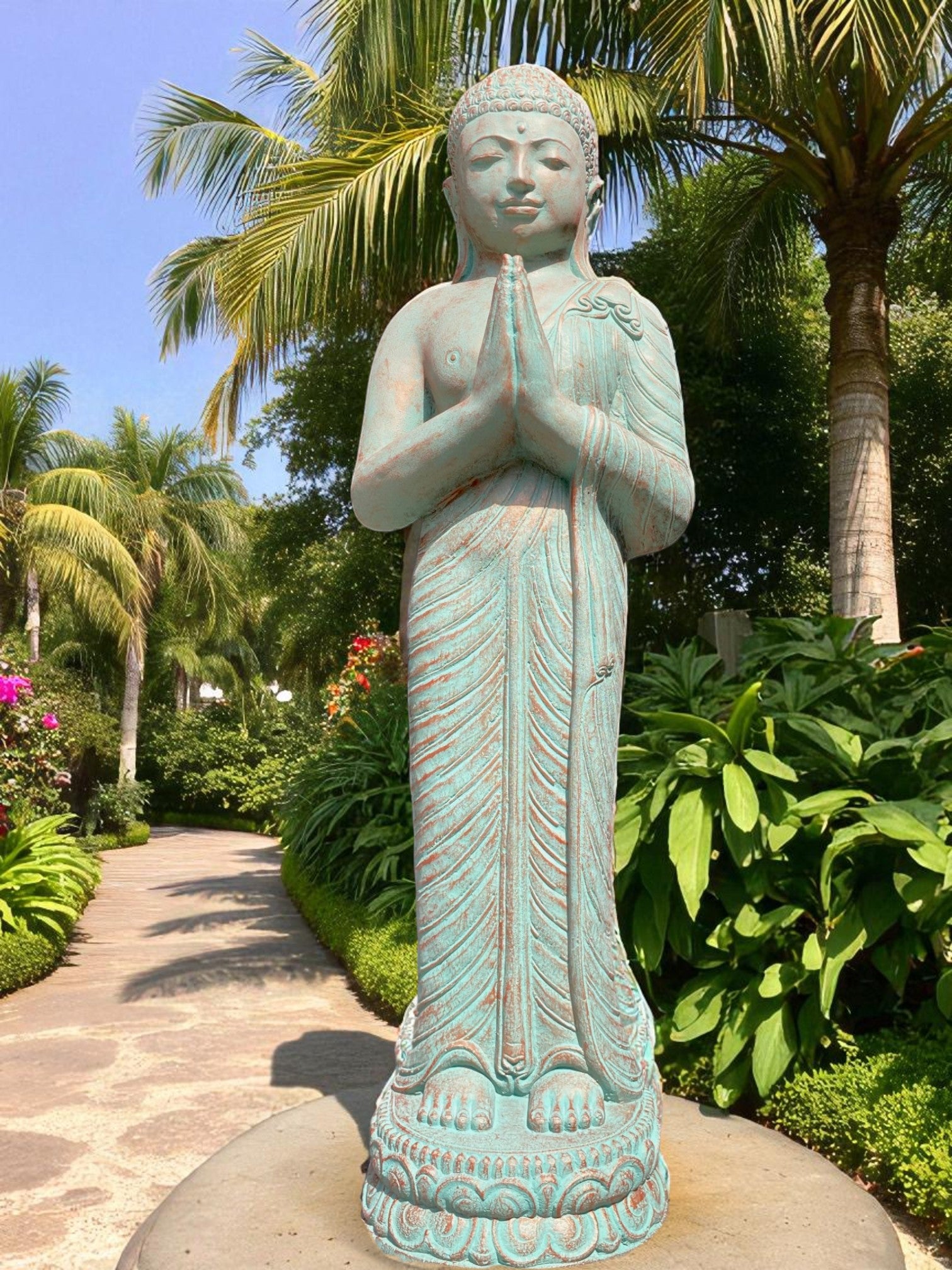 Praying Balinese Buddha statue in a stunning copper green colour. Crafted from concrete, this piece offers the perfect balance of strength, durability, and artistry.