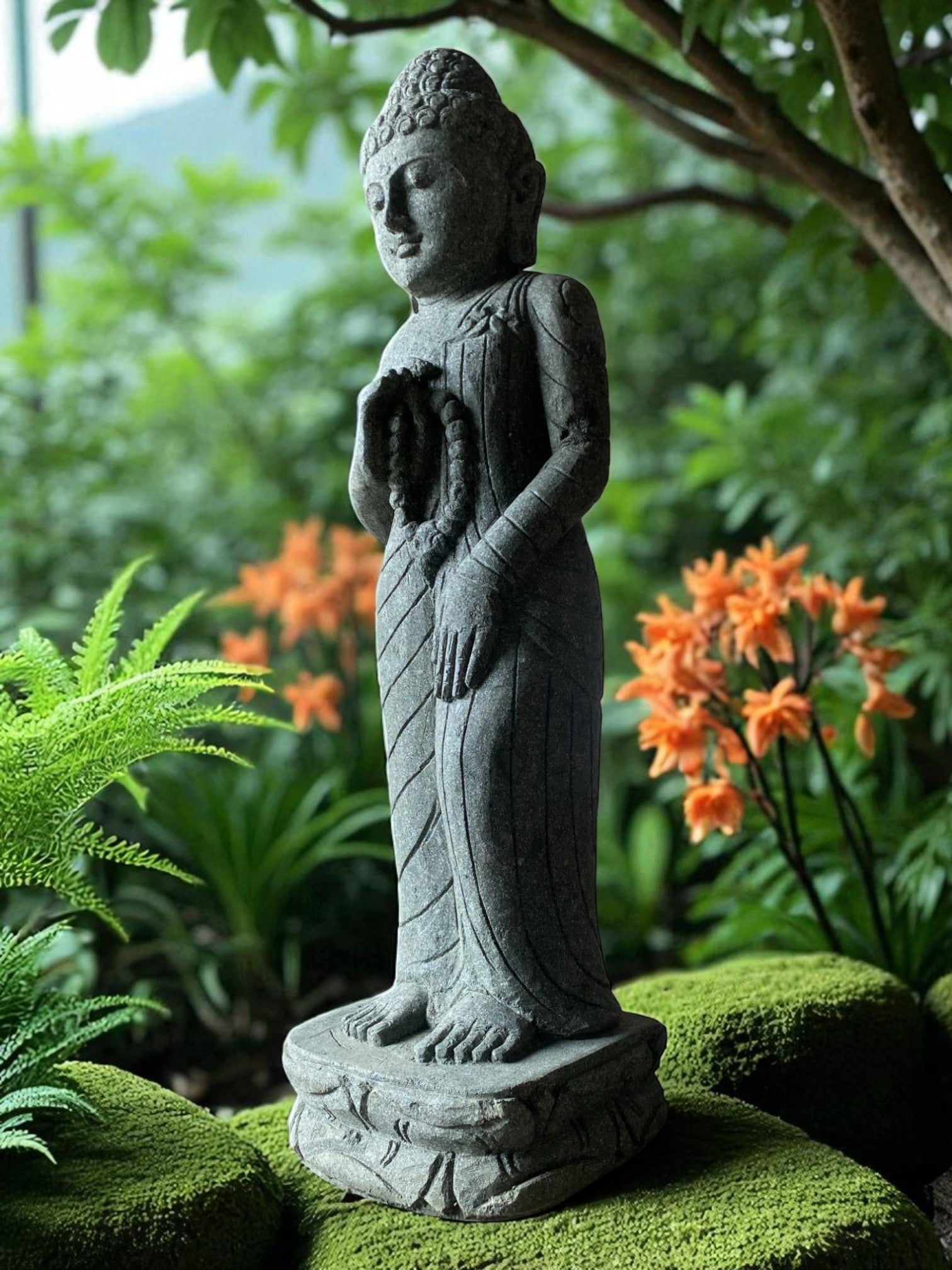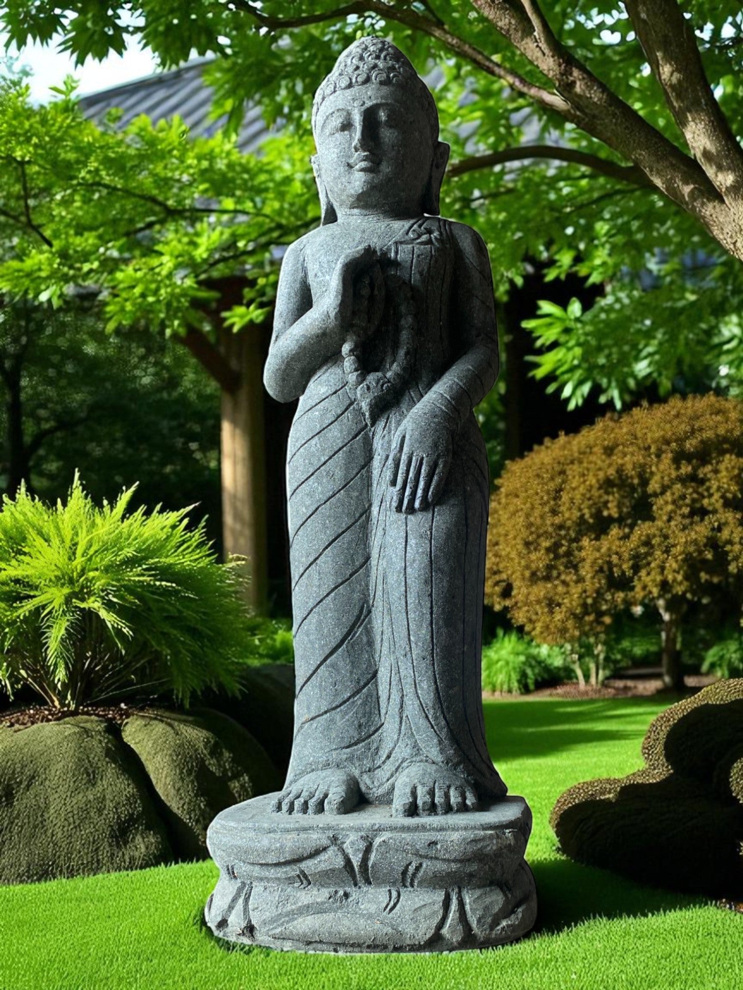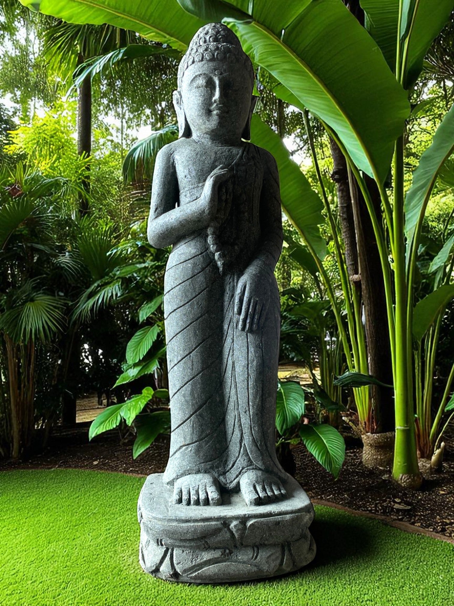 Hand carved Balinese Teaching Buddha statue. Complement your garden landscaping and Outdoor Living with a fully carved from Indonesian Greenstone . Used by landscape architects for outdoor garden and landscaping projects. This is a hand carved Indonesian greenstone piece of art. These look great with a warm white night light mounted at the base of the statue facing upwards, creating shadows and ambience and compliments your outdoor furniture and garden landscaping. Upgrade your garden and landscaping and add value to your home and garden renovation.