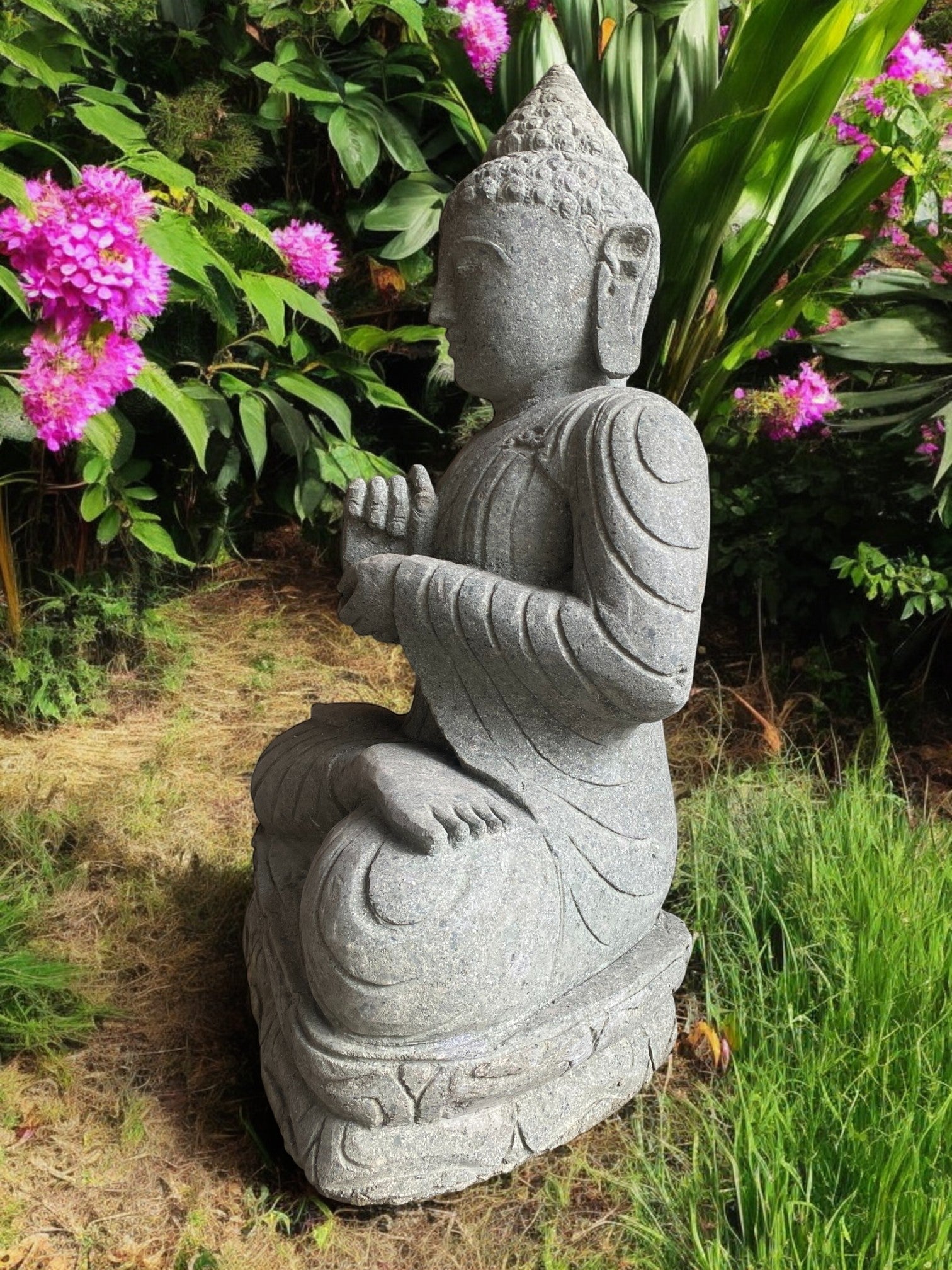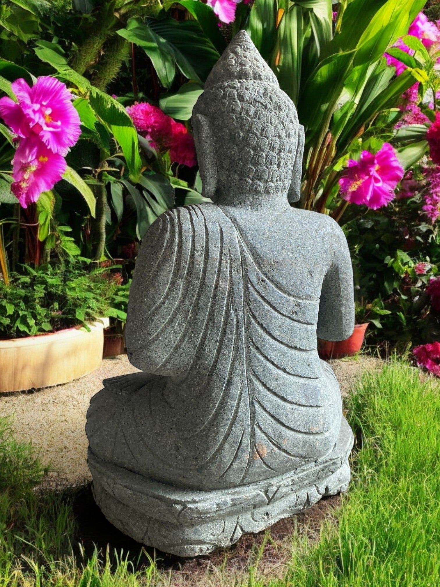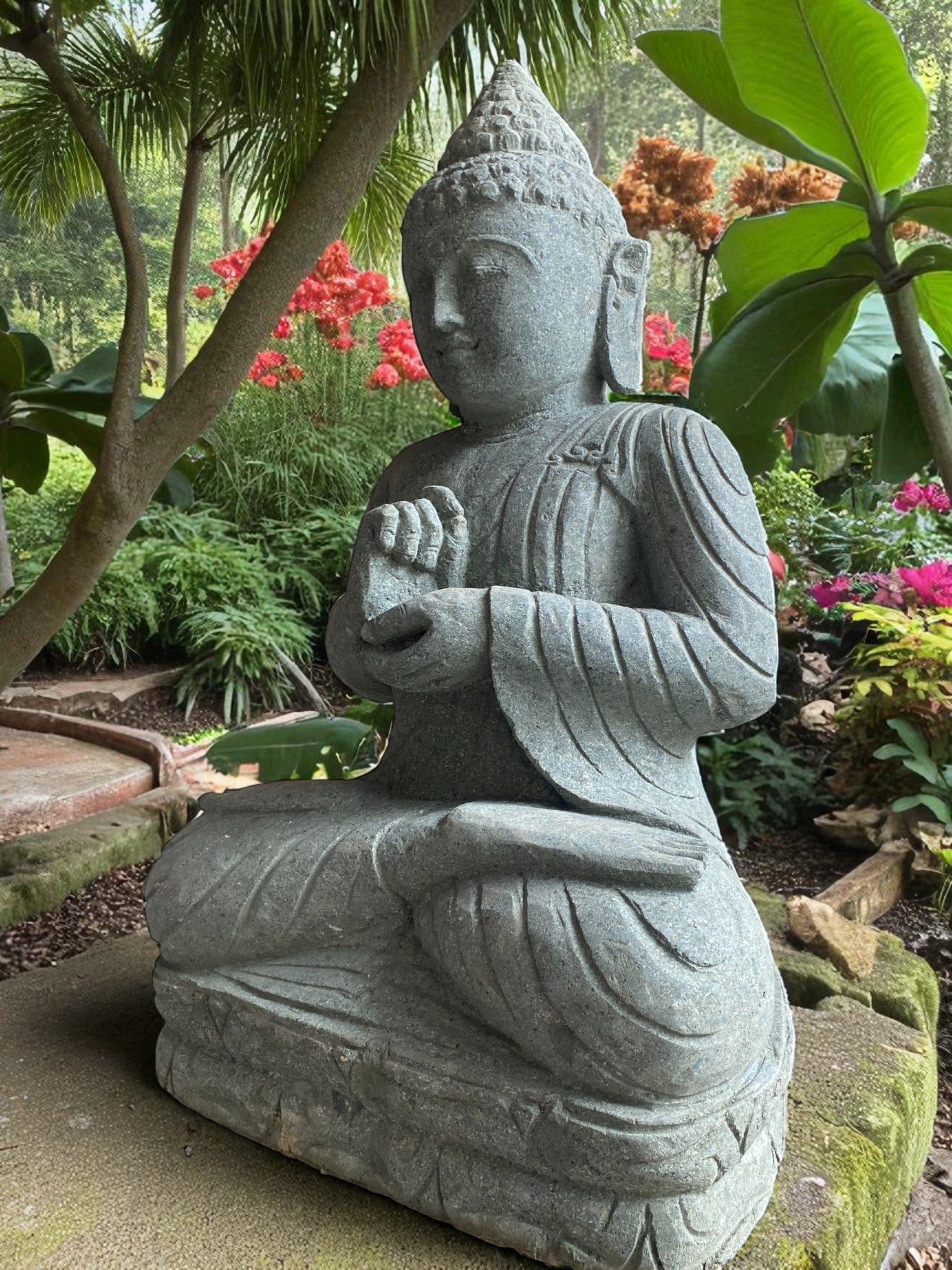 Hand carved Balinese Teaching Buddha statue. Complement your garden landscaping and Outdoor Living with a fully carved from Indonesian Greenstone . Used by landscape architects for outdoor garden and landscaping projects. This is a hand carved Indonesian greenstone piece of art. These look great with a warm white night light mounted at the base of the statue facing upwards, creating shadows and ambience and compliments your outdoor furniture and garden landscaping. Upgrade your garden and landscaping and add value to your home and garden renovation.