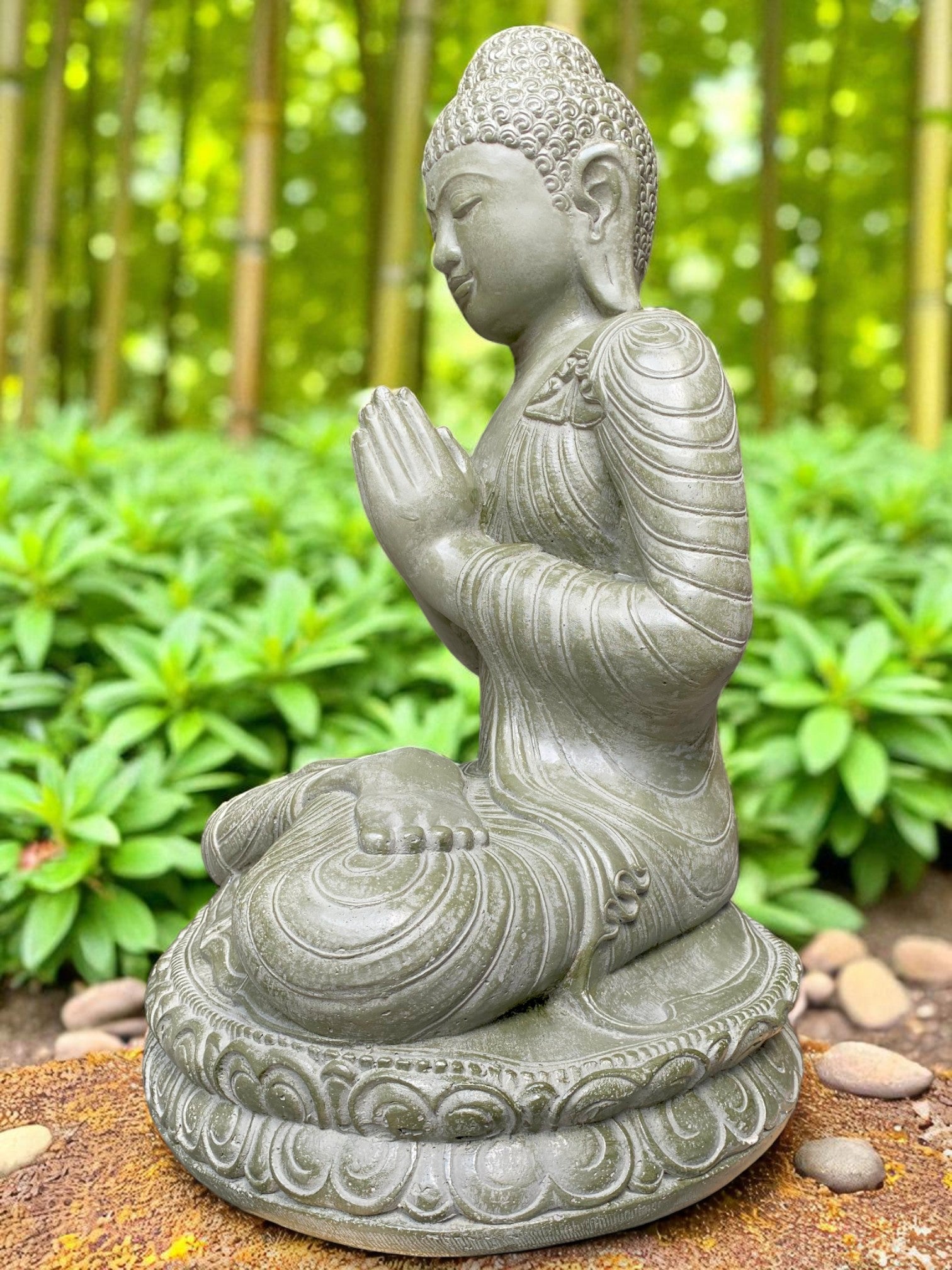 Balinese Praying Buddha statue with front and rear detail. Complement your garden landscaping and Outdoor Living with a Praying or Greeting Buddha Statue . Used by landscape architects for outdoor garden and landscaping projects. This statue fits nicely into any garden. These look great with a warm white night light mounted at the base of the statue facing upwards, creating shadows and ambience and compliments your outdoor furniture and garden landscaping. Upgrade your garden and landscaping and add value to your home and garden renovation. Solid Concrete is great cost effective alternative option for budget Sensitive projects as opposed to luxury hand carved stone.