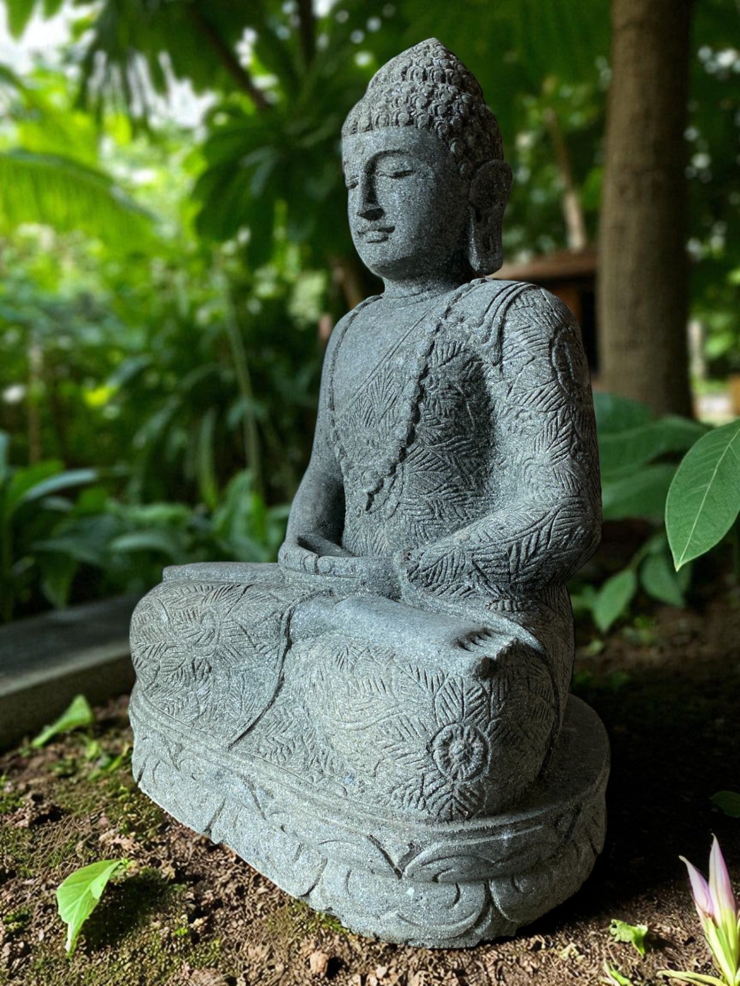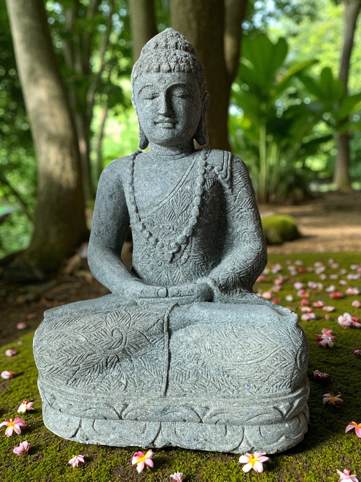 Hand carved Balinese Meditating Buddha statue. Complement your garden landscaping and Outdoor Living with a fully carved from Indonesian Greenstone . Used by landscape architects for outdoor garden and landscaping projects. This is a hand carved Indonesian greenstone piece of art. These look great with a warm white night light mounted at the base of the statue facing upwards, creating shadows and ambience and compliments your outdoor furniture and garden landscaping. Upgrade your garden and landscaping and add value to your home and garden renovation.