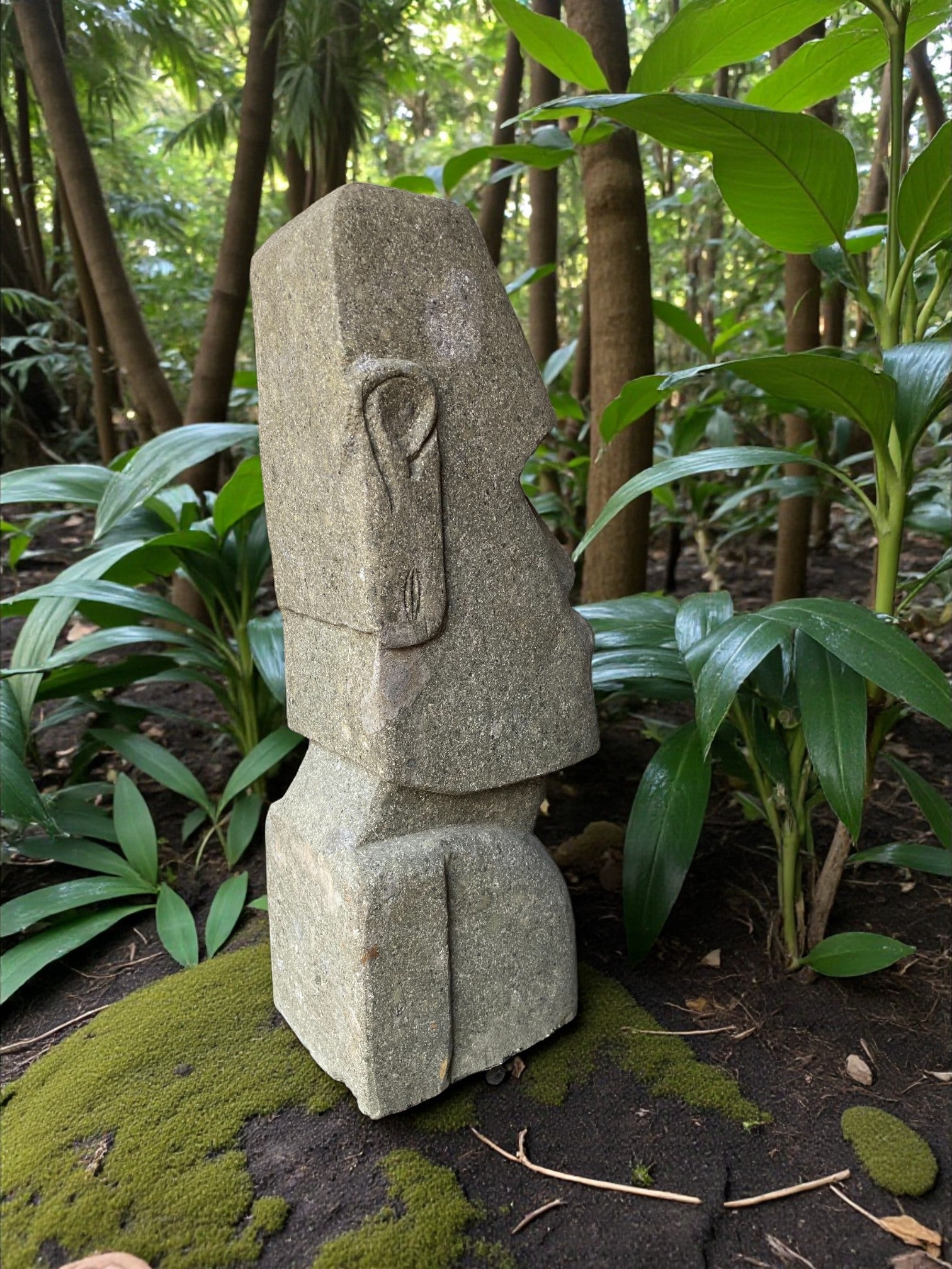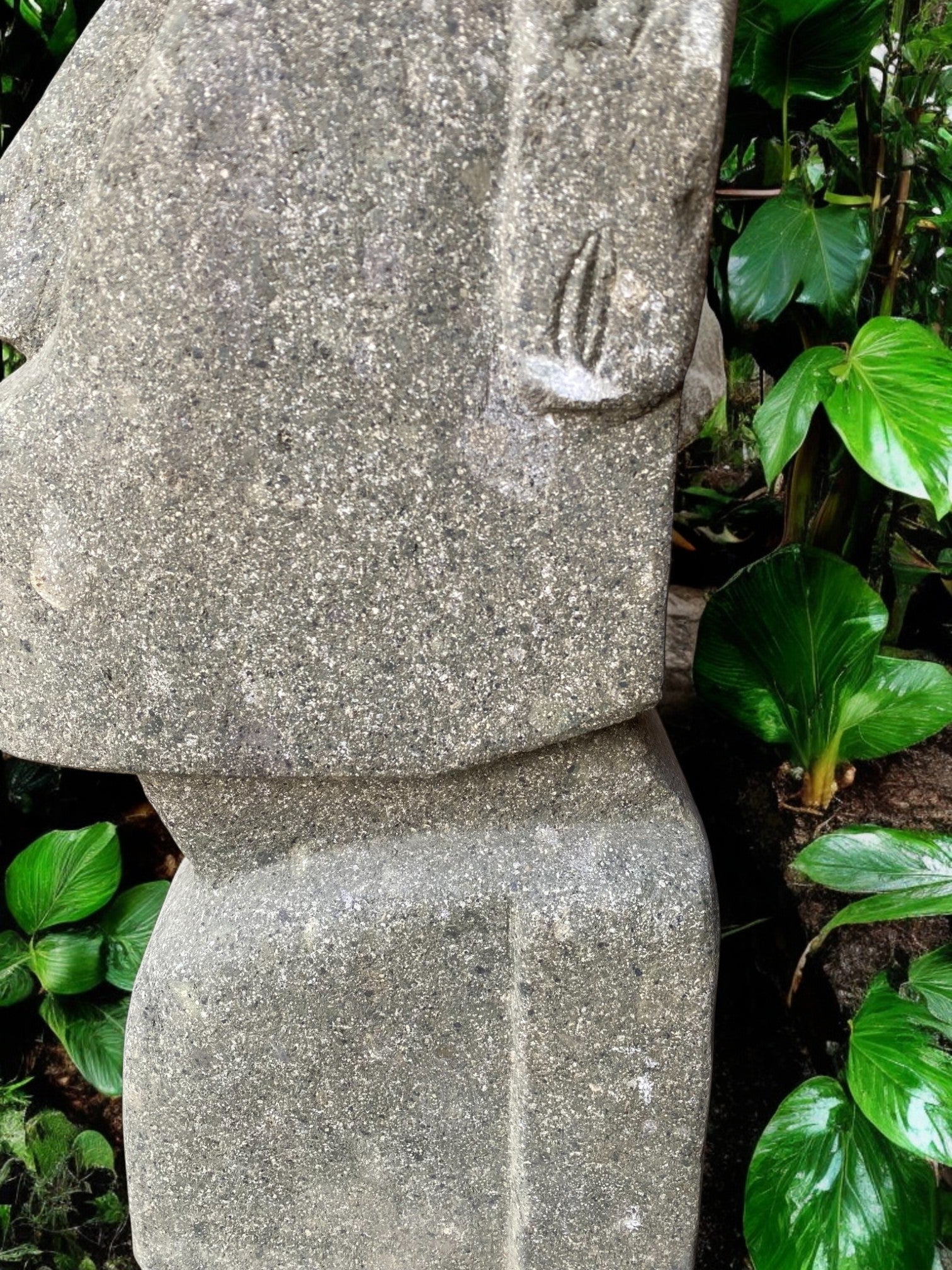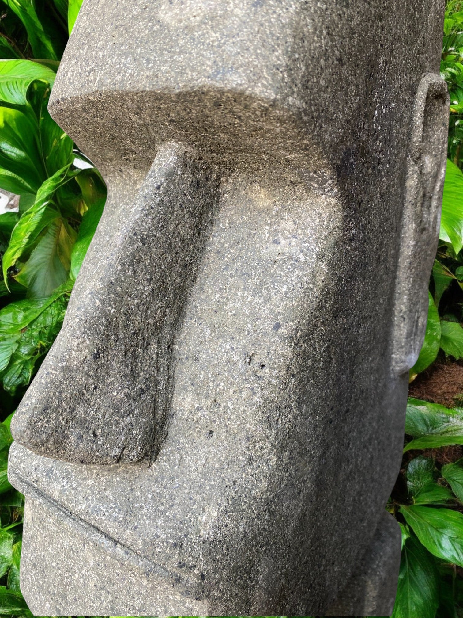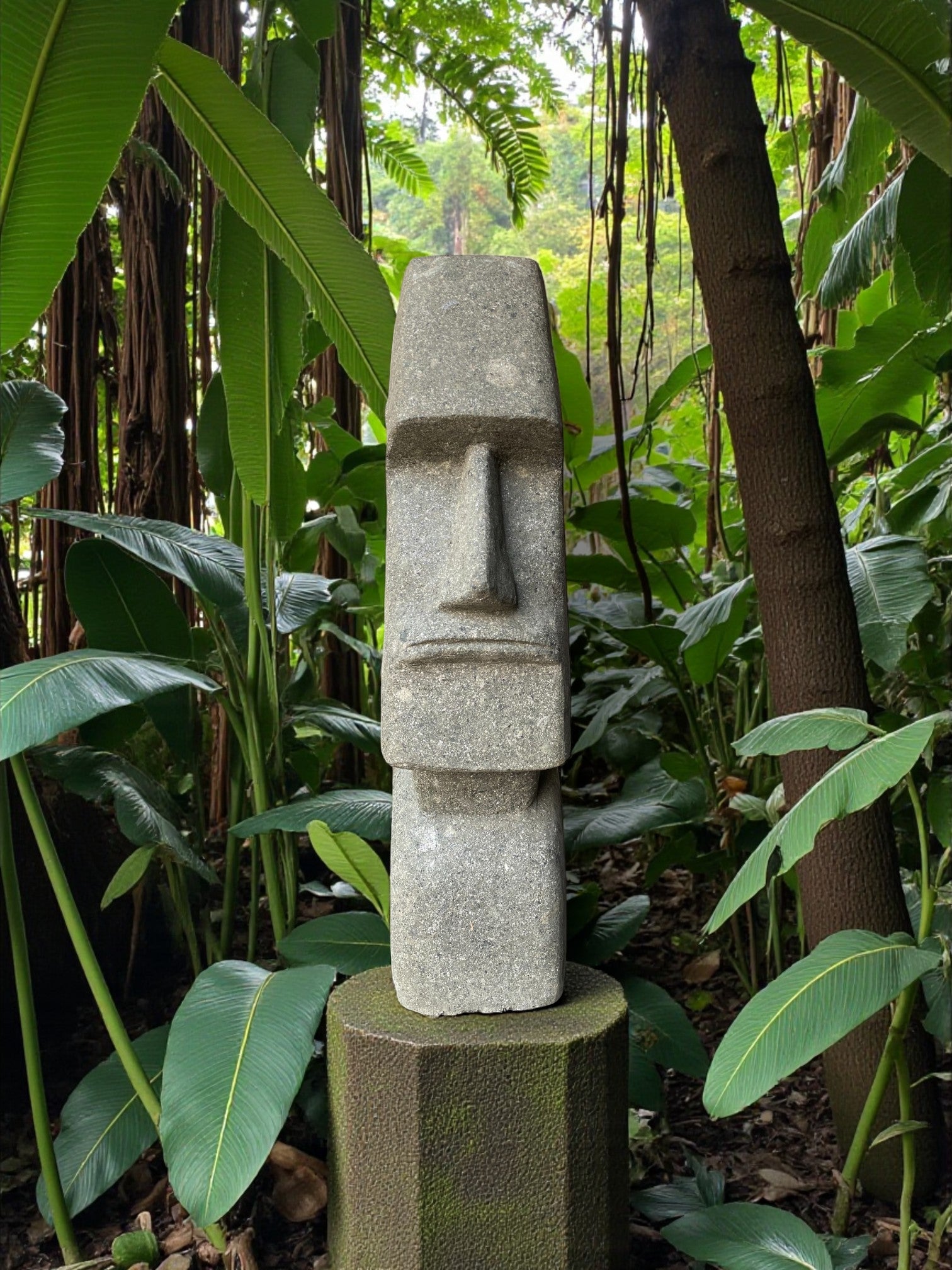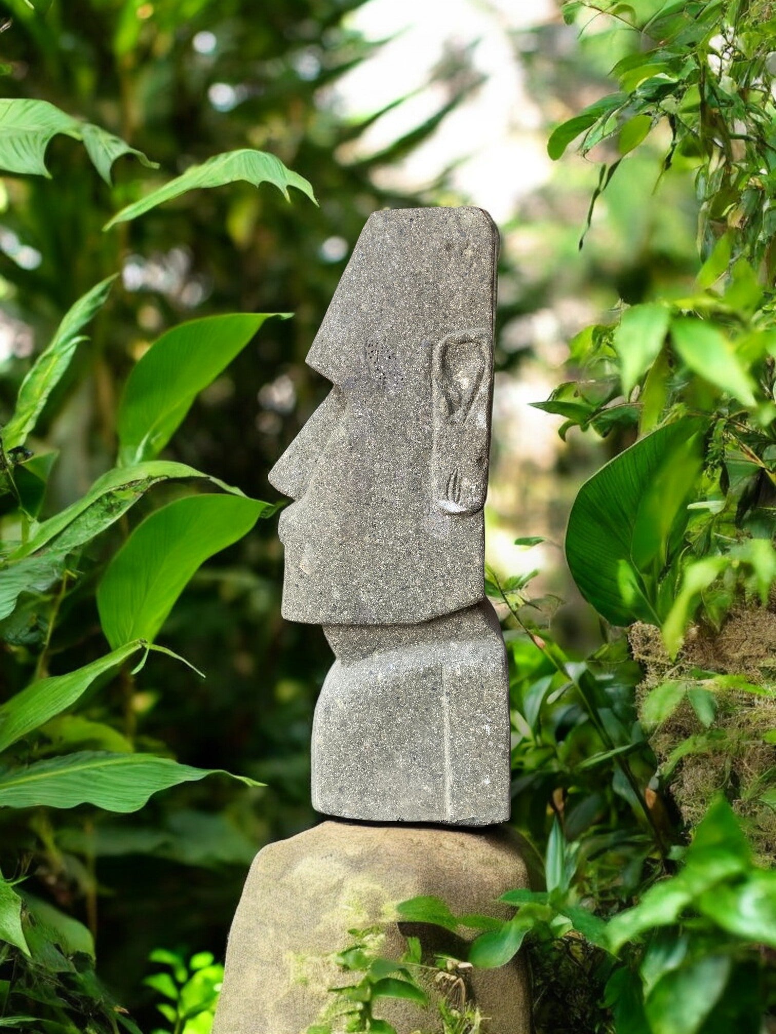 Hand carved Stone Easter Island Rapanui statue. Complement your garden with a hand carved Indonesian garden sculpture hand crafted from Indonesian greenstone. Easter Island is famous for its 887 extant monumental statues, called moai, created by the early Rapa Nui people. These look great with a night light mounted at the base of the statue facing upwards, creating shadows and ambience and compliments your outdoor furniture and garden landscaping.