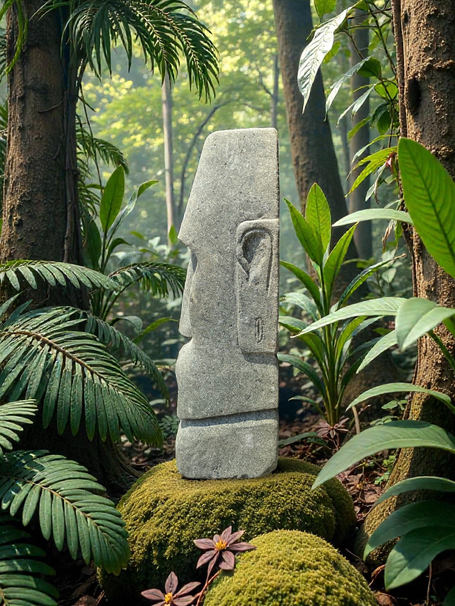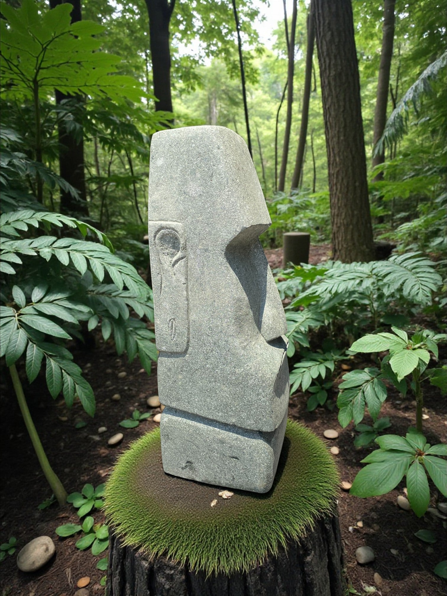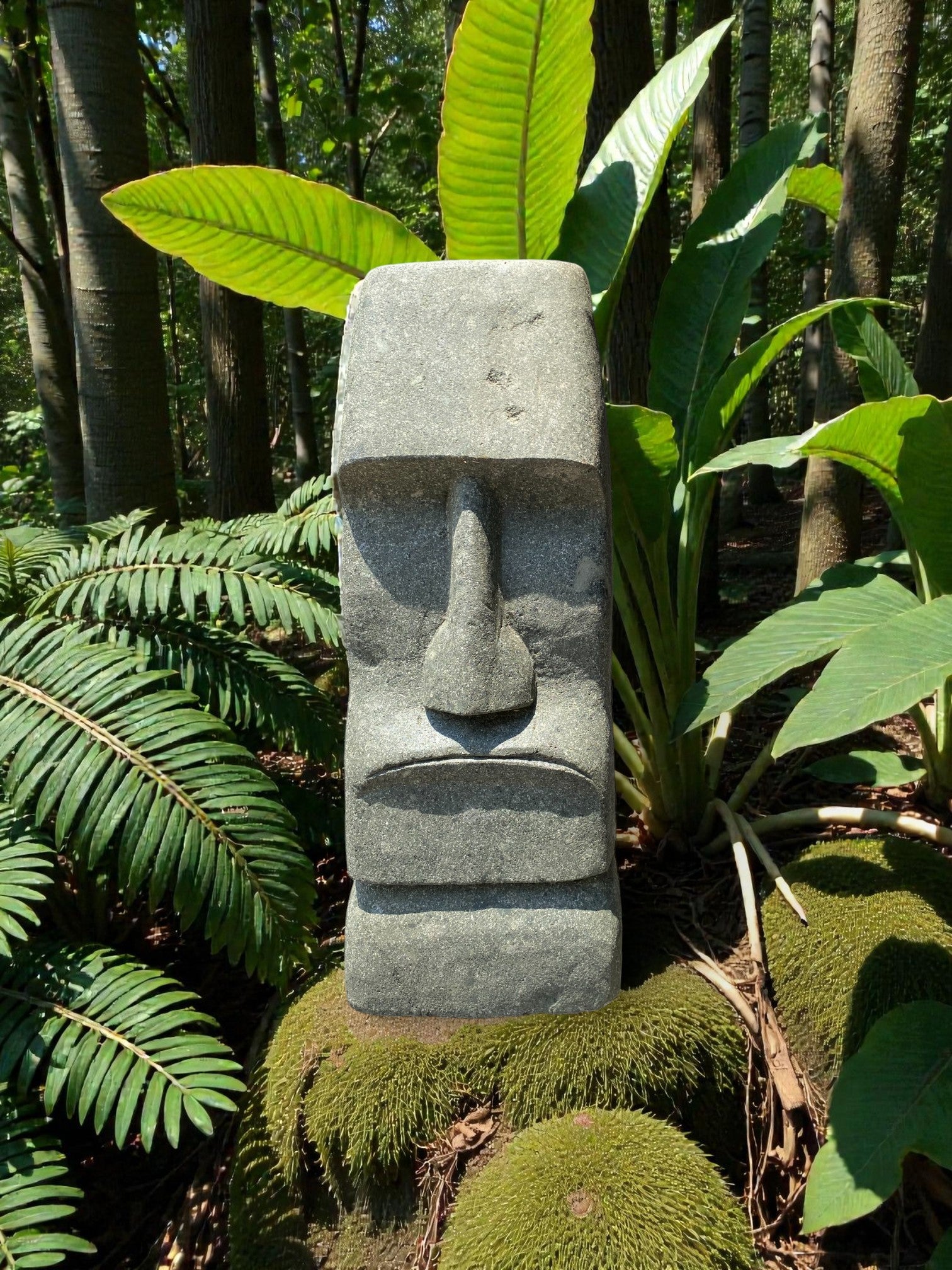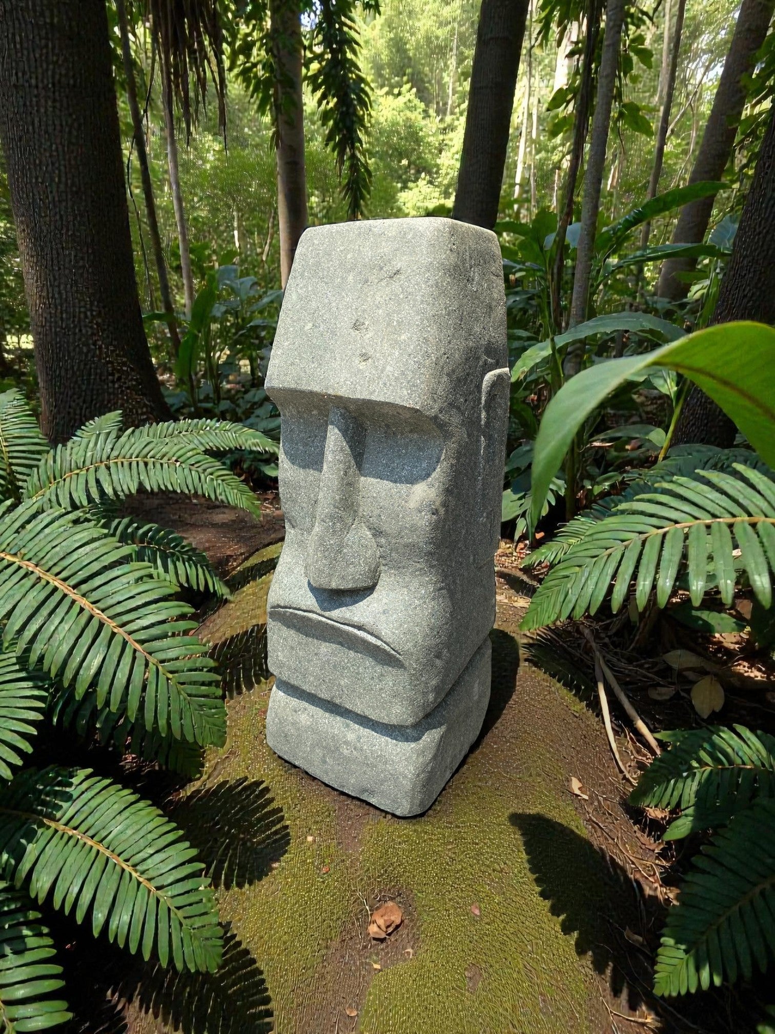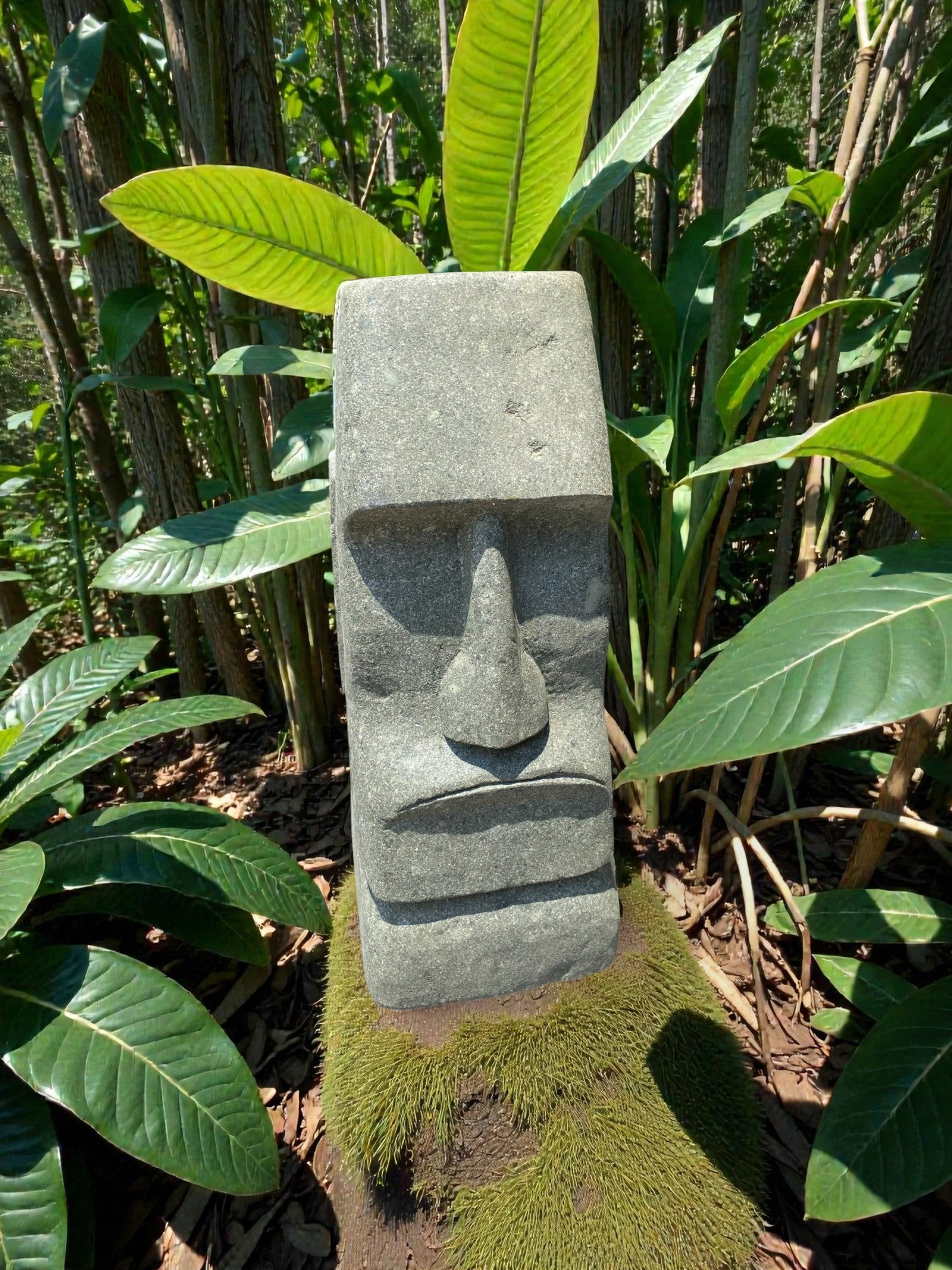 Hand carved Stone Easter Island Rapanui statue. Complement your garden with a hand carved Indonesian garden sculpture hand crafted from Indonesian greenstone. Easter Island is famous for its 887 extant monumental statues, called moai, created by the early Rapa Nui people. These look great with a night light mounted at the base of the statue facing upwards, creating shadows and ambience and compliments your outdoor furniture and garden landscaping.