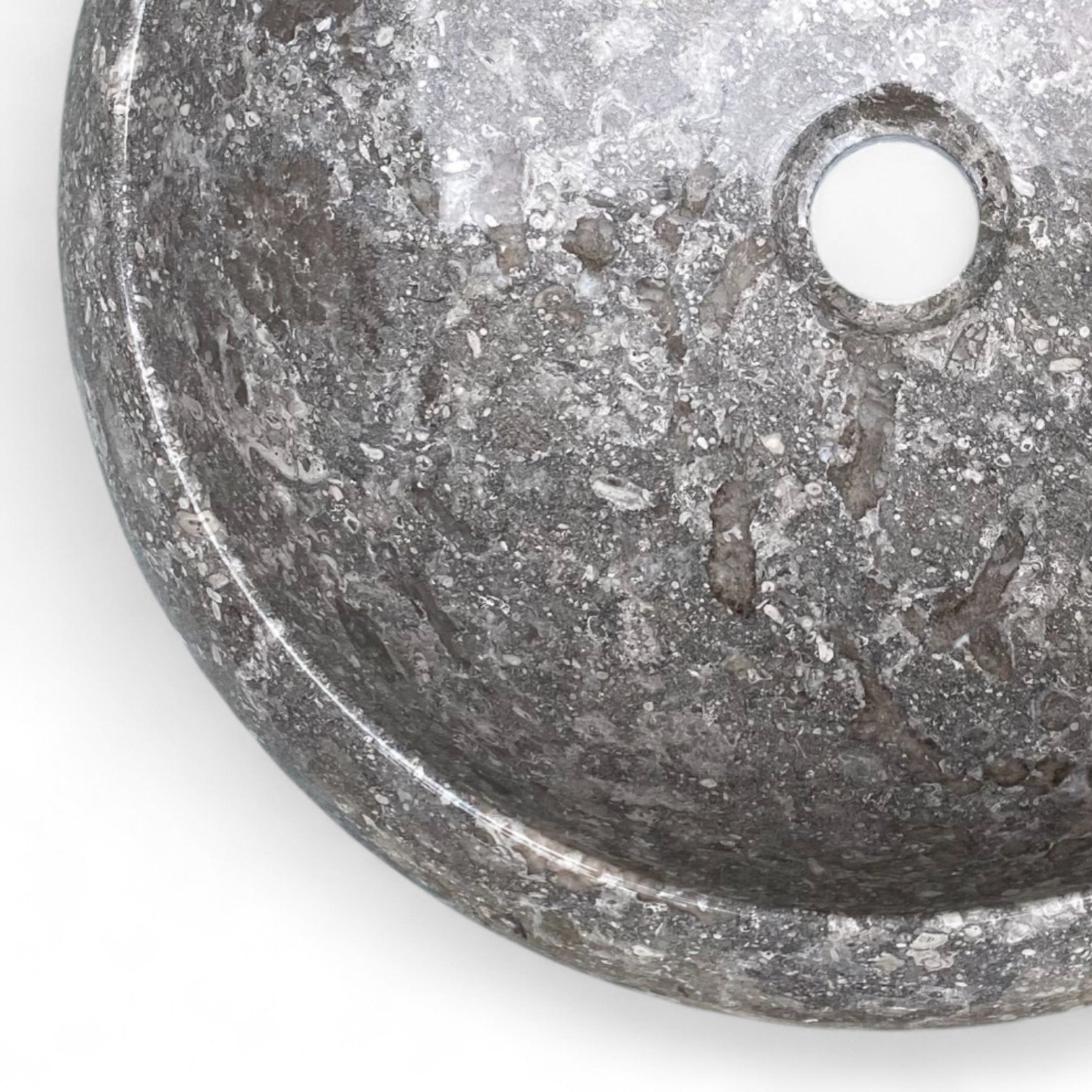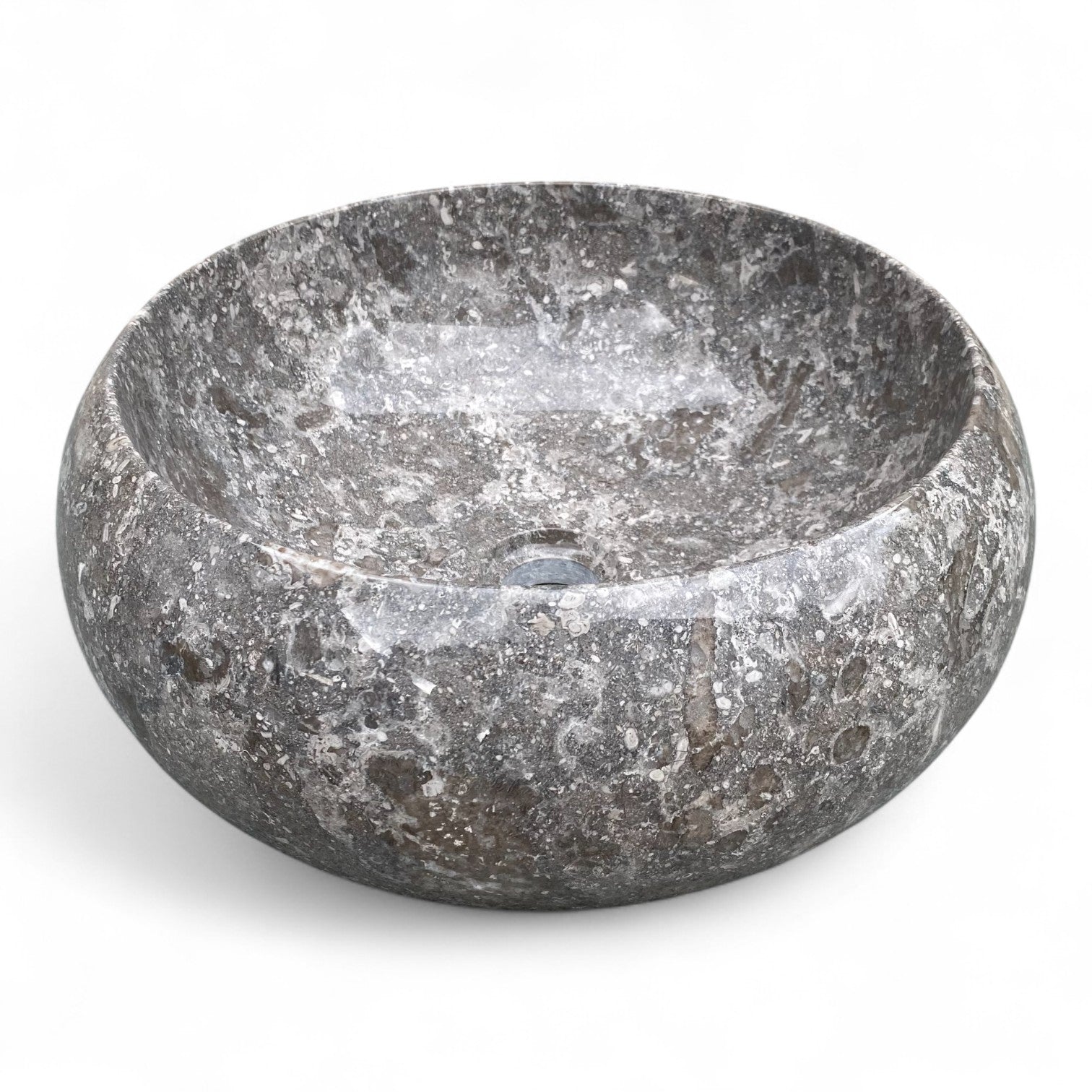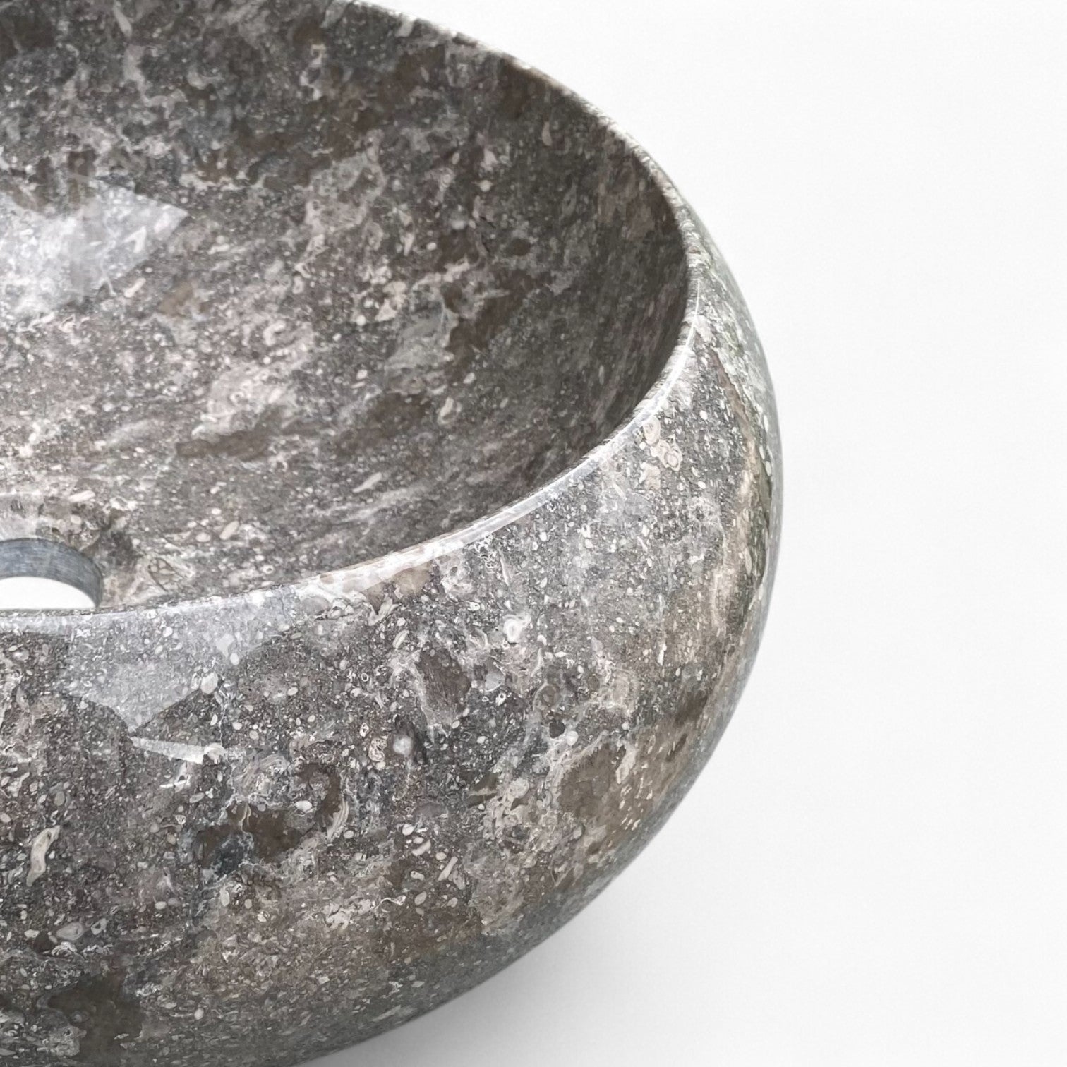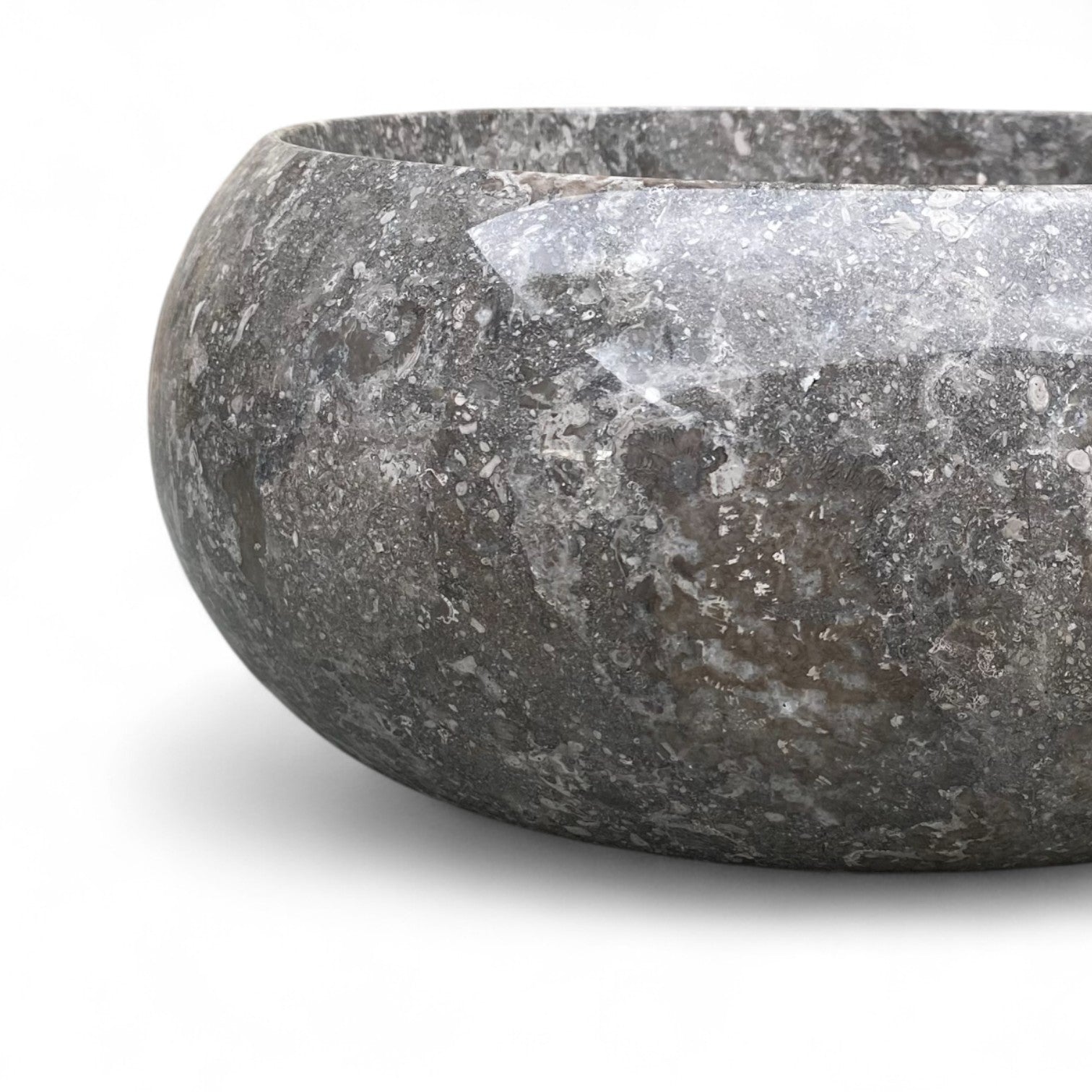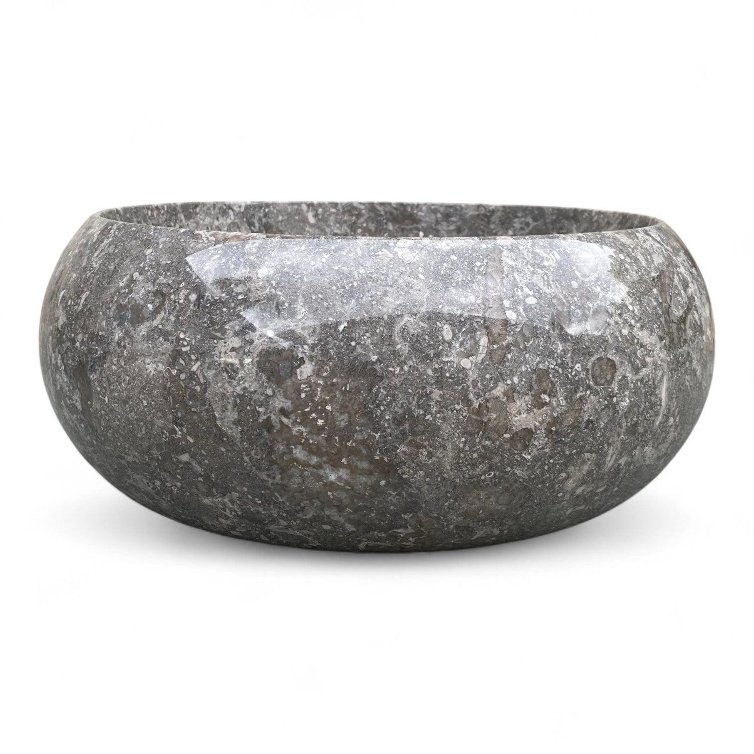 A beautifully hand-carved dark grey marble basin featuring a smooth, glossy finish inside and out. "The Round Shape Marble Basin" design creates a modern yet natural aesthetic, highlighting the elegant stone pattern unique to each piece.