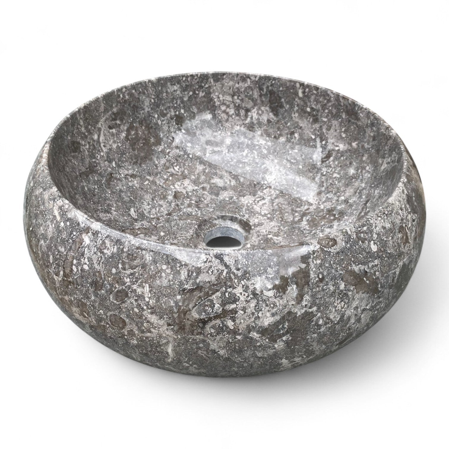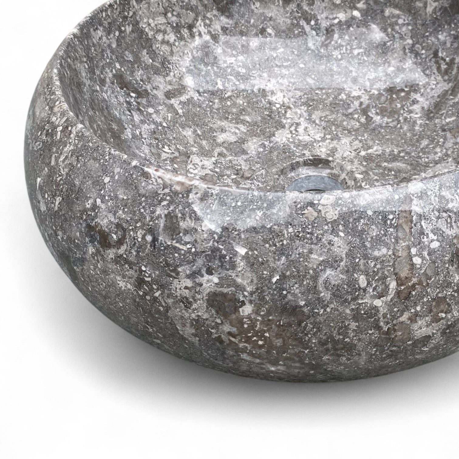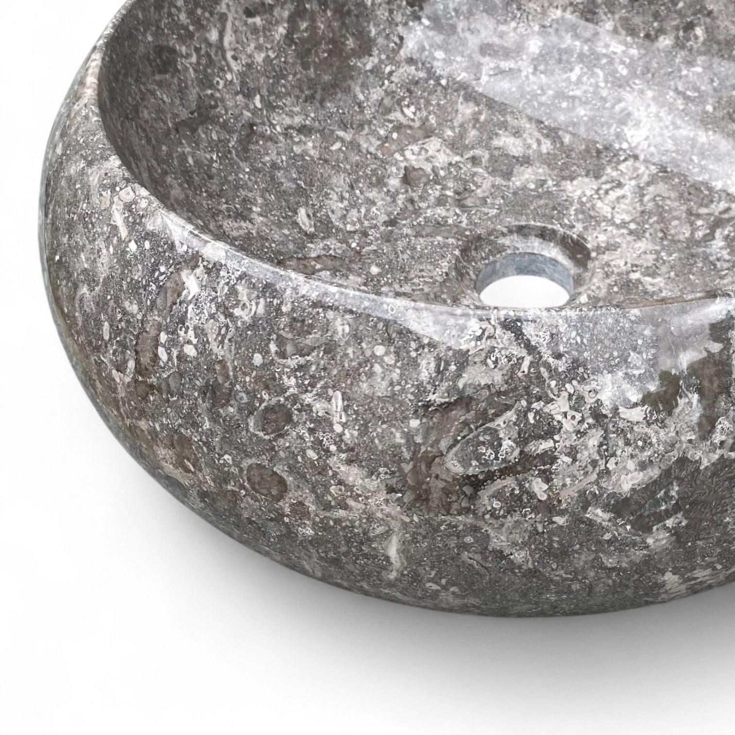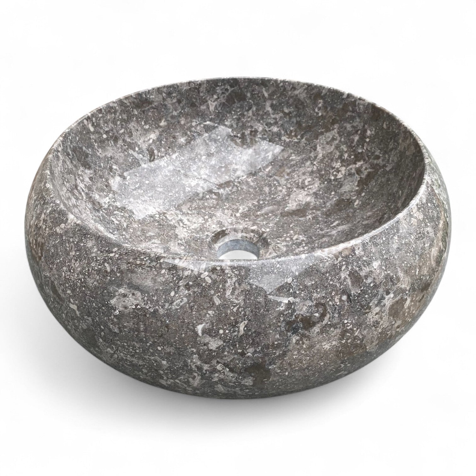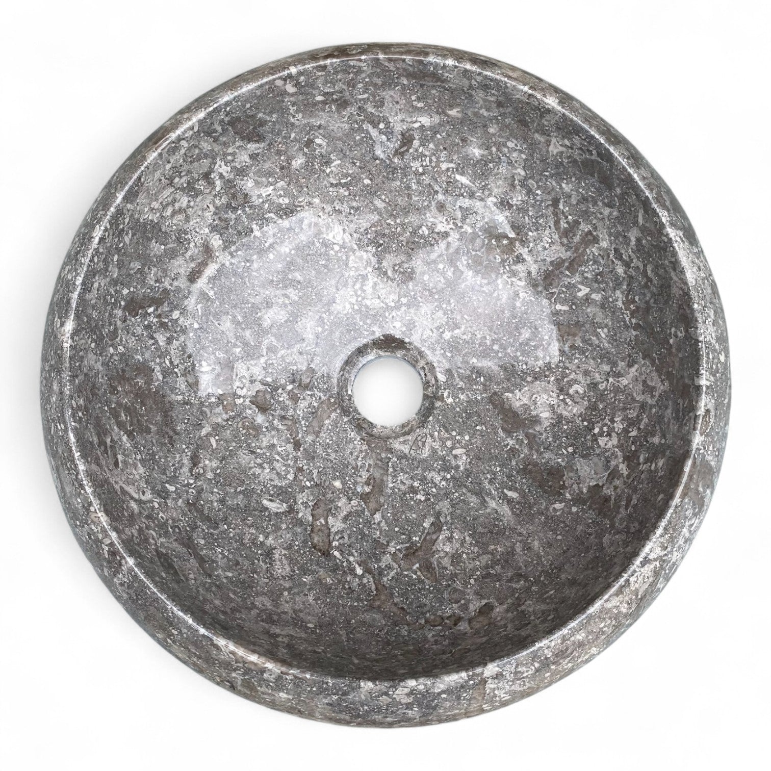 A beautifully hand-carved dark grey marble basin featuring a smooth, glossy finish inside and out. "The Round Shape Marble Basin" design creates a modern yet natural aesthetic, highlighting the elegant stone pattern unique to each piece.