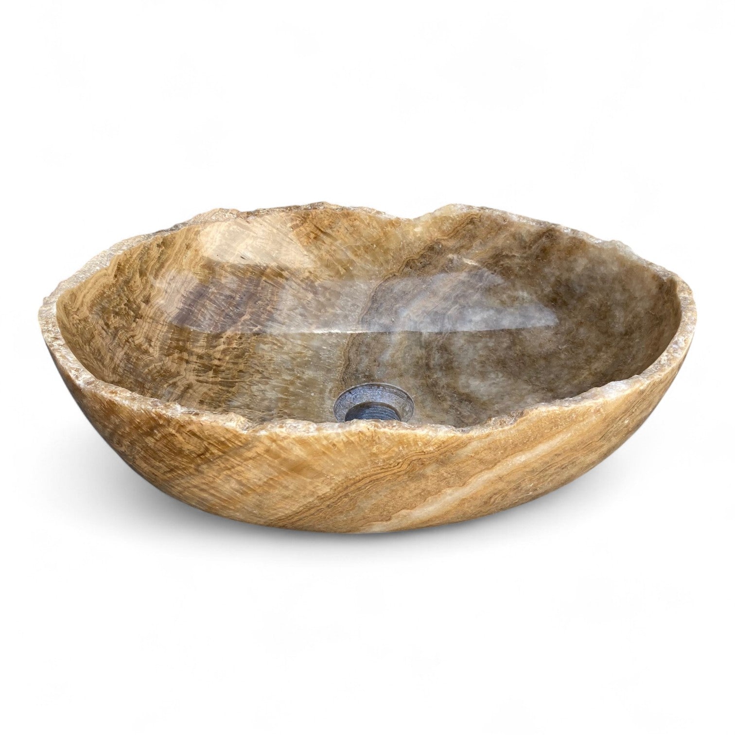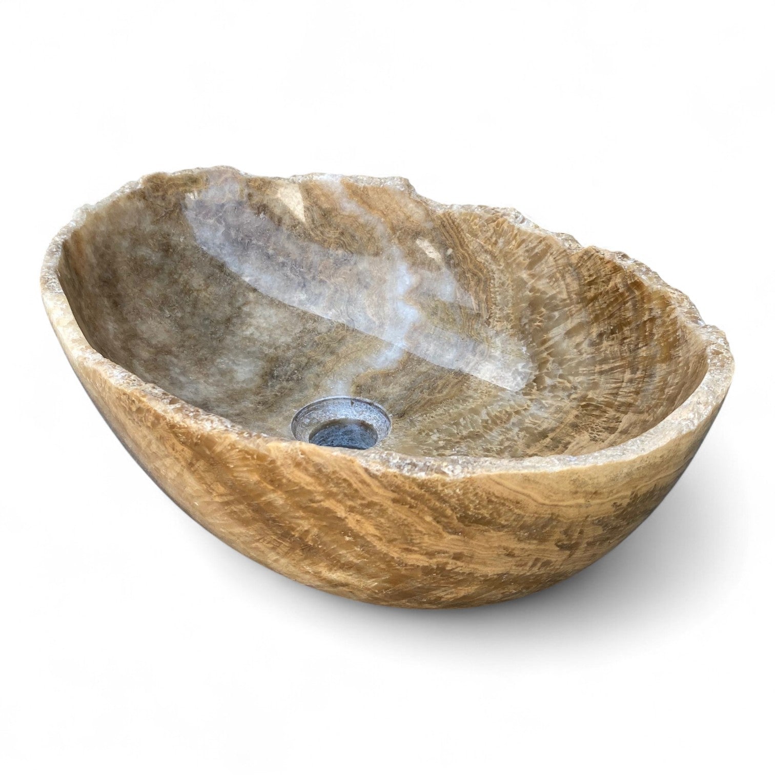 Rare Onyx colour and Irregular raw edge bathroom sink, with polished exterior & interior. Big enough for washing hands and brushing teeth. All of our Onyx Stone bathroom basins require a 32mm Pop up waste without overflow. Complement the StoneBase Onyx vessel basin sink with one of our stone bathroom accessories like the Soap & Lotion dispenser or Moisturiser dispenser with Chrome, Copper, Black or Brass look pump, soap dish or toothbrush / toothpaste holder to finish. StoneBase vessel basins are perfect for standard size bathroom or toilet or powder room spaces, offering both practicality and aesthetic appeal. It's always best practice to check our measurements to see if these work with your space requirements