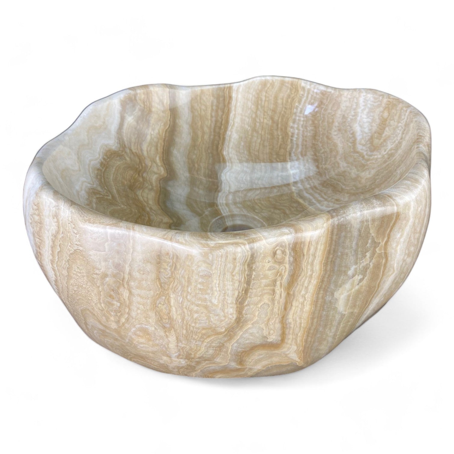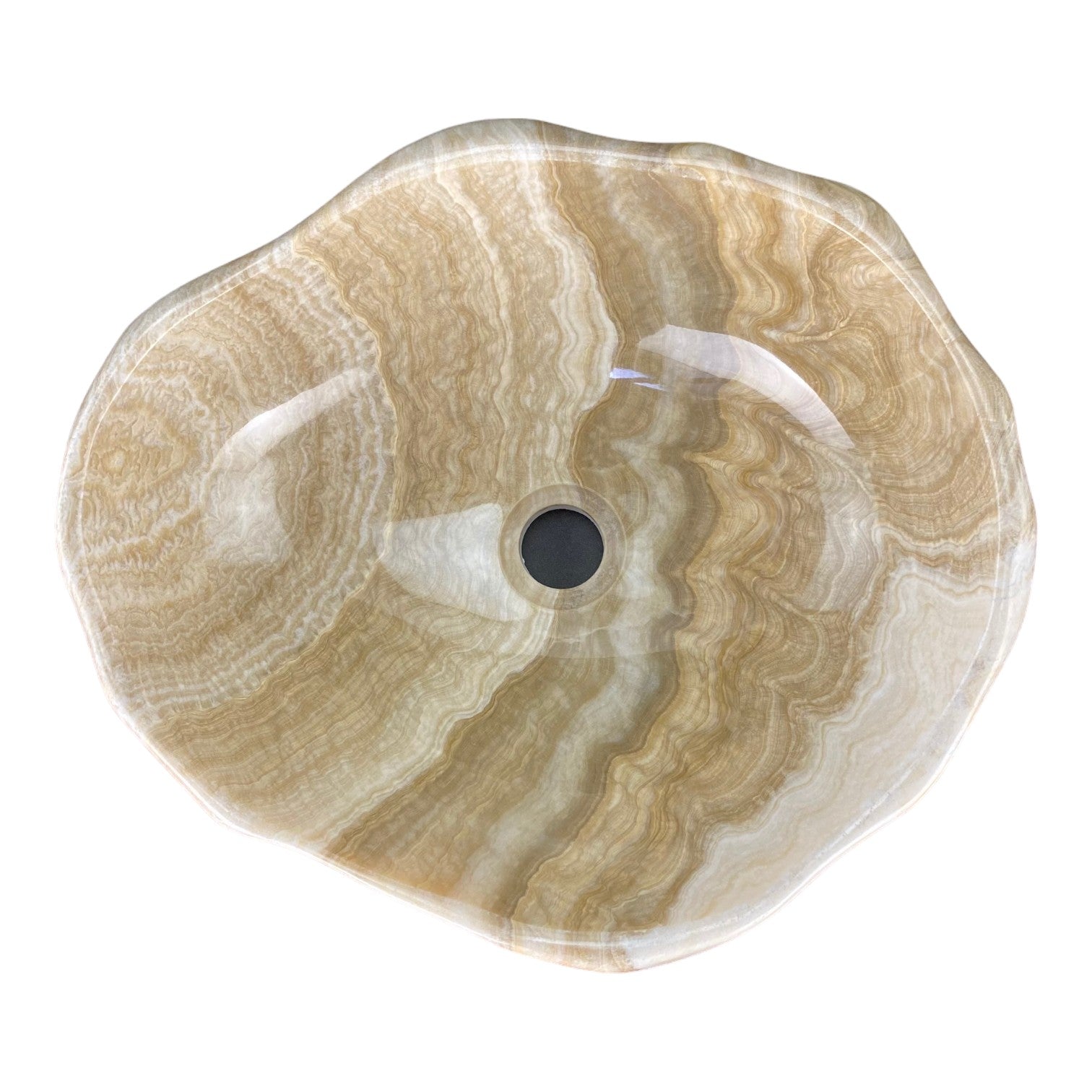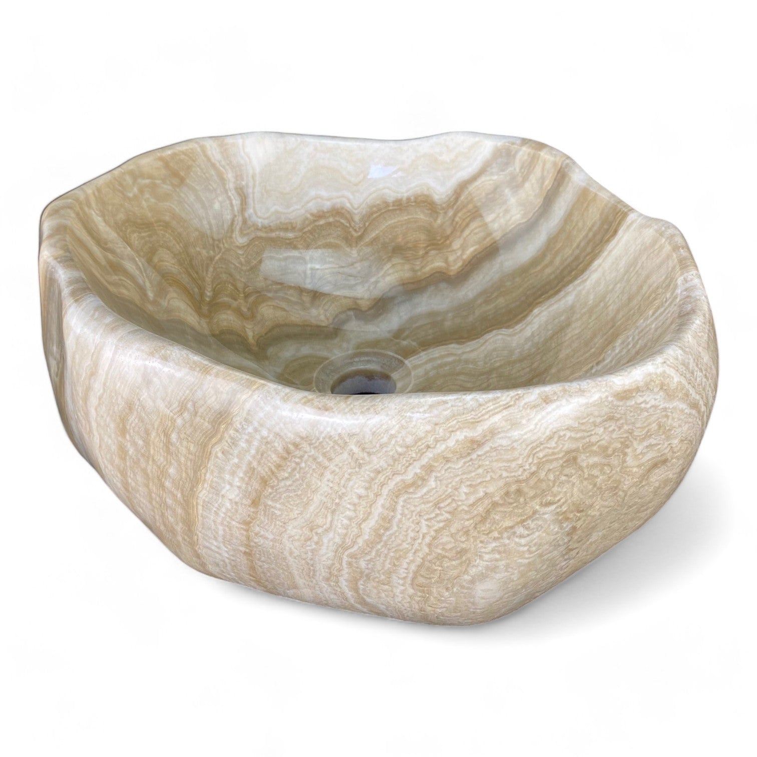 Rare Onyx colour and shape combination, with polished exterior & interior. All of our Onyx Stone bathroom basins require a 32mm Pop up waste without overflow. Complement the StoneBase bathroom Onyx sink with one of our stone bathroom accessories like the Soap & Lotion dispenser or Moisturiser dispenser with Chrome, Copper, Black or Brass look pump, soap dish or toothbrush / toothpaste holder to finish. StoneBase vessel basins are perfect for standard size bathroom or toilet or powder room spaces, offering both practicality and aesthetic appeal. It's always best practice to check our measurements to see if these work with your space requirements