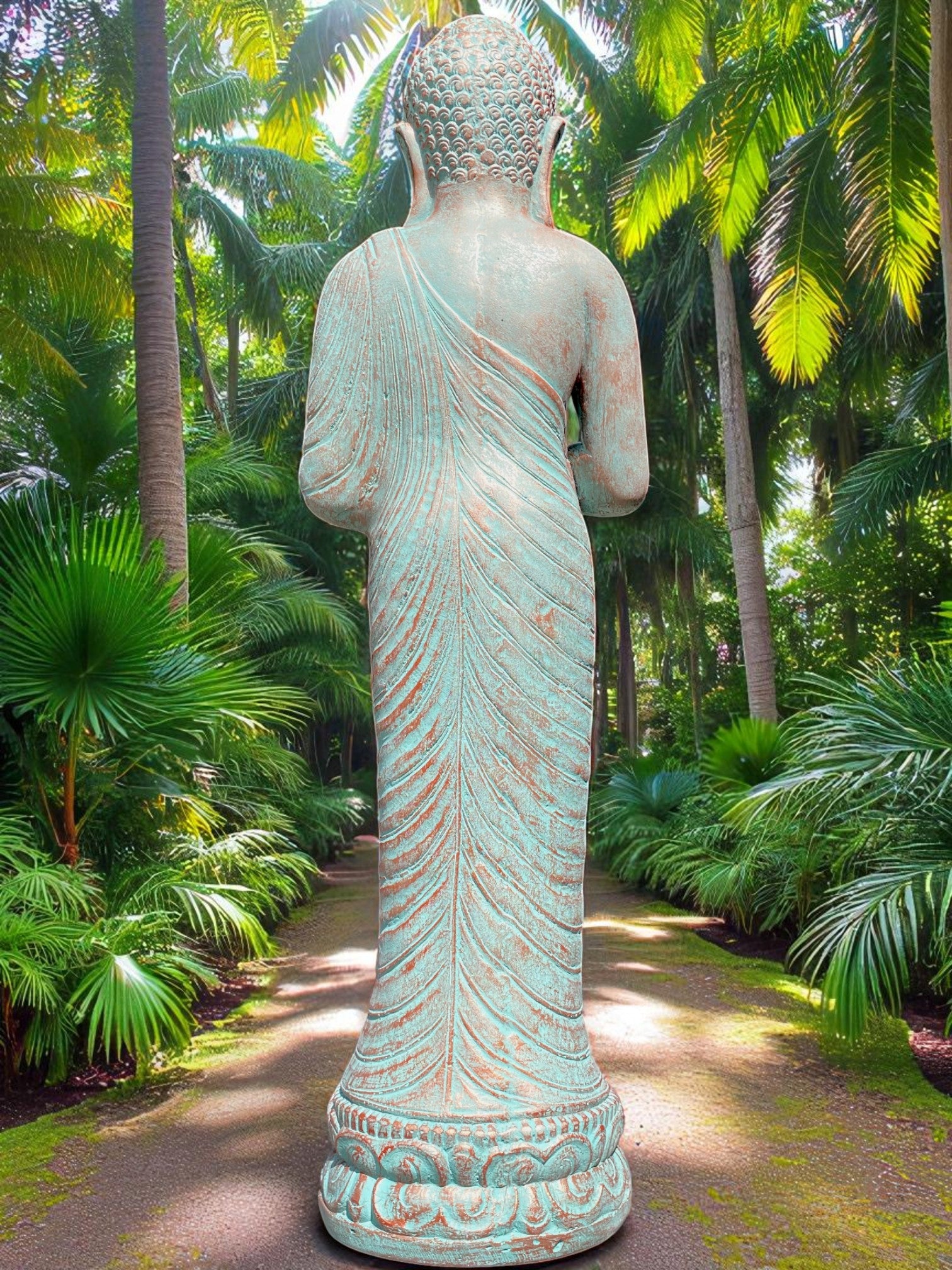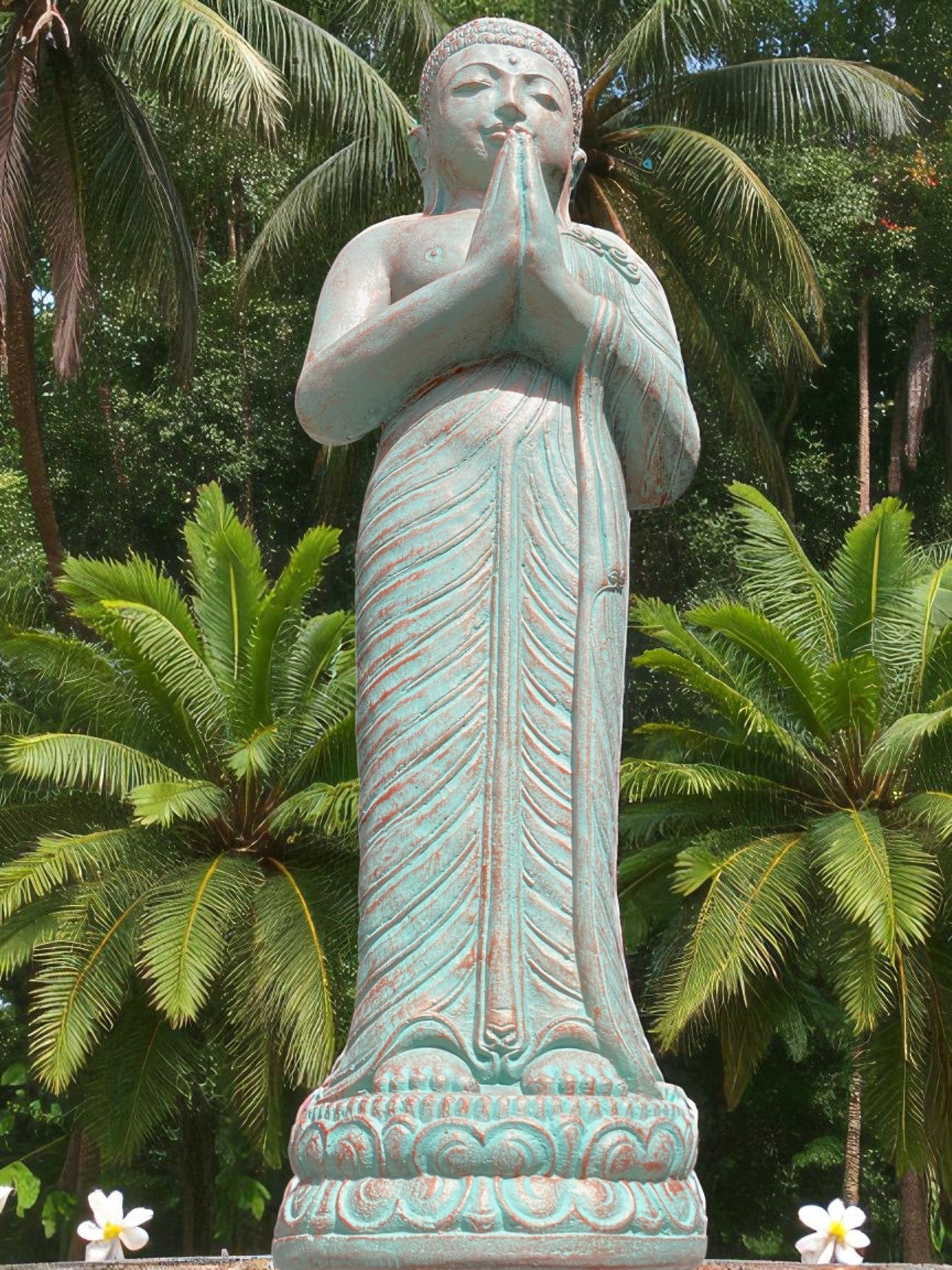 Praying Balinese Buddha statue in a stunning copper green colour. Crafted from concrete, this piece offers the perfect balance of strength, durability, and artistry.