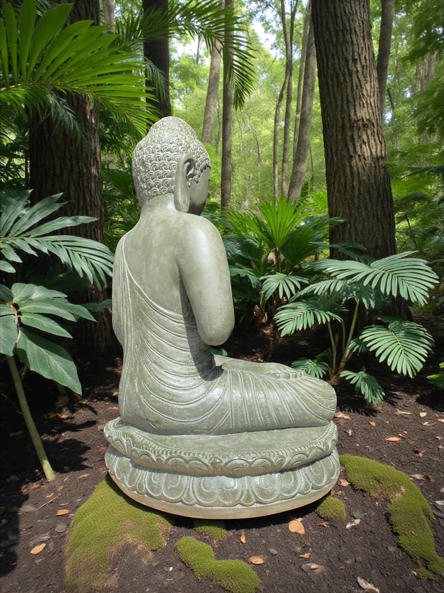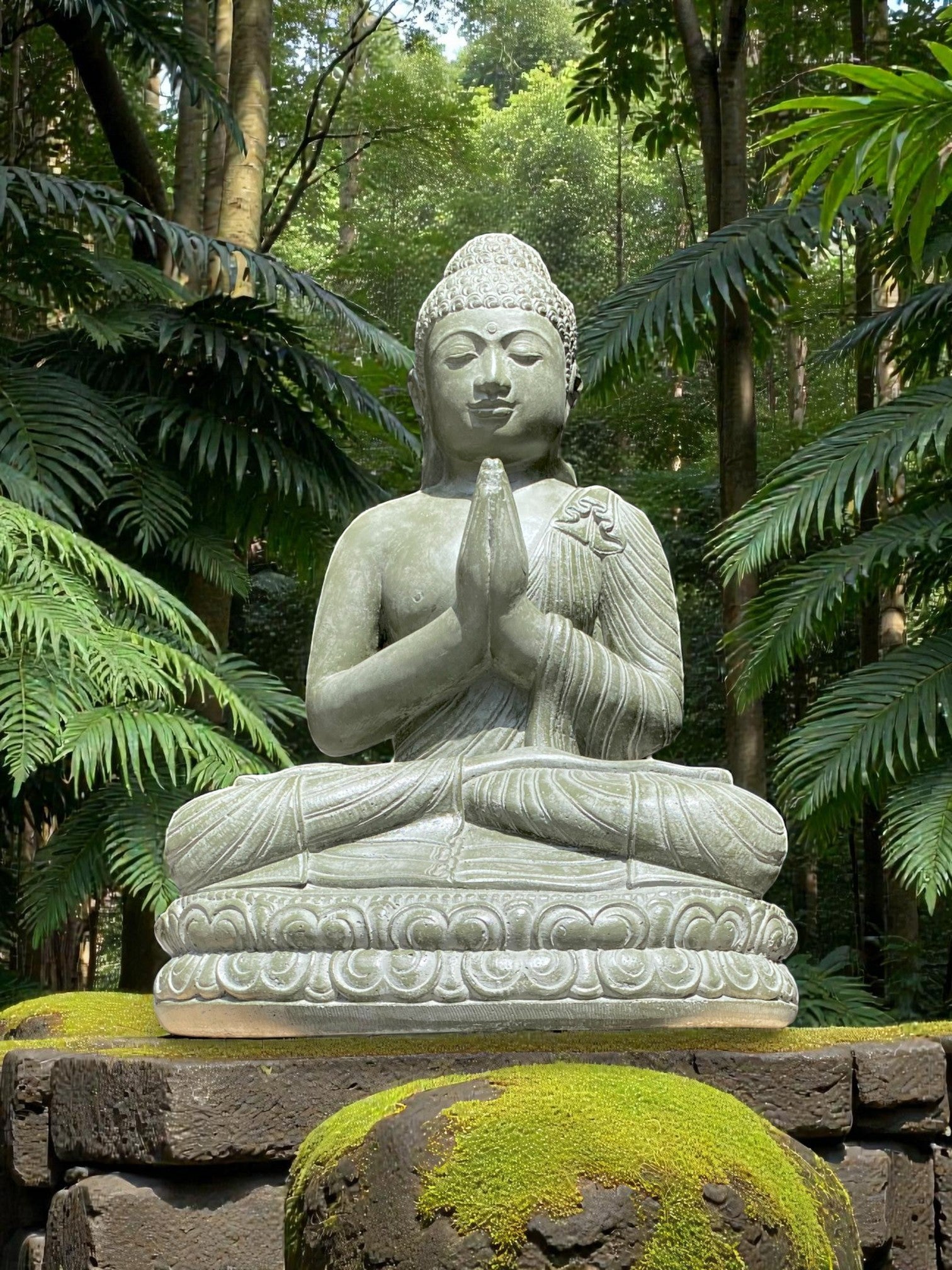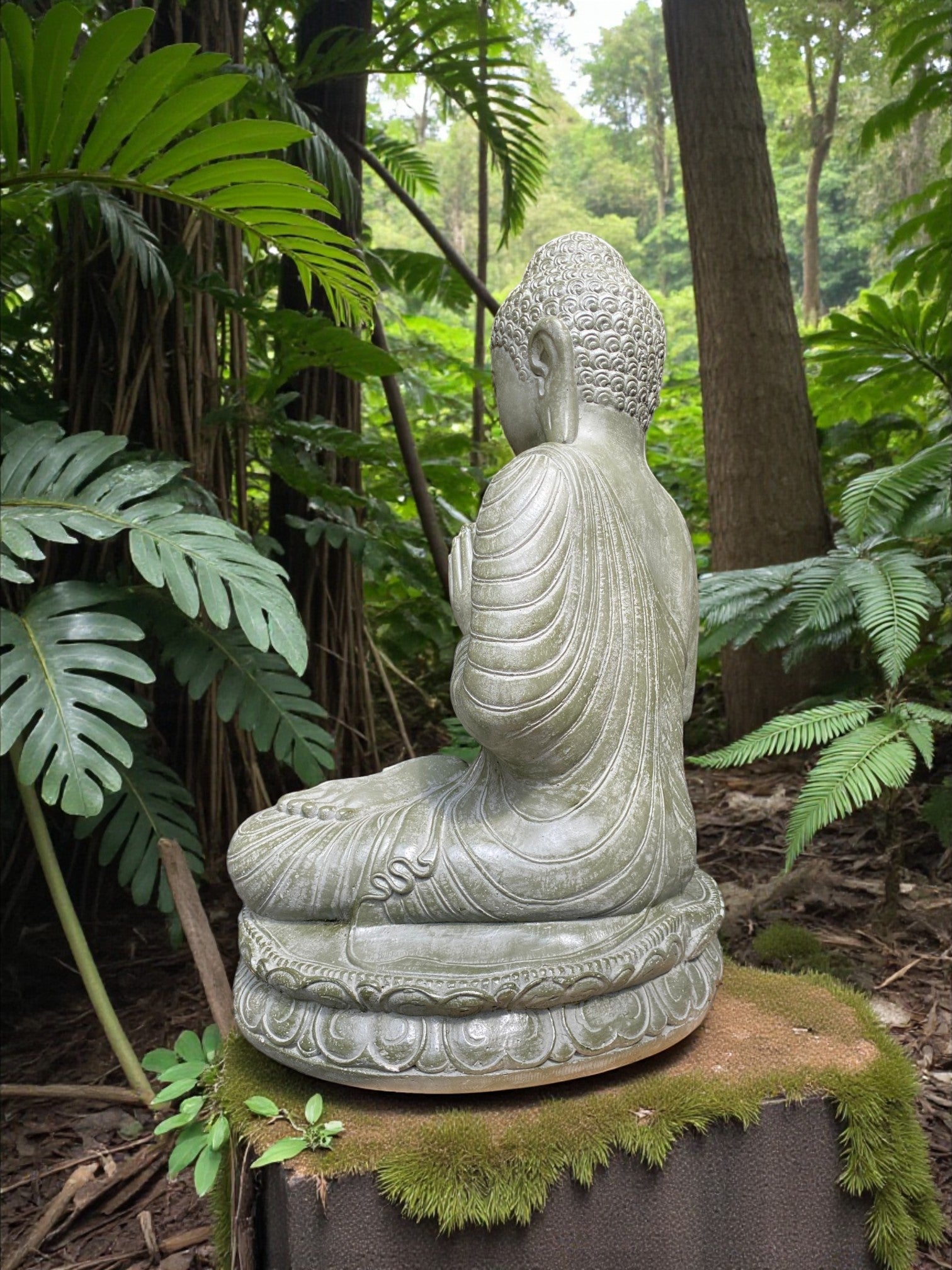 Balinese Praying Buddha statue with front and rear detail. Complement your garden landscaping and Outdoor Living with a Praying or Greeting Buddha Statue . Used by landscape architects for outdoor garden and landscaping projects. This statue fits nicely into any garden. These look great with a warm white night light mounted at the base of the statue facing upwards, creating shadows and ambience and compliments your outdoor furniture and garden landscaping. Upgrade your garden and landscaping and add value to your home and garden renovation. Solid Concrete is great cost effective alternative option for budget Sensitive projects as opposed to luxury hand carved stone.