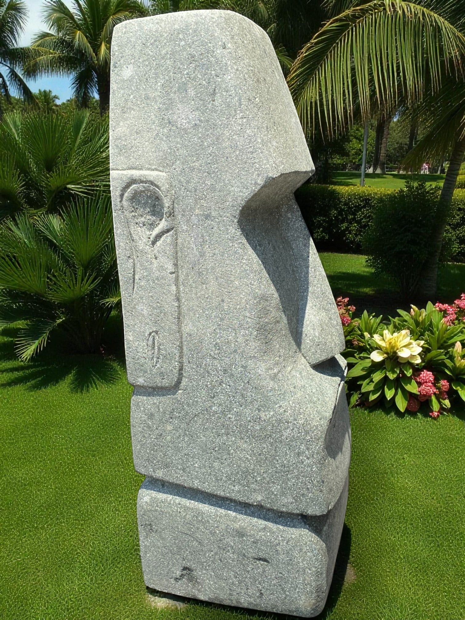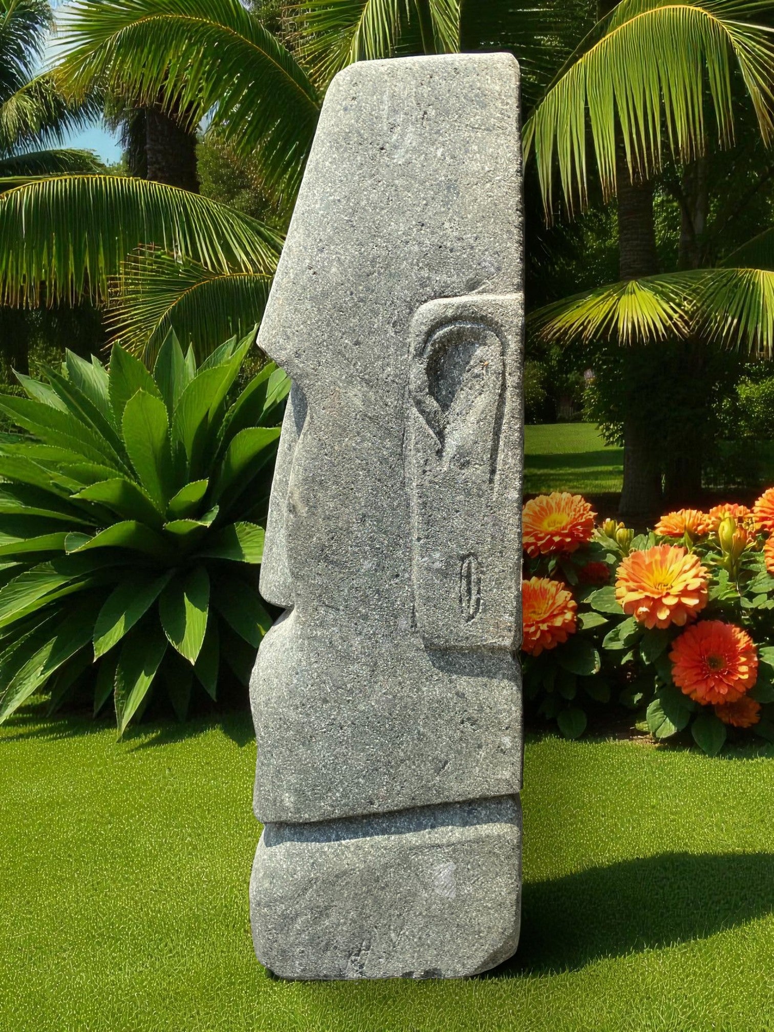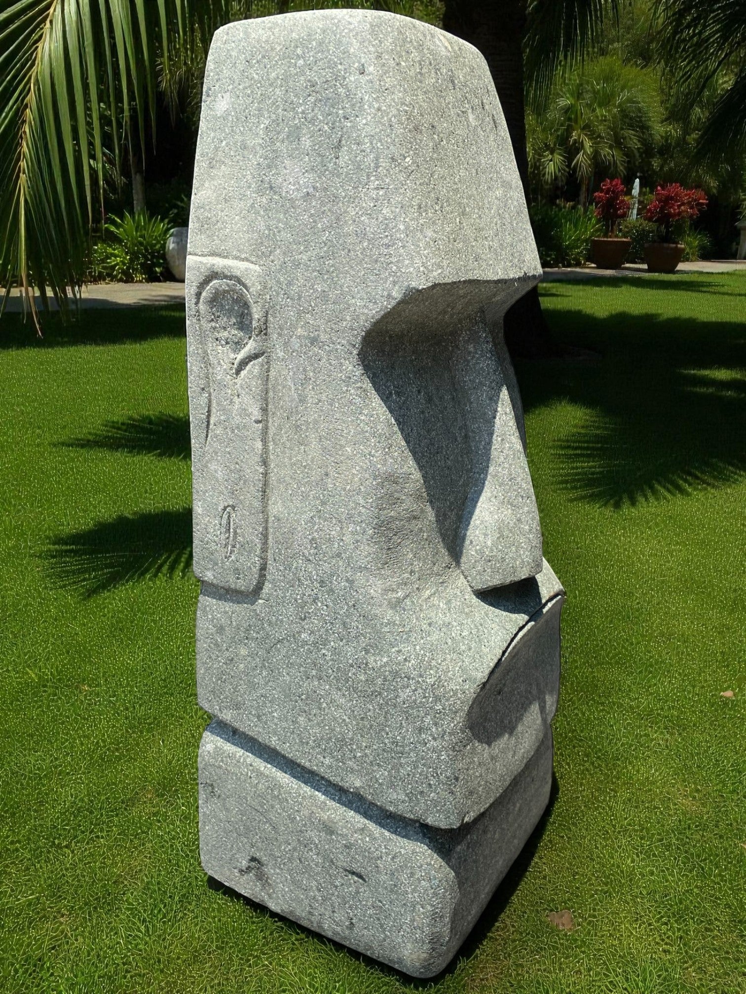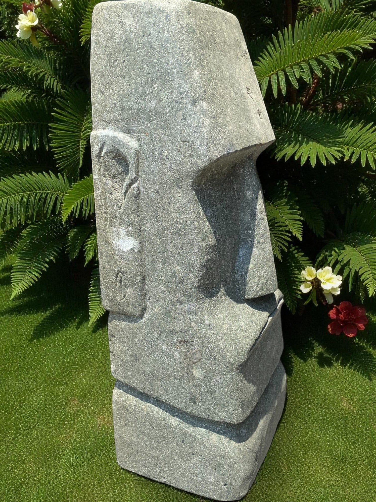 Hand carved Stone Easter Island Rapanui statue. Complement your garden with a hand carved Indonesian garden sculpture hand crafted from Indonesian greenstone. Easter Island is famous for its 887 extant monumental statues, called moai, created by the early Rapa Nui people. These look great with a night light mounted at the base of the statue facing upwards, creating shadows and ambience and compliments your outdoor furniture and garden landscaping.