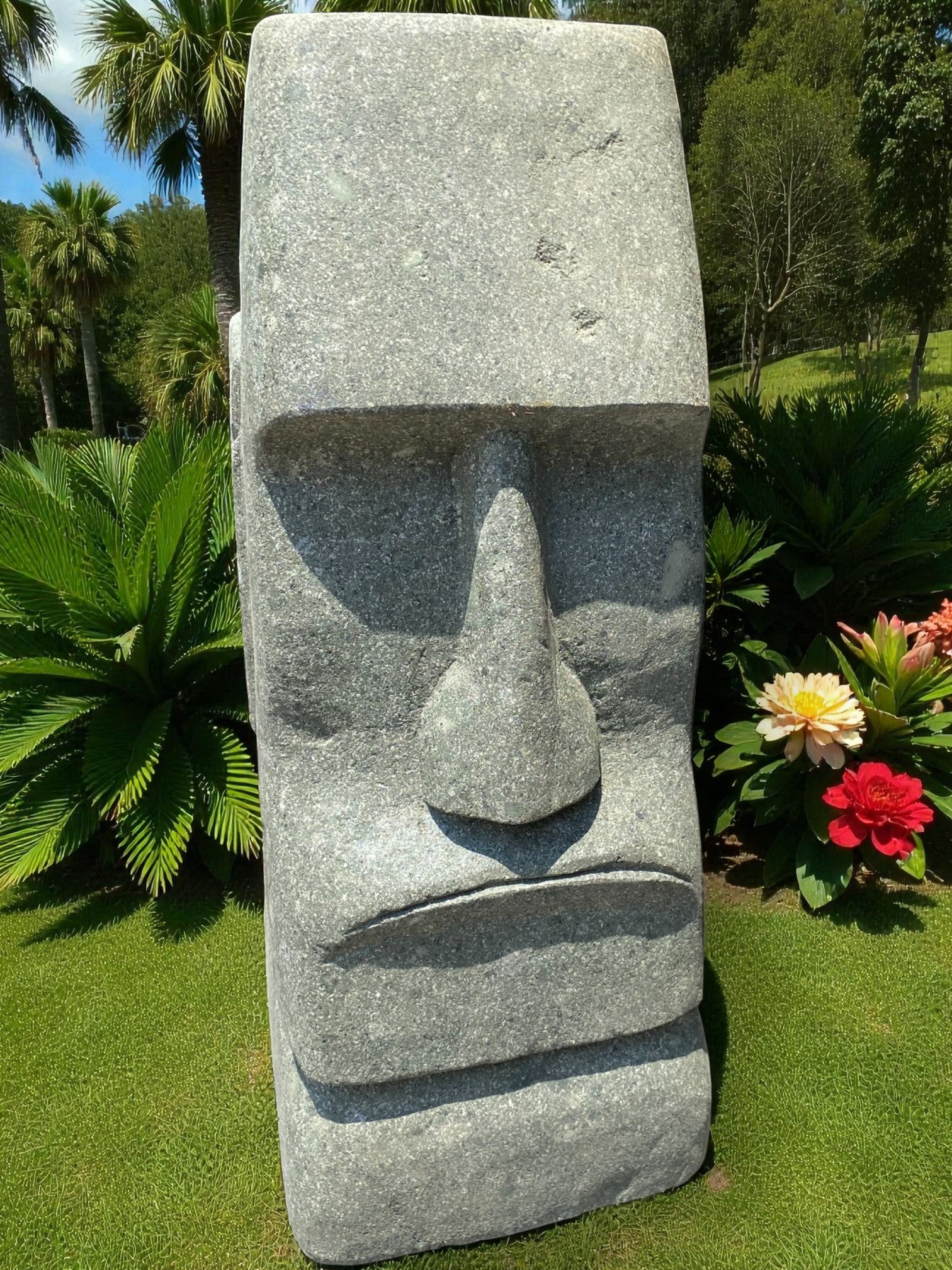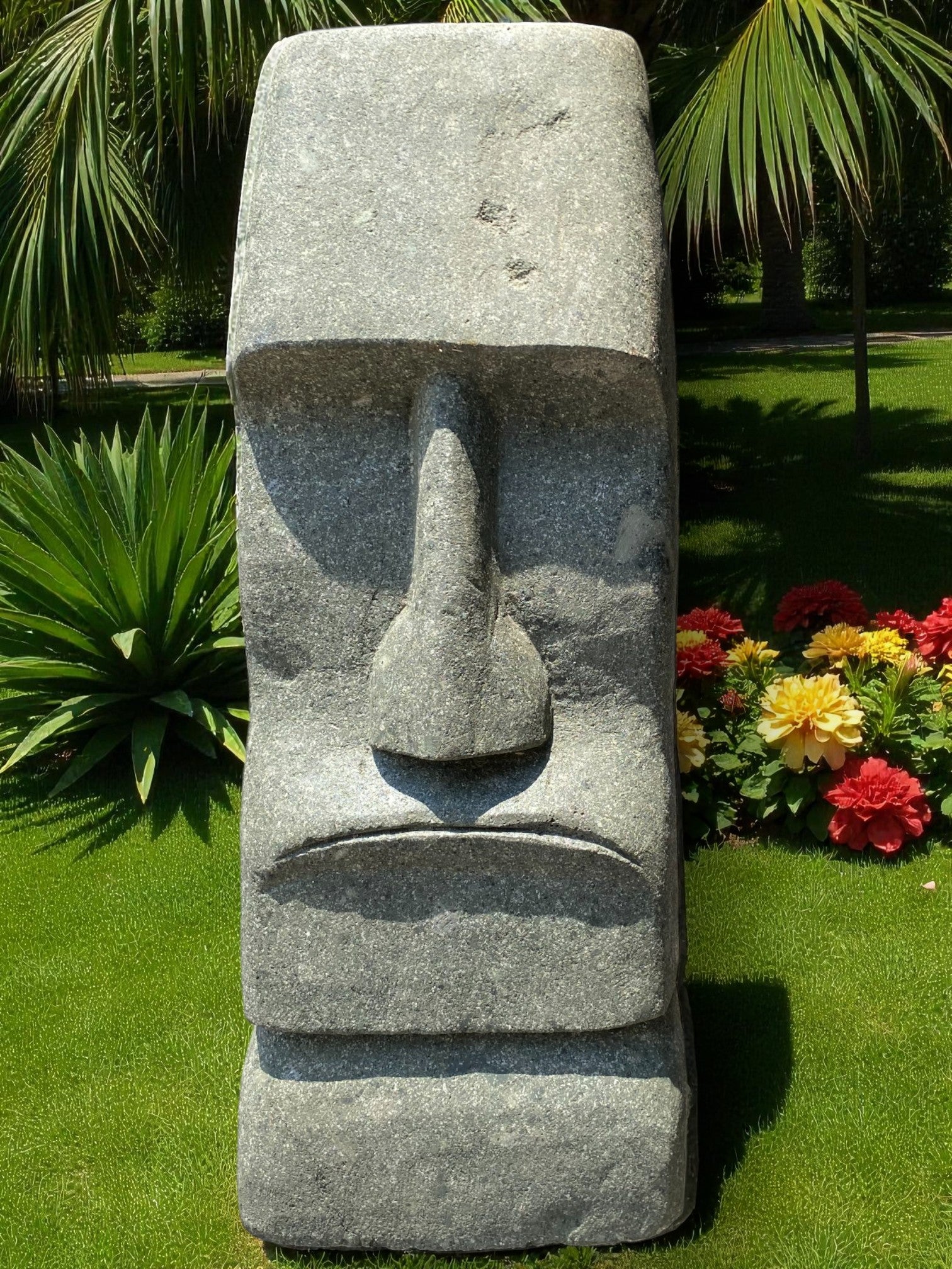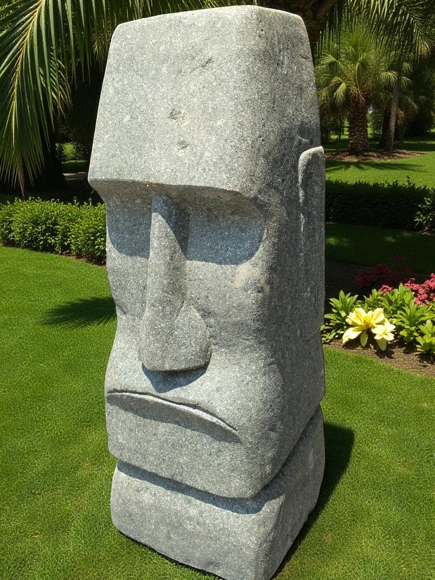 Hand carved Stone Easter Island Rapanui statue. Complement your garden with a hand carved Indonesian garden sculpture hand crafted from Indonesian greenstone. Easter Island is famous for its 887 extant monumental statues, called moai, created by the early Rapa Nui people. These look great with a night light mounted at the base of the statue facing upwards, creating shadows and ambience and compliments your outdoor furniture and garden landscaping.