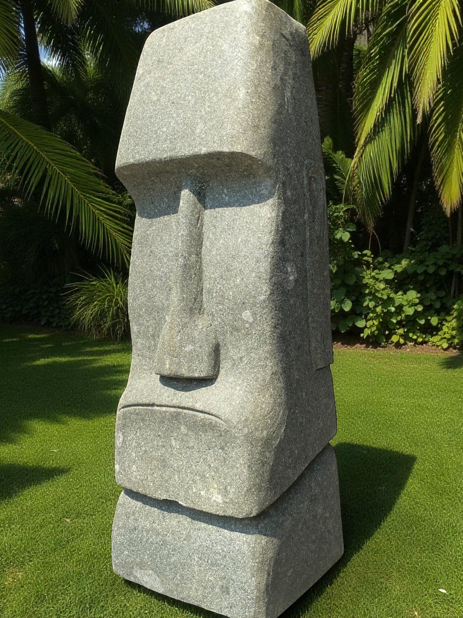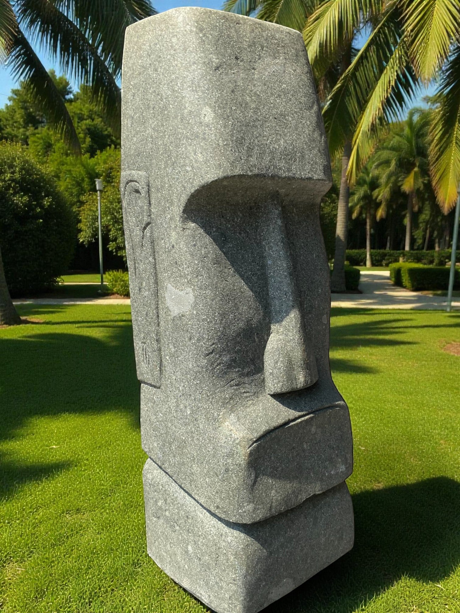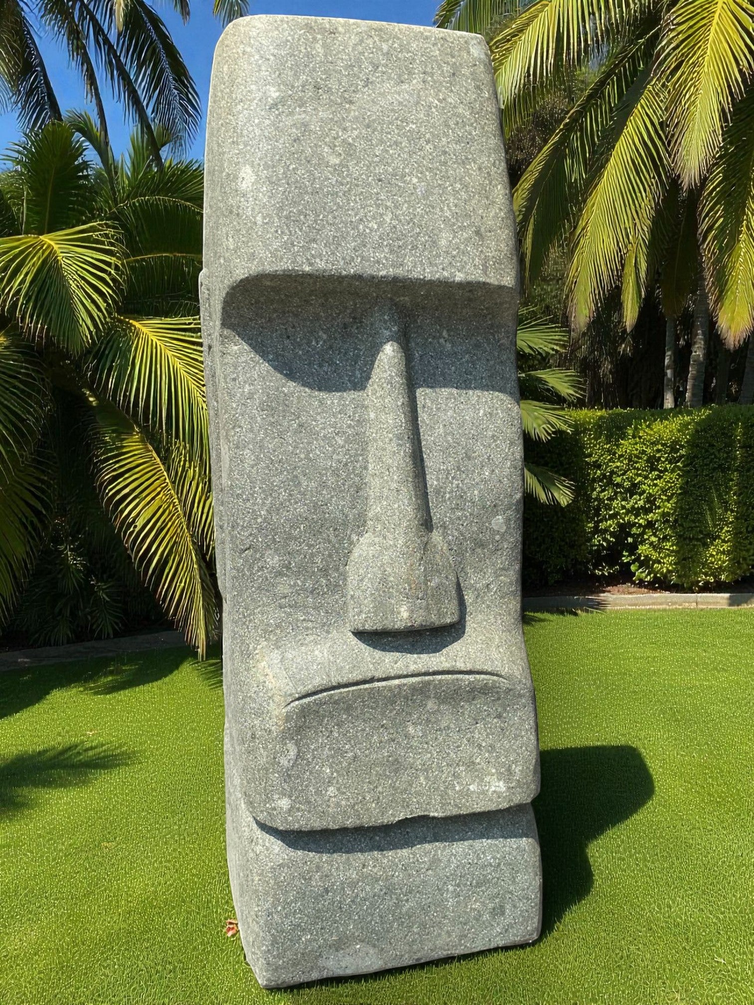 Hand carved Stone Easter Island Rapanui statue. Complement your garden with a hand carved Indonesian garden sculpture hand crafted from Indonesian greenstone. Easter Island is famous for its 887 extant monumental statues, called moai, created by the early Rapa Nui people. These look great with a night light mounted at the base of the statue facing upwards, creating shadows and ambience and compliments your outdoor furniture and garden landscaping.
