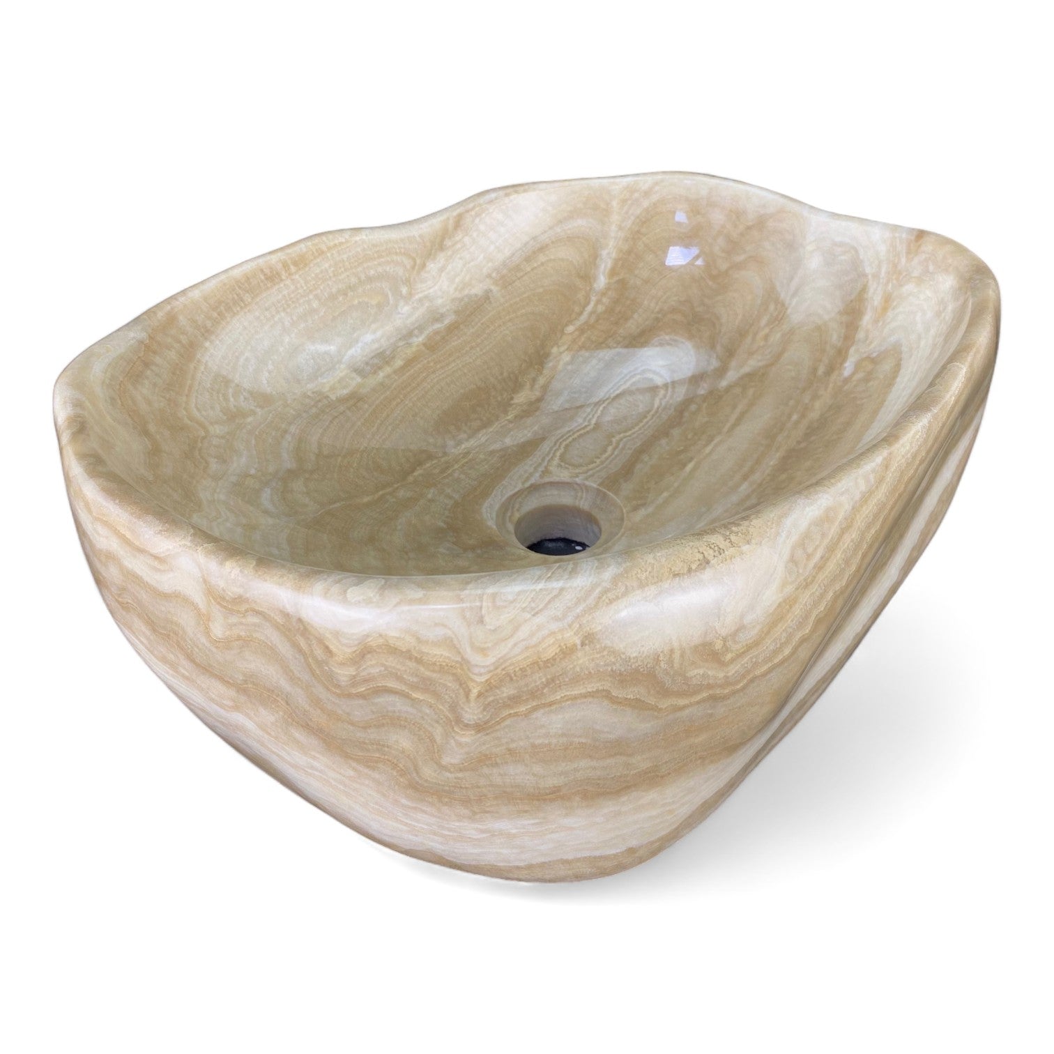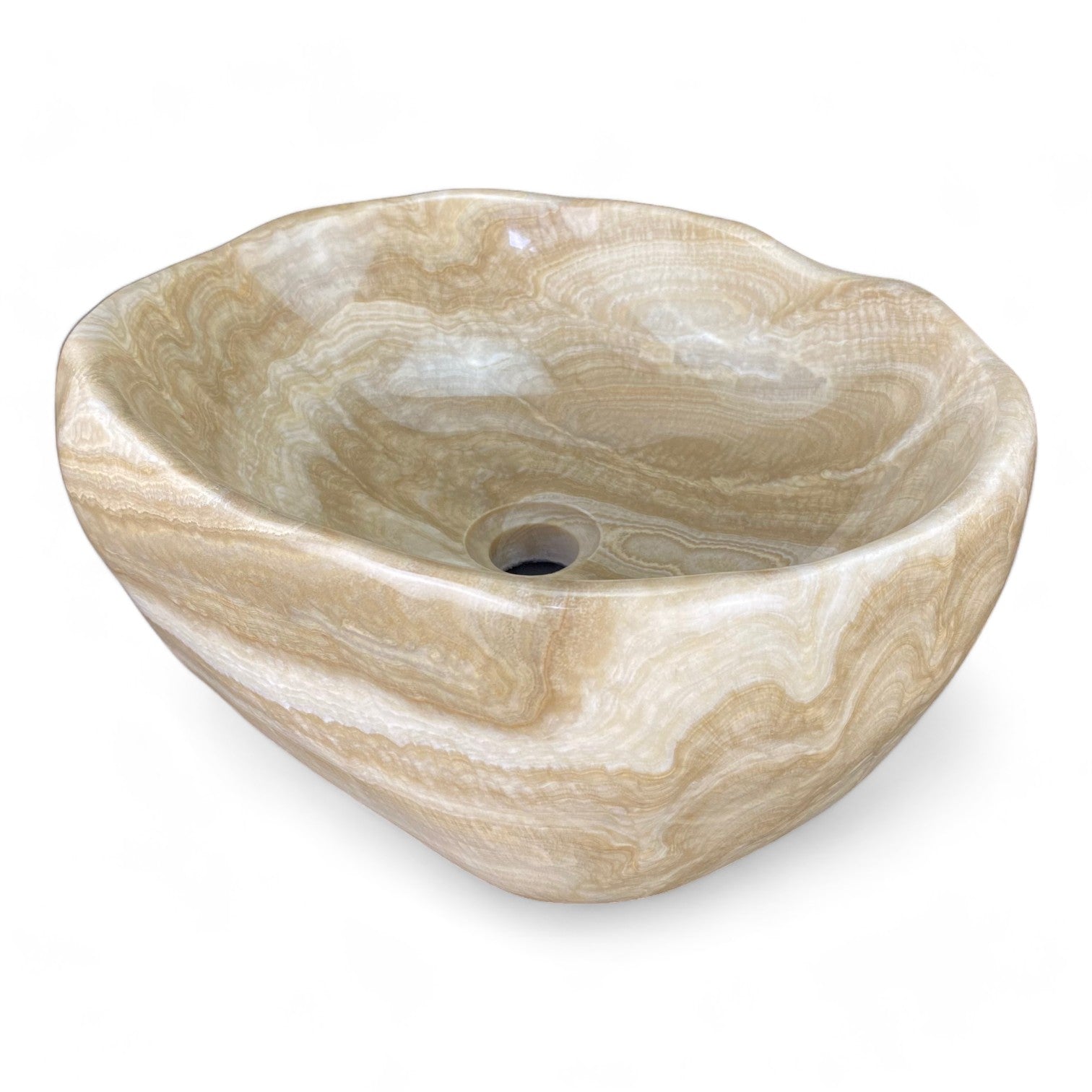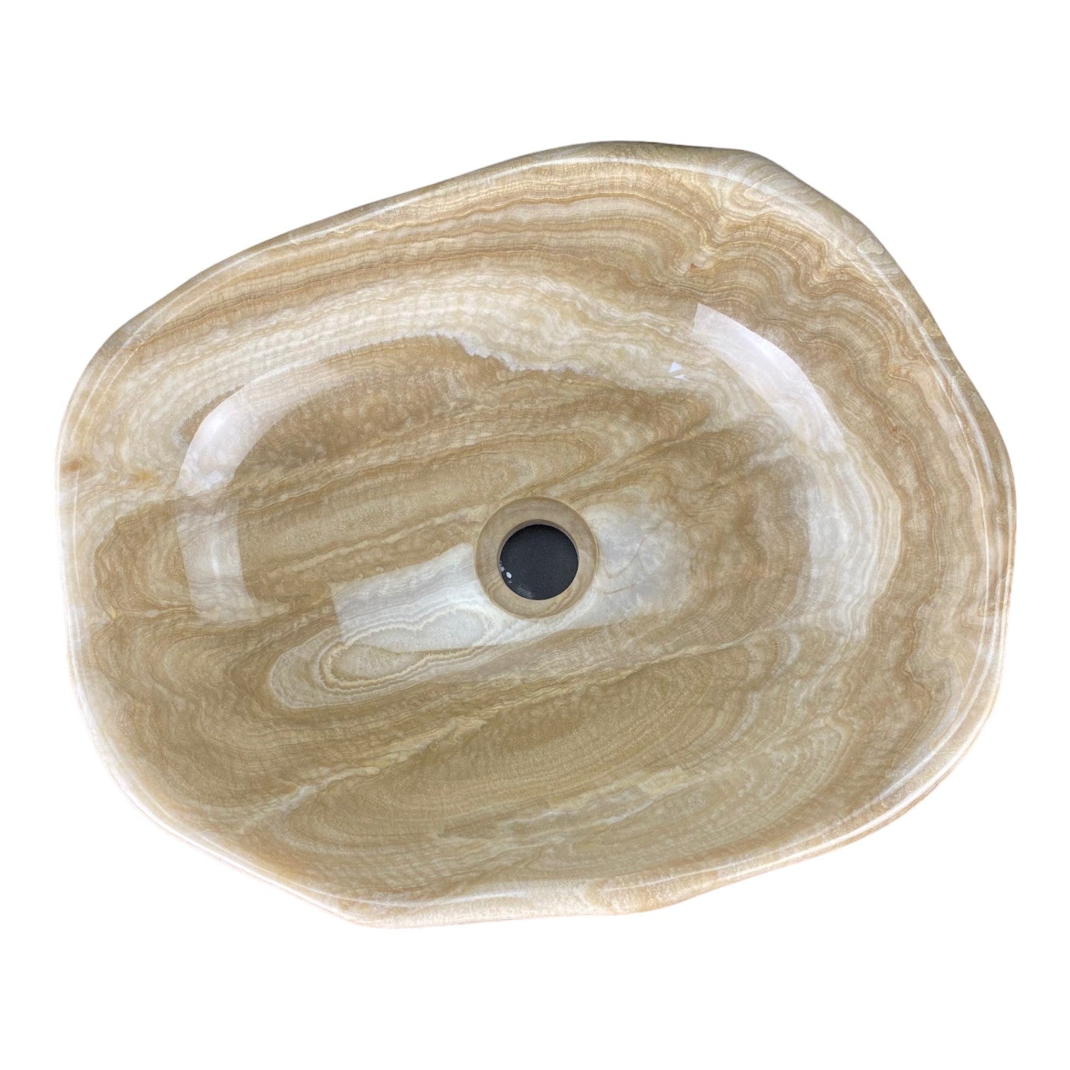 Rare Onyx colour and shape combination, with polished exterior & interior. All of our Onyx Stone bathroom basins require a 32mm Pop up waste without overflow. Complement the StoneBase bathroom Onyx sink with one of our stone bathroom accessories like the Soap & Lotion dispenser or Moisturiser dispenser with Chrome, Copper, Black or Brass look pump, soap dish or toothbrush / toothpaste holder to finish. StoneBase vessel basins are perfect for standard size bathroom or toilet or powder room spaces, offering both practicality and aesthetic appeal. It's always best practice to check our measurements to see if these work with your space requirements