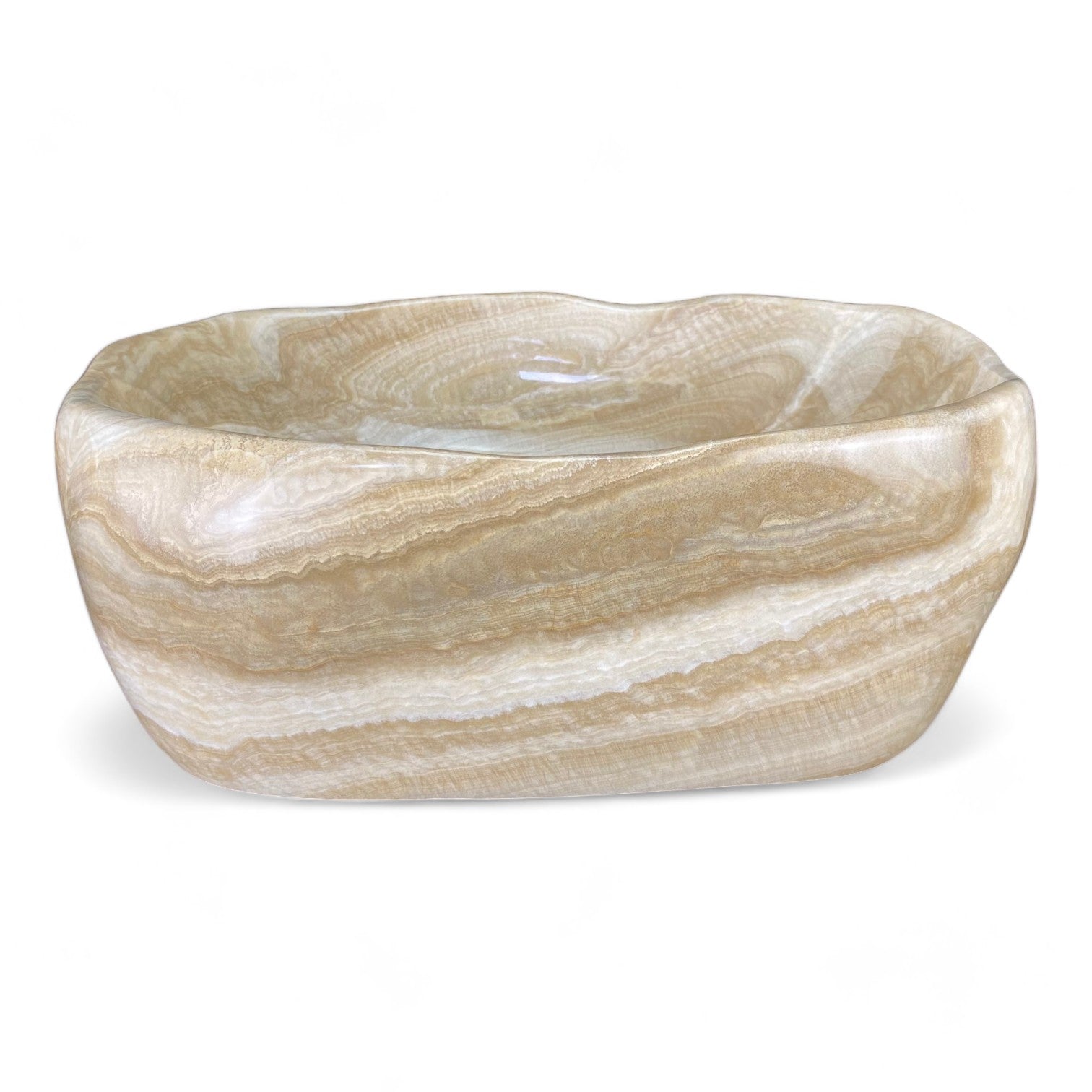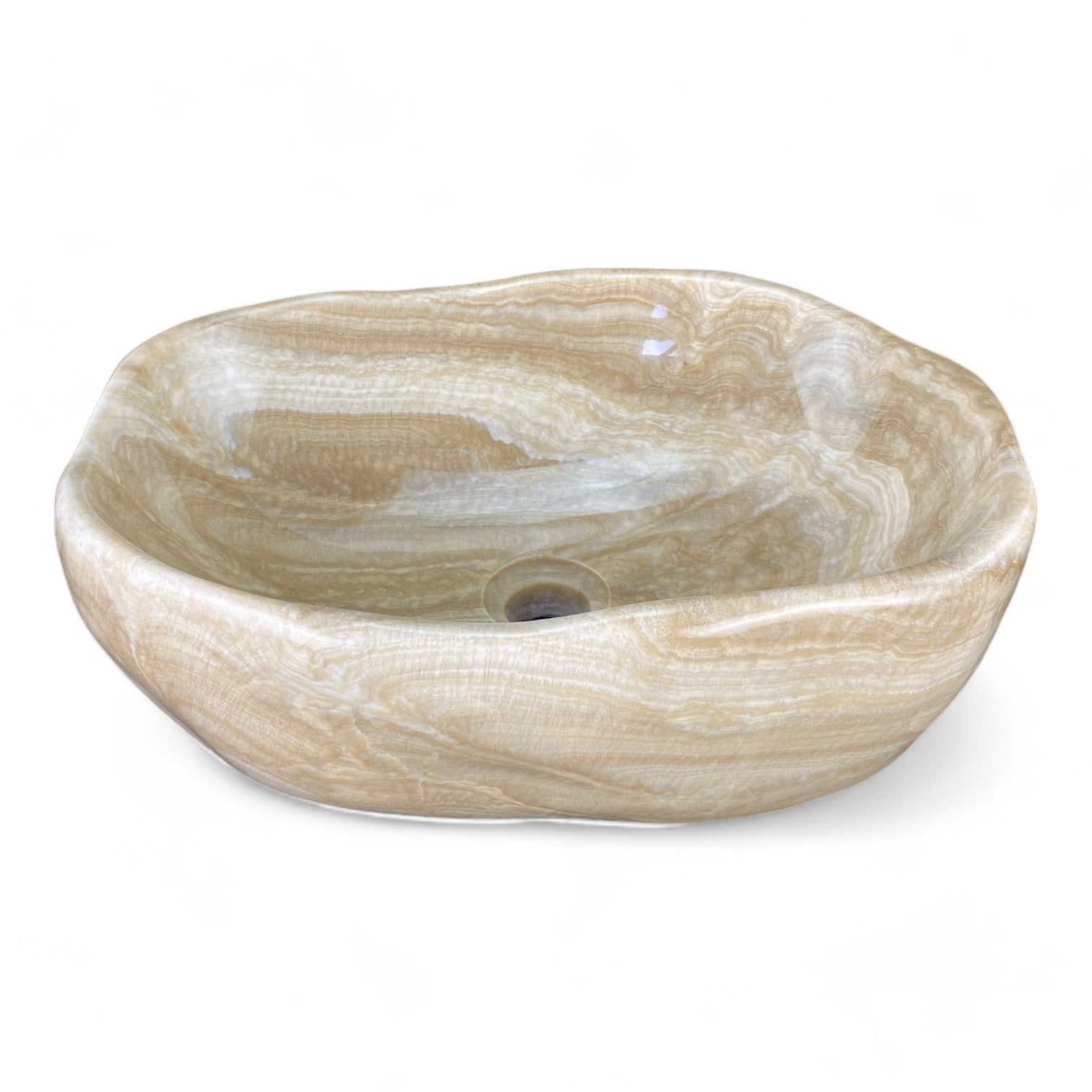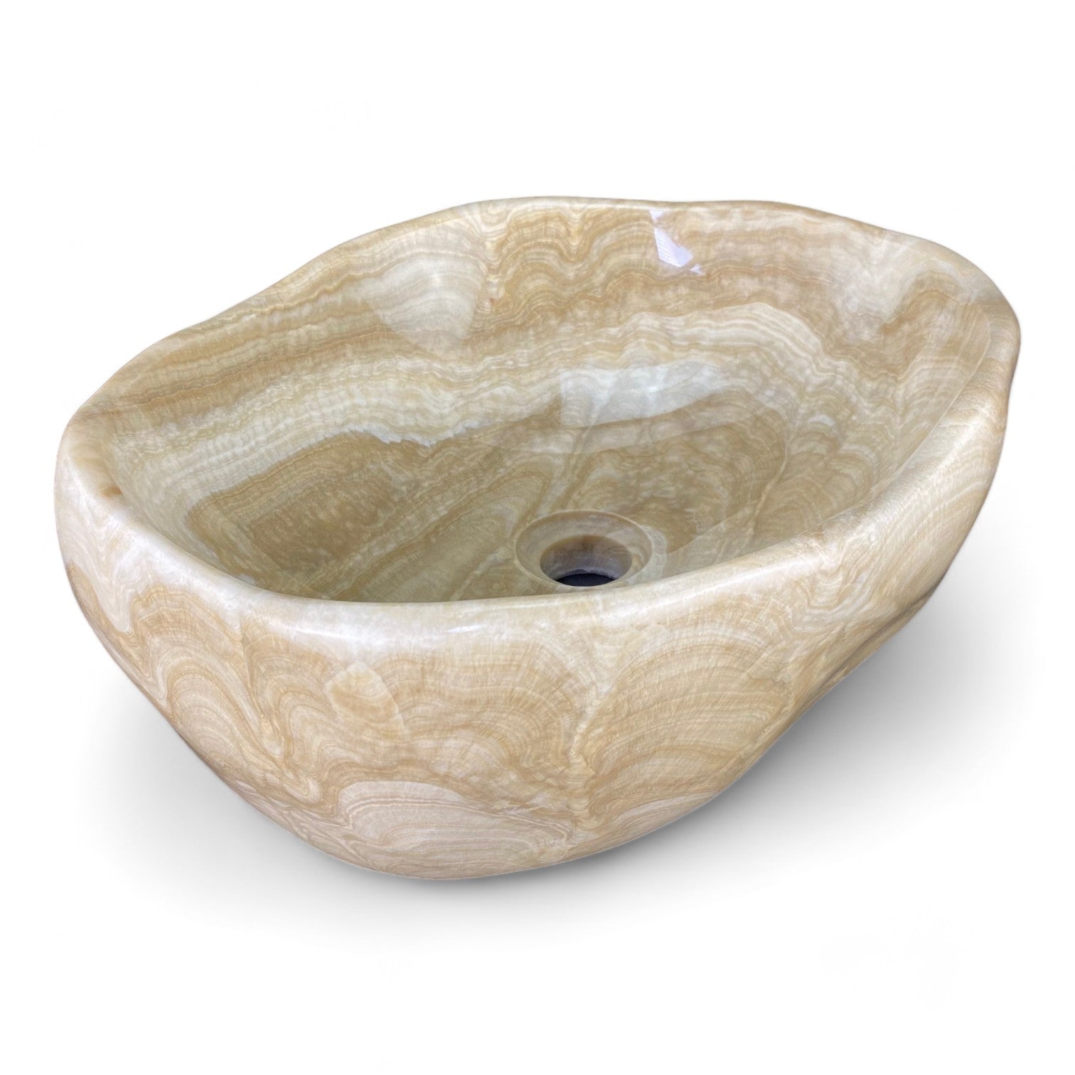 Rare Onyx colour and shape combination, with polished exterior & interior. All of our Onyx Stone bathroom basins require a 32mm Pop up waste without overflow. Complement the StoneBase bathroom Onyx sink with one of our stone bathroom accessories like the Soap & Lotion dispenser or Moisturiser dispenser with Chrome, Copper, Black or Brass look pump, soap dish or toothbrush / toothpaste holder to finish. StoneBase vessel basins are perfect for standard size bathroom or toilet or powder room spaces, offering both practicality and aesthetic appeal. It's always best practice to check our measurements to see if these work with your space requirements